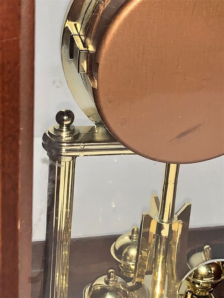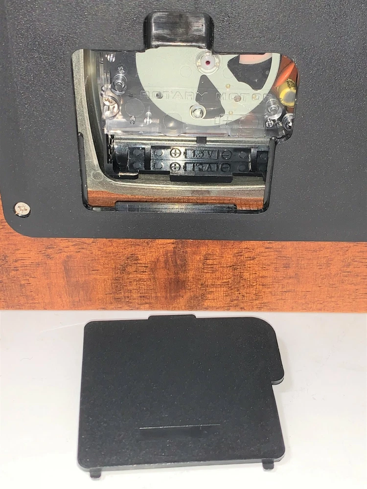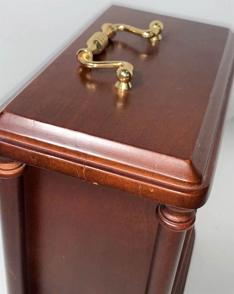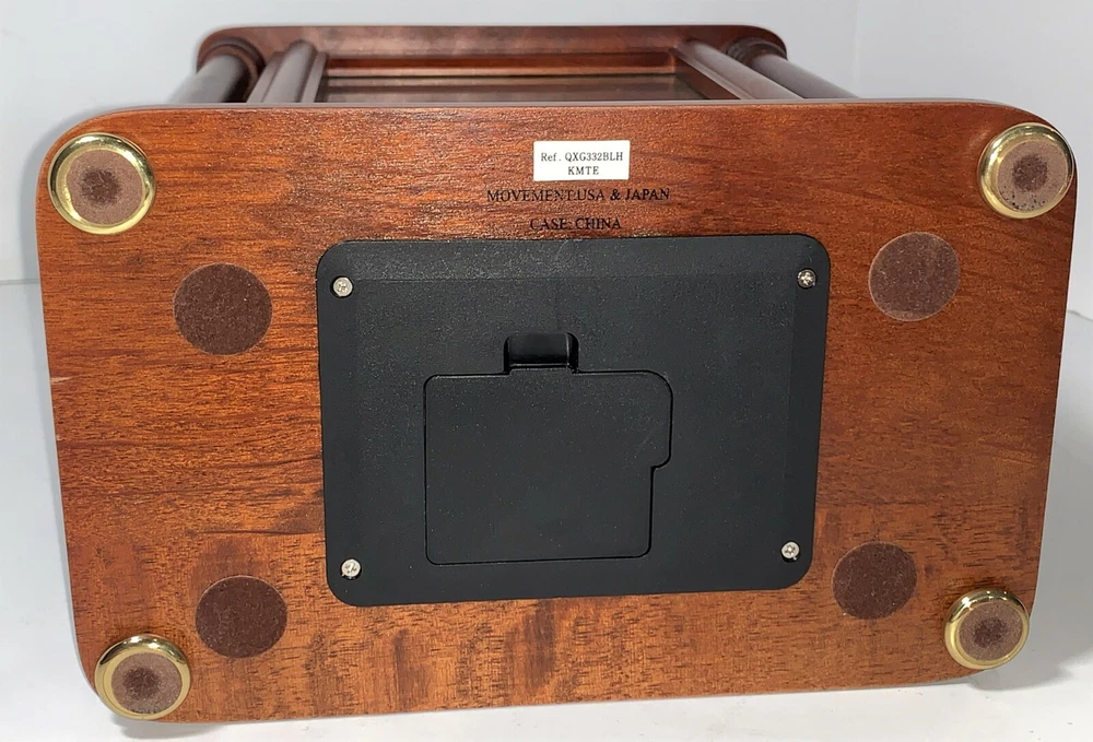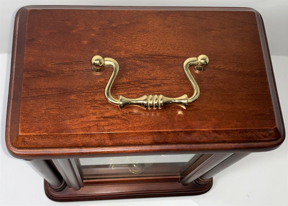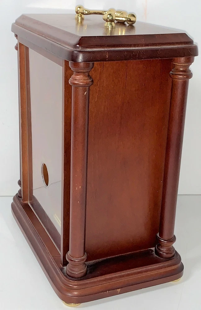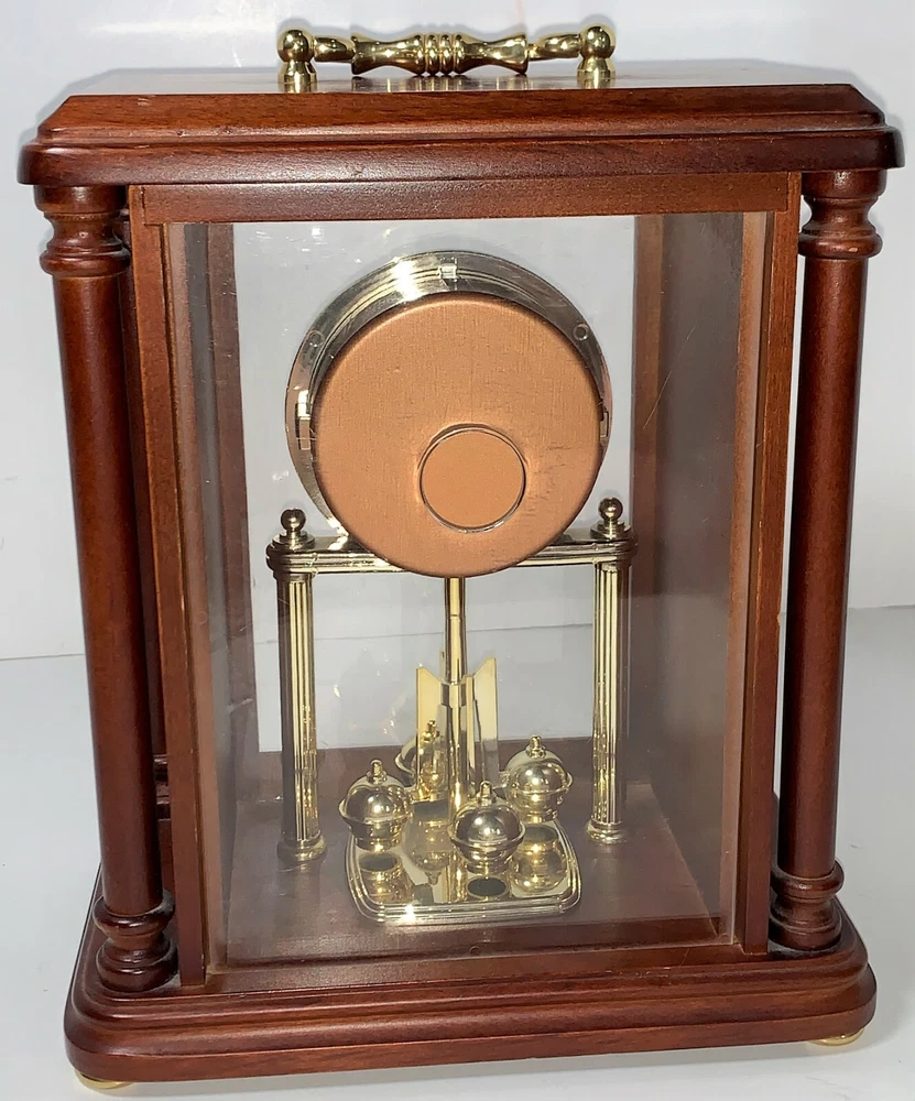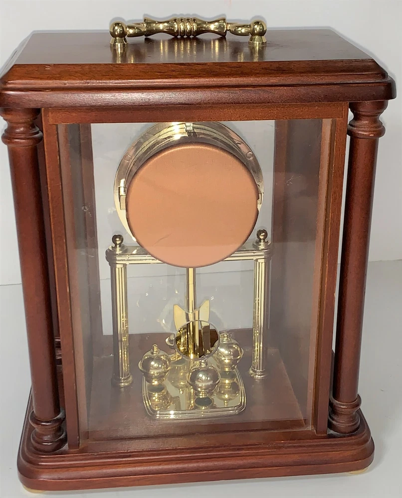 Vintage Seiko Model# QXG332BLH Rotating Pendulum 10" Wooden Carriage With Gold-Toned Hardware Mantel Clock. Measures: 10" H (12" W/handle) x 8" W x 5" D. USA & Japan Movement. 2 - AA Battery operated, AA batteries not included. Wooden carriage with gold-toned hardware/handle, glass front, and plastic back.