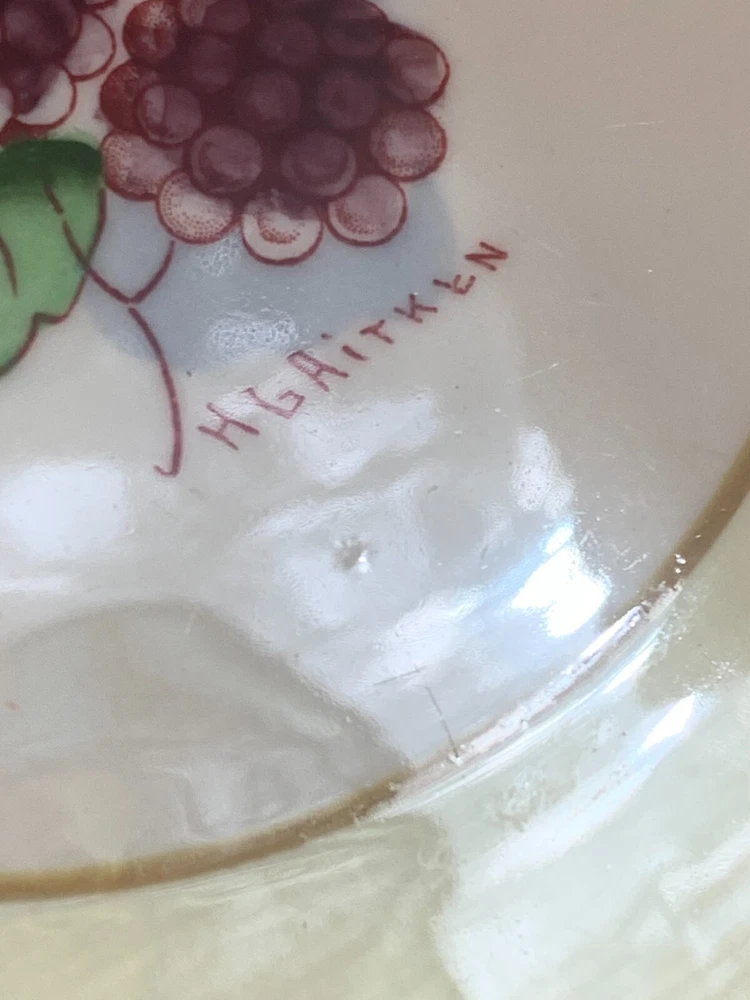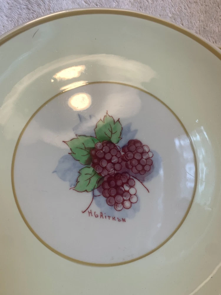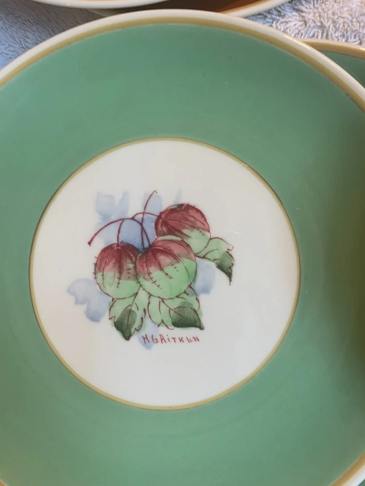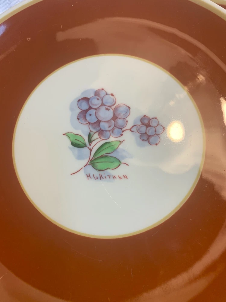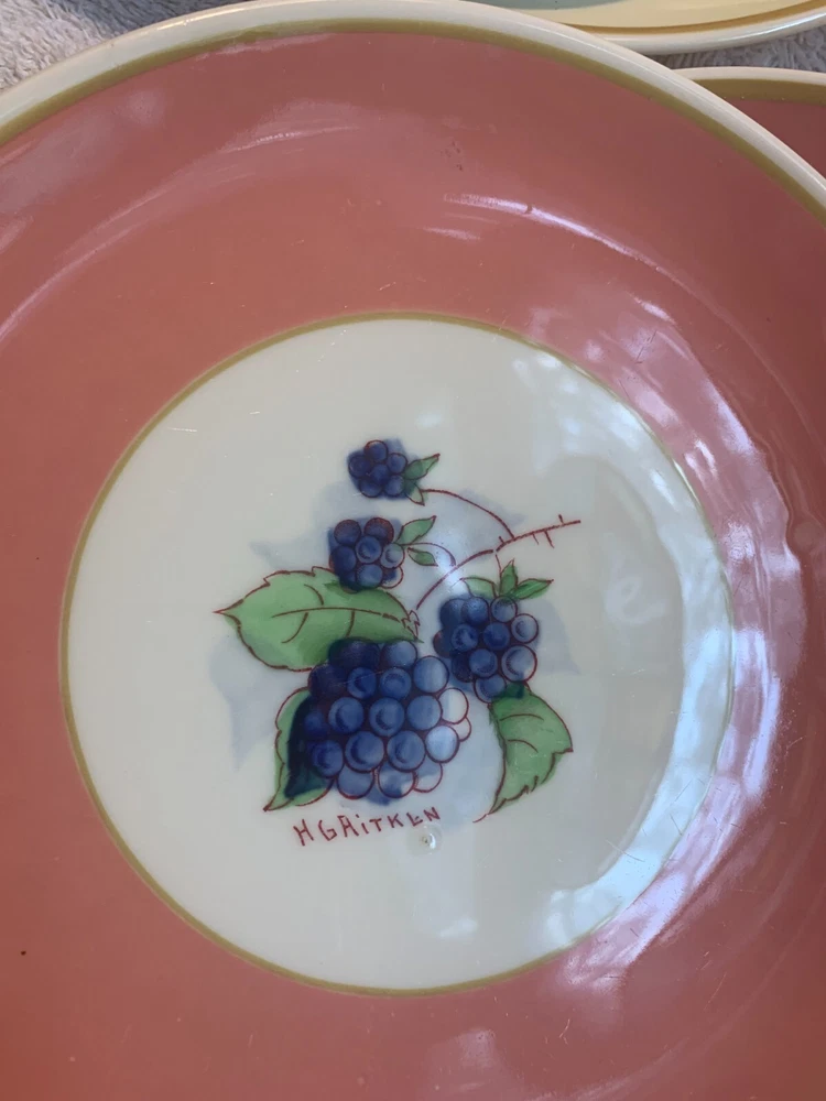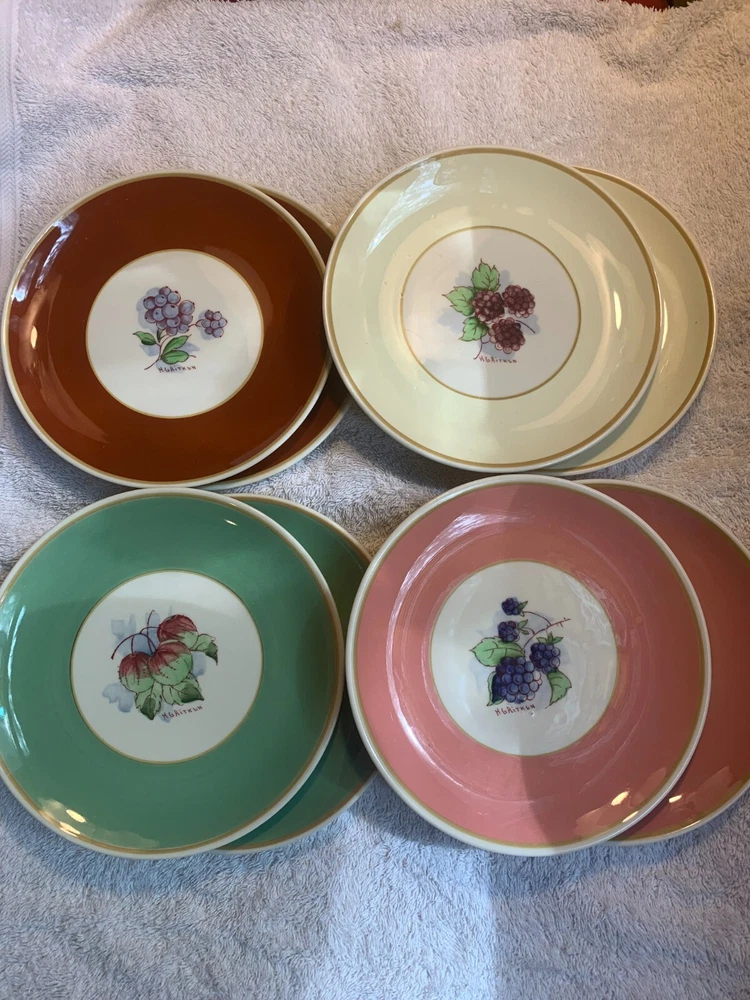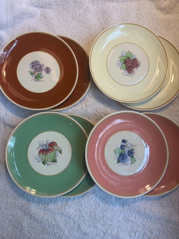 Wonderful set of 8 Vintage Syracuse China HG Aitken Dessert Plates! excellent condition- please expect a glaze pop or 2 on them -- see photos- these were made in 1941, and this is normal restaurant/ hotel ware of the era they have been lightly used these are a few very light knife market on some of them no stains, cracks or chips 4 different colors There are 2 of each color The pattern on the plates is of fruit, berries, etc.