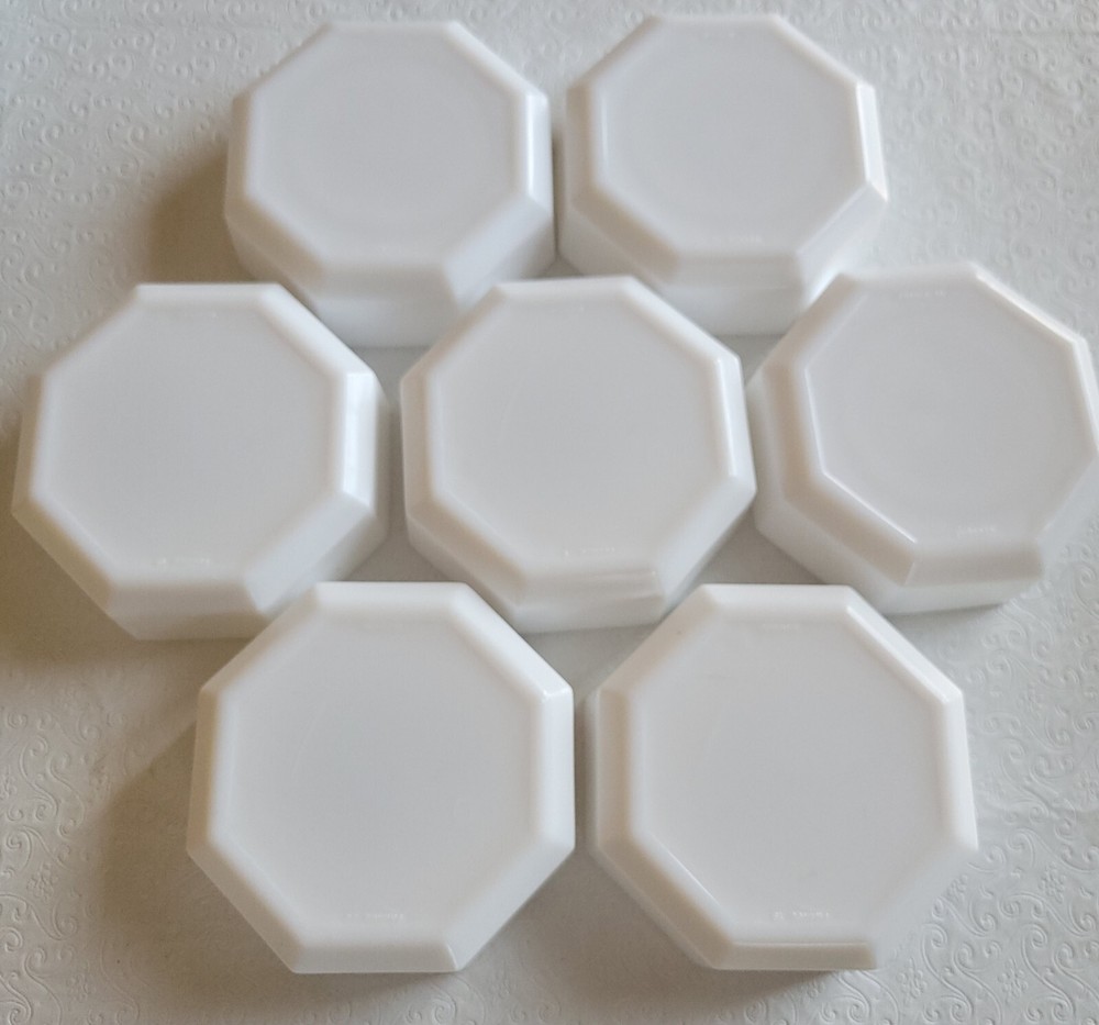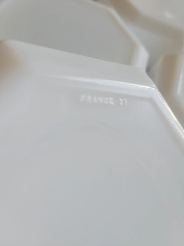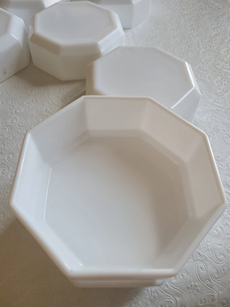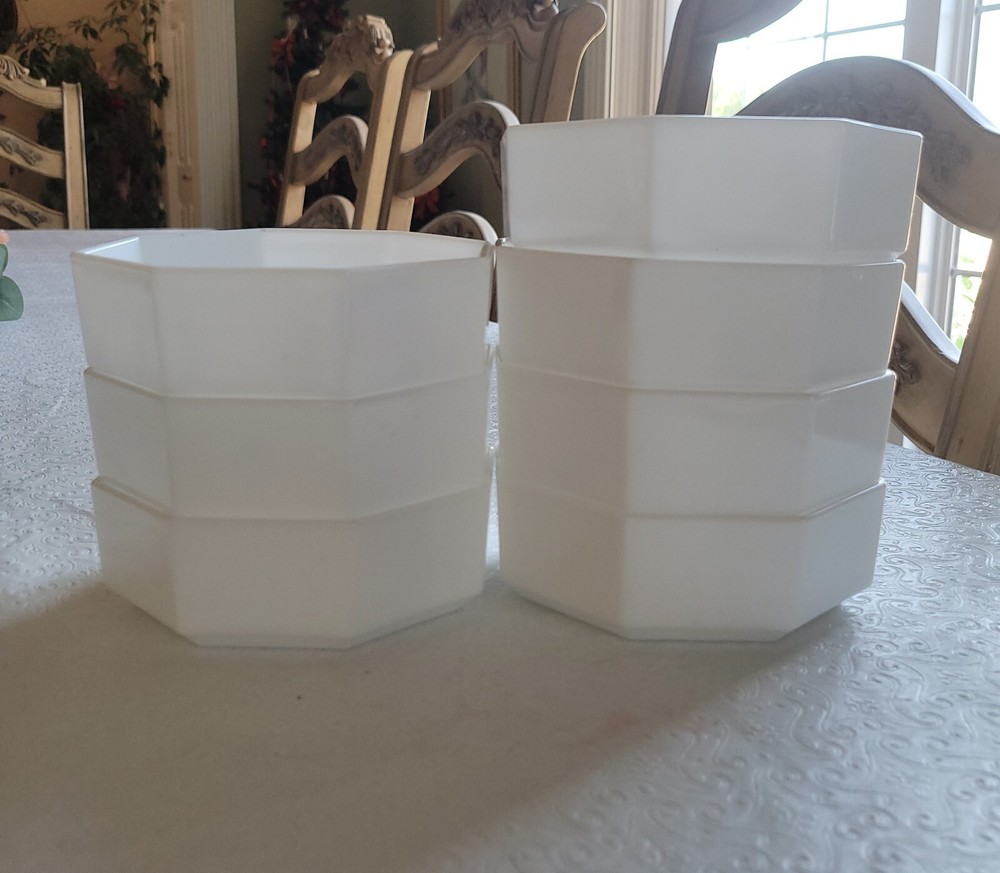 Enhance your dining experience with this vintage seven-piece bowl set from Arcoroc. The white milk glass bowls feature a geometric shape and a glossy finish that complement any table setting. Measuring six inches in diameter and one and a half inches in height, these bowls are perfect for serving salads, fruits, or desserts. The set includes six bowls and is impressed with the Arcoroc backstamp, which adds a touch of elegance to your tableware collection. Made in France during the 1980s, these bowls are a perfect addition to your decorative cookware, dinnerware, and serveware. No damage has been noted. E-mail me with questions. Thanks for checking out my auctions!