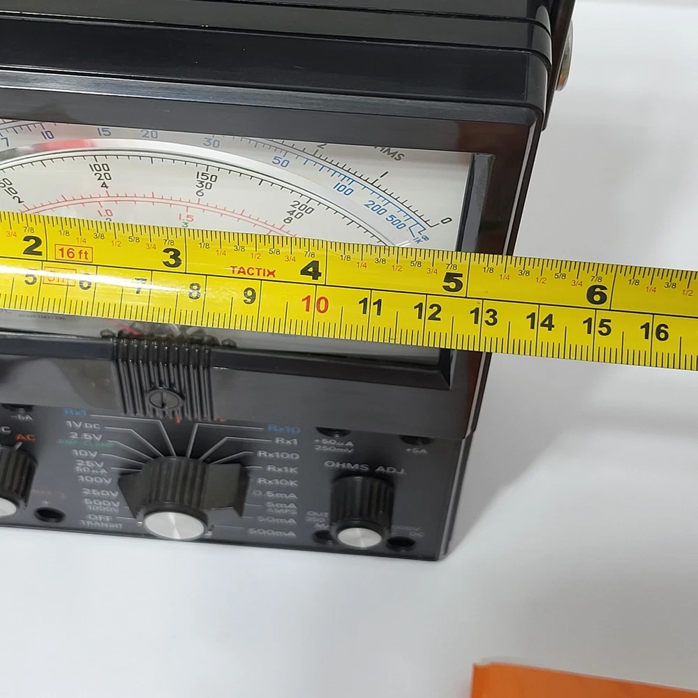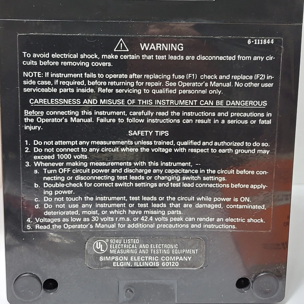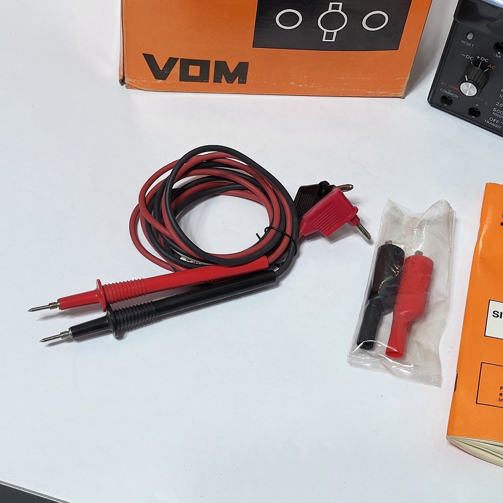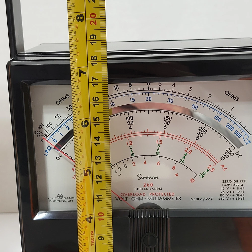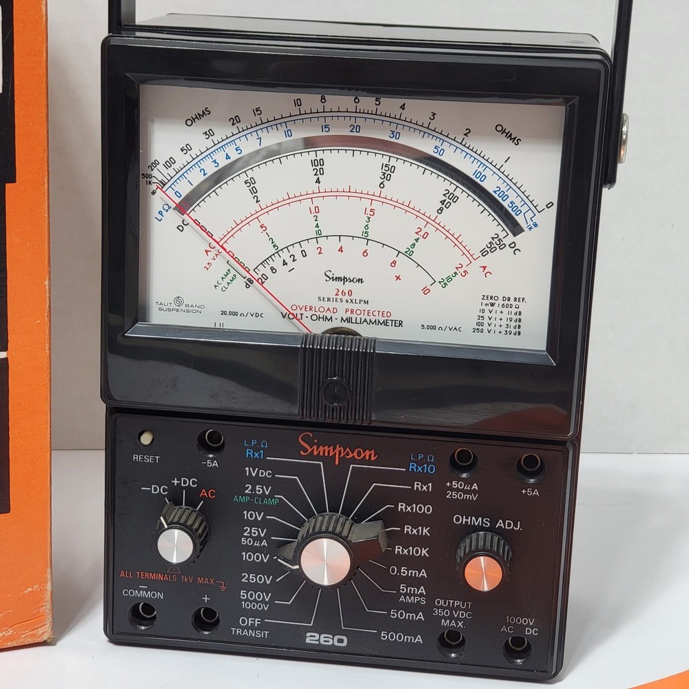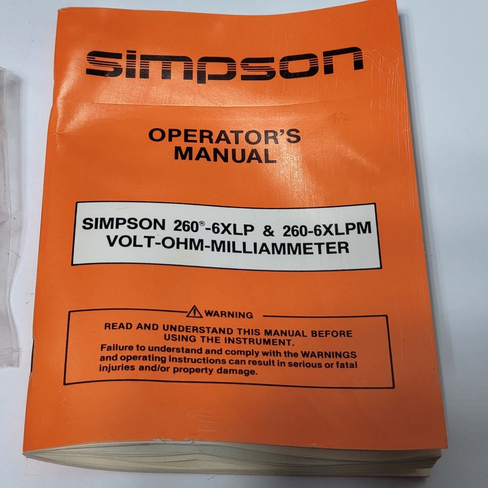 Simpson 260 Series 6XLPM Volt-Ohm-Milliammeter (VOM) comes complete with its original box, operator's manual, and test leads. This classic analog multimeter features a large, easy-to-read mirrored scale with taut-band suspension for increased durability and accuracy. It includes specialized low-power ohms ranges (LPΩ) and is overload protected, making it a reliable tool for precision electrical testing and troubleshooting. The unit is housed in a rugged black case with a convenient carrying handle, maintaining the high-quality construction Simpson is known for. "The box is bent up on the corners" as seen in the 1st photo. "Tested" Measurements: • Width: 5.25" • Height: 7" Brand: Simpson Model: 260-6XLPM Catalog Number: 12211 Type: Analog Multimeter / VOM Functions: Voltage, Resistance, Current Features: Overload Protected, Taut-Band Suspension, Mirrored Scale Included: Original Box, Manual, Test Leads, Alligator Clips Power Source: Battery (Internal) Case Material: Phenolic / Plastic Display: Analog Needle Scale Type: Multi-scale Mirrored Manufacture Location: USA (Elgin, IL) Color: Black Keywords: Vintage Electronics, Electrical Engineering, Test Equipment, Lab Gear, Analog Meter, Troubleshooting Tool, Industrial, Shop Tool, Technician Gear, Retro Tech, Made in USA, Professional Grade • We ship within one business day. • Please compare the measurements to something you already own. Thank you for supporting our small business!