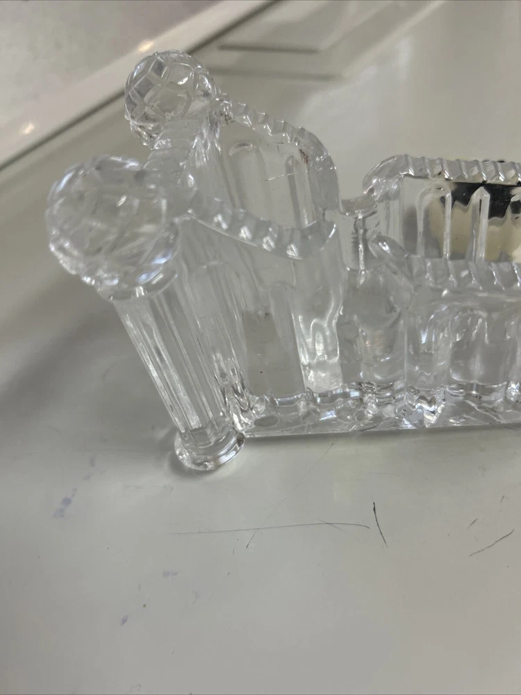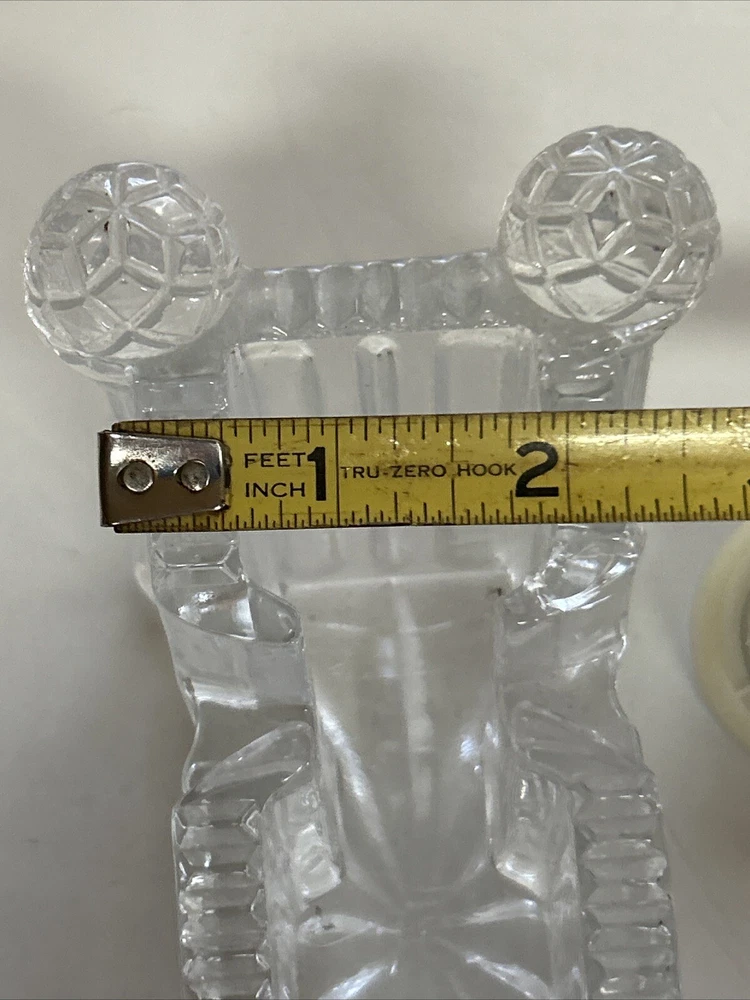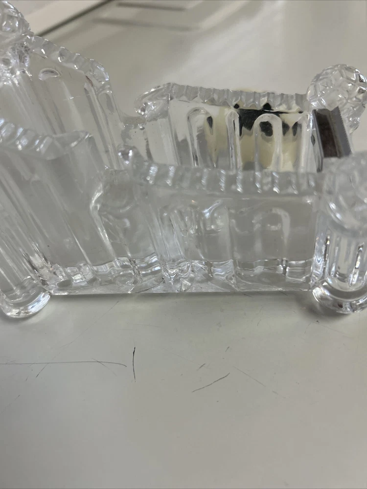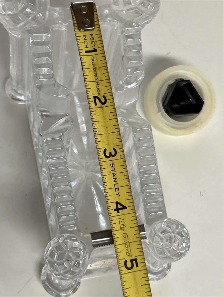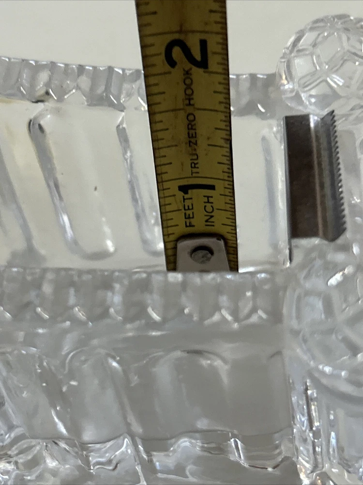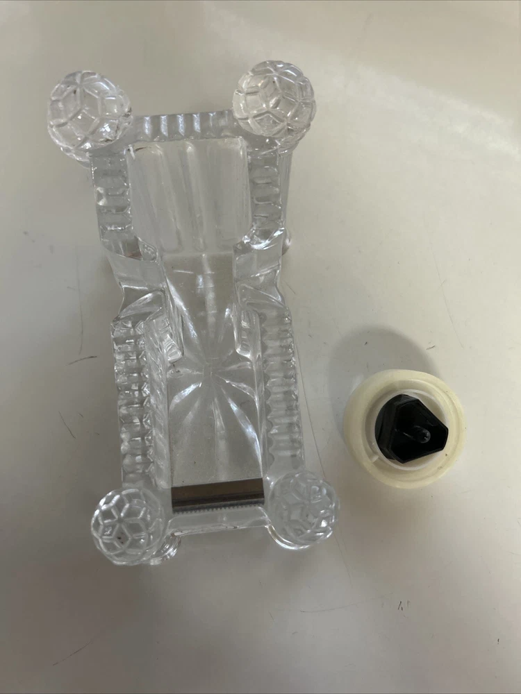 This vintage tape dispenser is a beautiful addition to any desktop. Made of lead crystal and glass, it exudes elegance and sophistication. The ornate design adds a touch of glamour to your workspace. Crafted with care, this tape dispenser is a unique collectible item. It is perfect for those who appreciate vintage pieces or those who are looking for a conversation starter. The country/region of manufacture is unknown, but the quality of this piece speaks for itself. Add a touch of charm to your desk with this stunning piece. Excellent condition!
