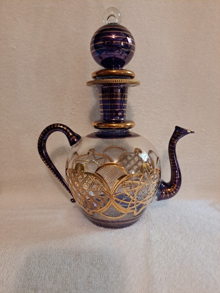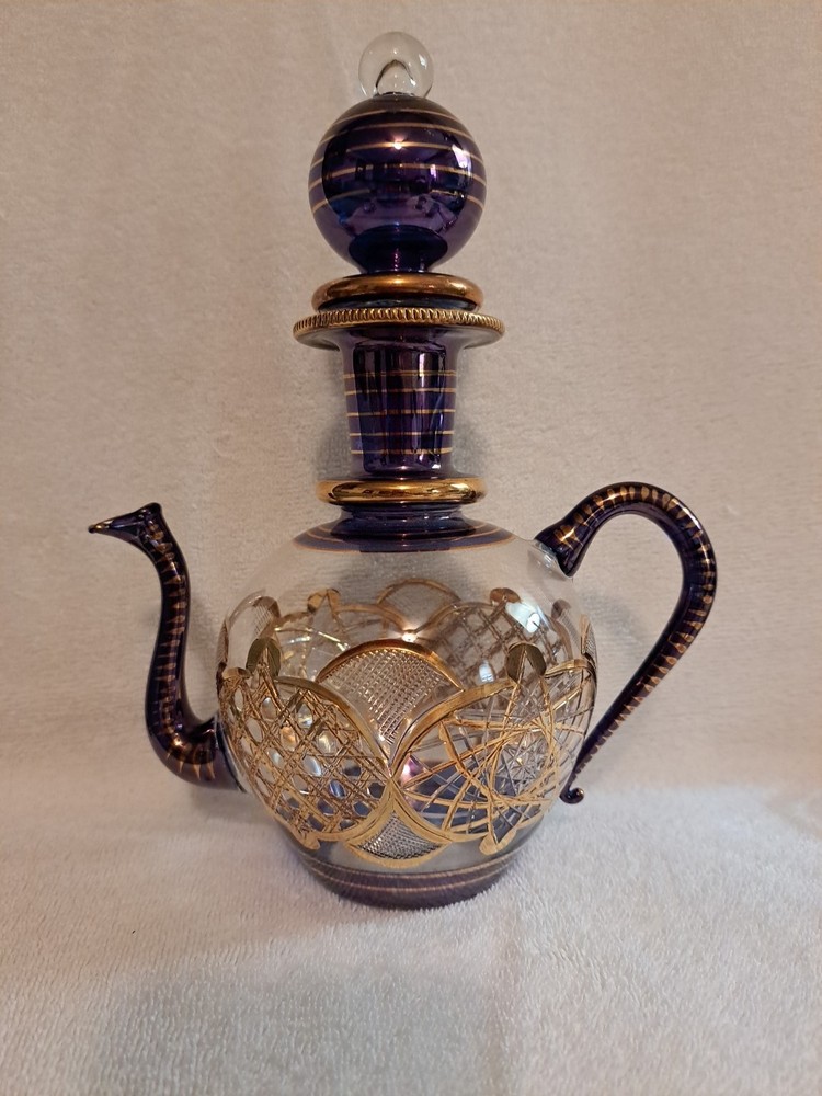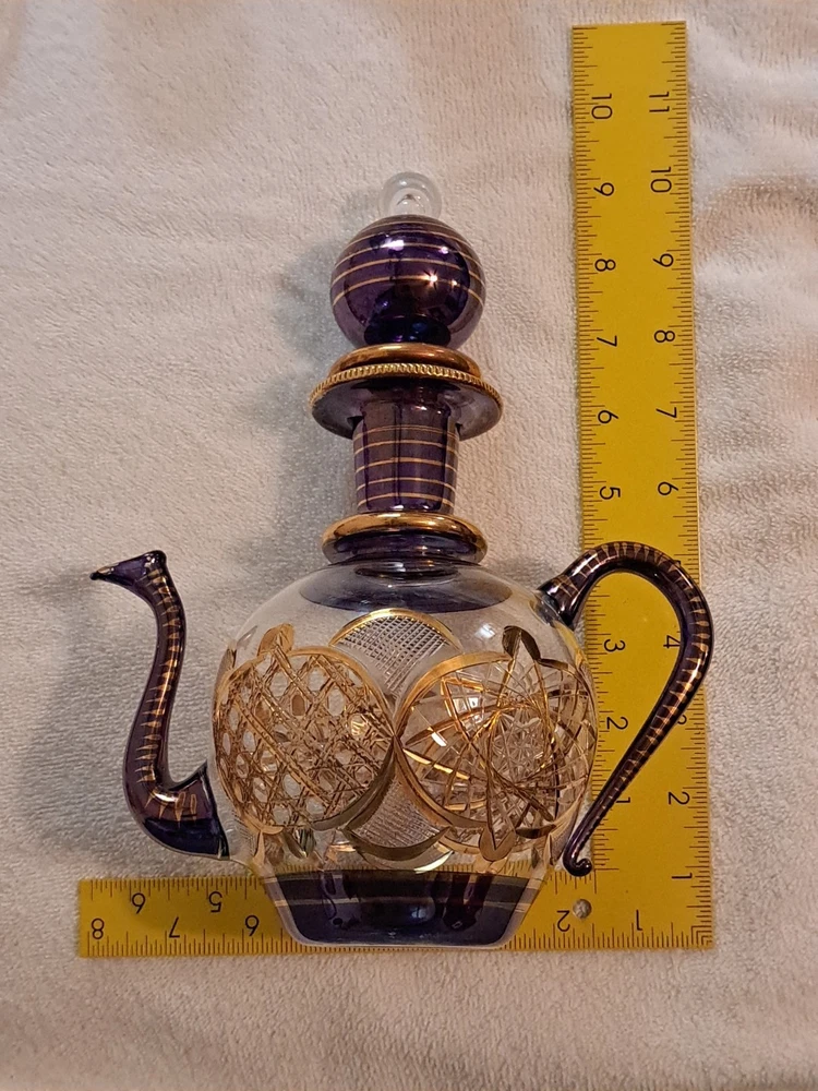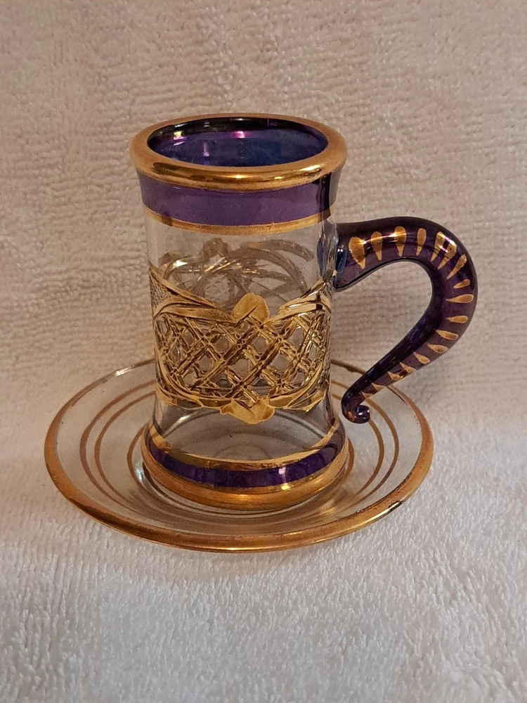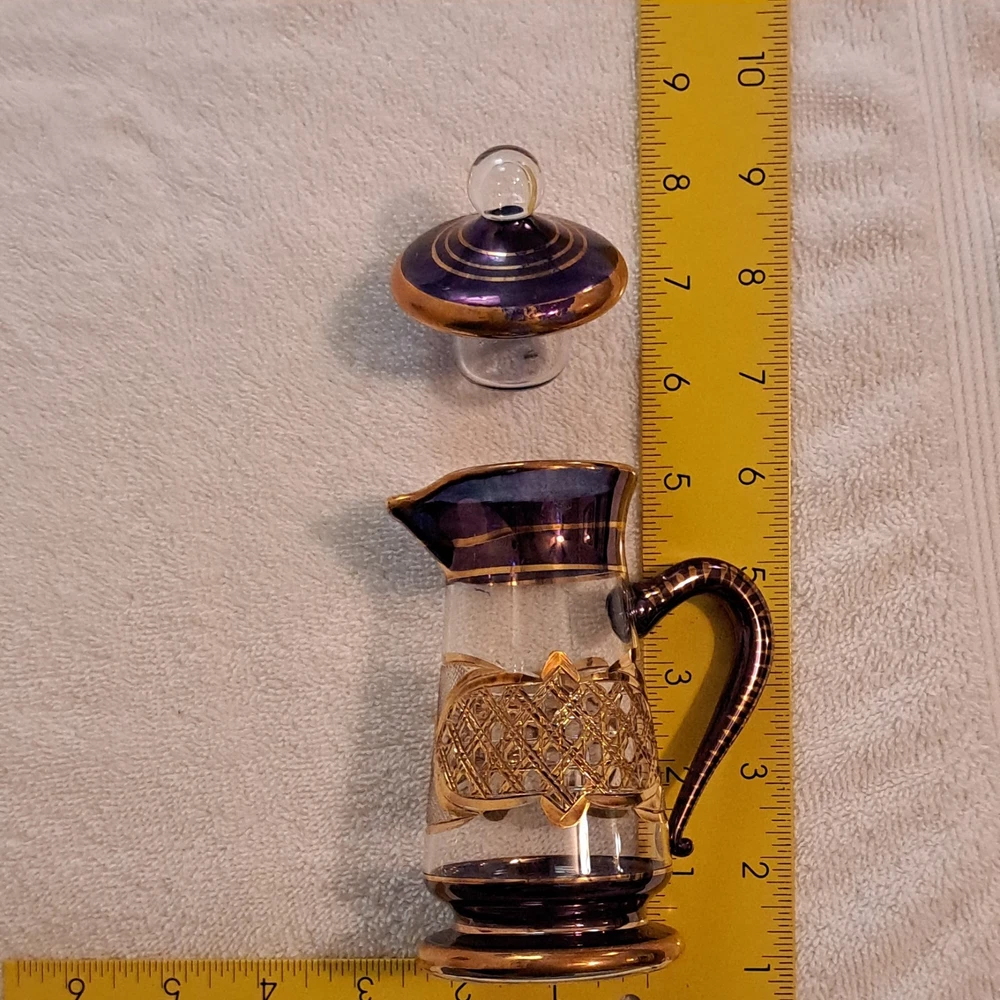 This vintage Turkish tea/coffee set includes a pot, 5 cups, and 5 saucers, creamer and sugar bowl in a rich purple and gold color scheme. Made of glass, this authentic Turkish-style tea set exudes a vintage charm that adds a touch of tradition to any tea or coffee ceremony. The set is an original piece, perfect for collectors or those who appreciate unique and elegant dinnerware. Enjoy a cup of tea or coffee in style with this beautiful and timeless Turkish tea set. This set has never been used. I can combine shipping to save you some $$ 🥳