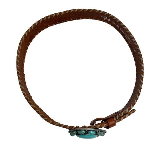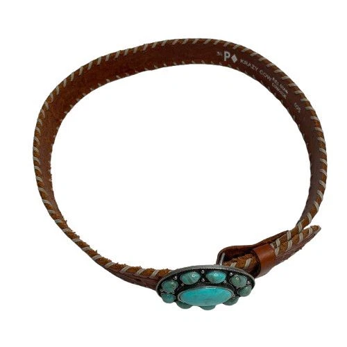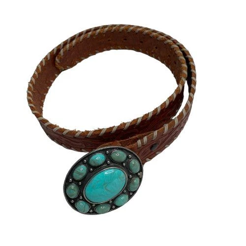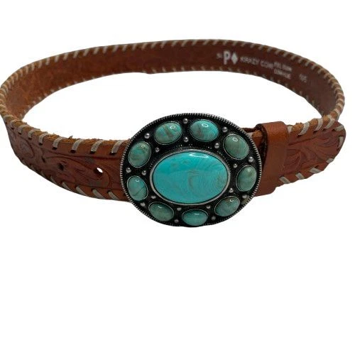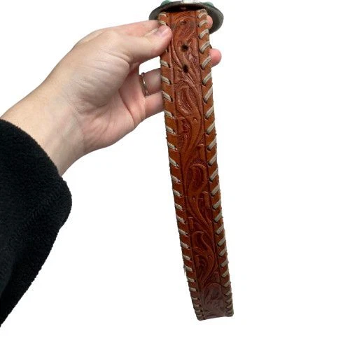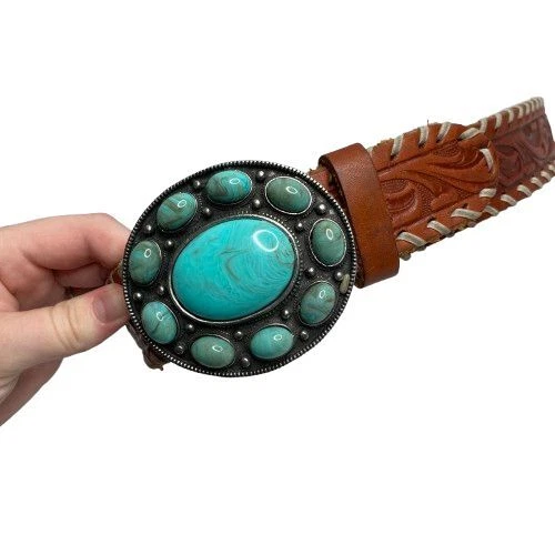 Very Good Pre-Owned Condition (see pics for details). Stunning leather belt featuring an eye-catching oval buckle adorned with faux turquoise stones in a flower-like pattern. The rich brown leather strap showcases beautiful tooled detailing and whipstitched edges. Perfect for festival outfits, western wear, or adding a bohemian touch to everyday looks. Keywords: turquoise belt, western belt, leather belt, boho belt, cowgirl belt, tooled leather, stone buckle, southwestern style, bohemian accessories, western fashion, turquoise buckle, whipstitched belt Size 34 Approximately 38.5" long (without buckle) Please compare measurements to something you already own to verify size and fit We are happy to answer any questions! We ship the next business day!