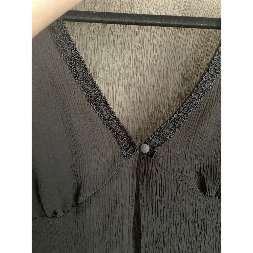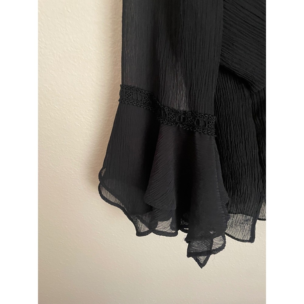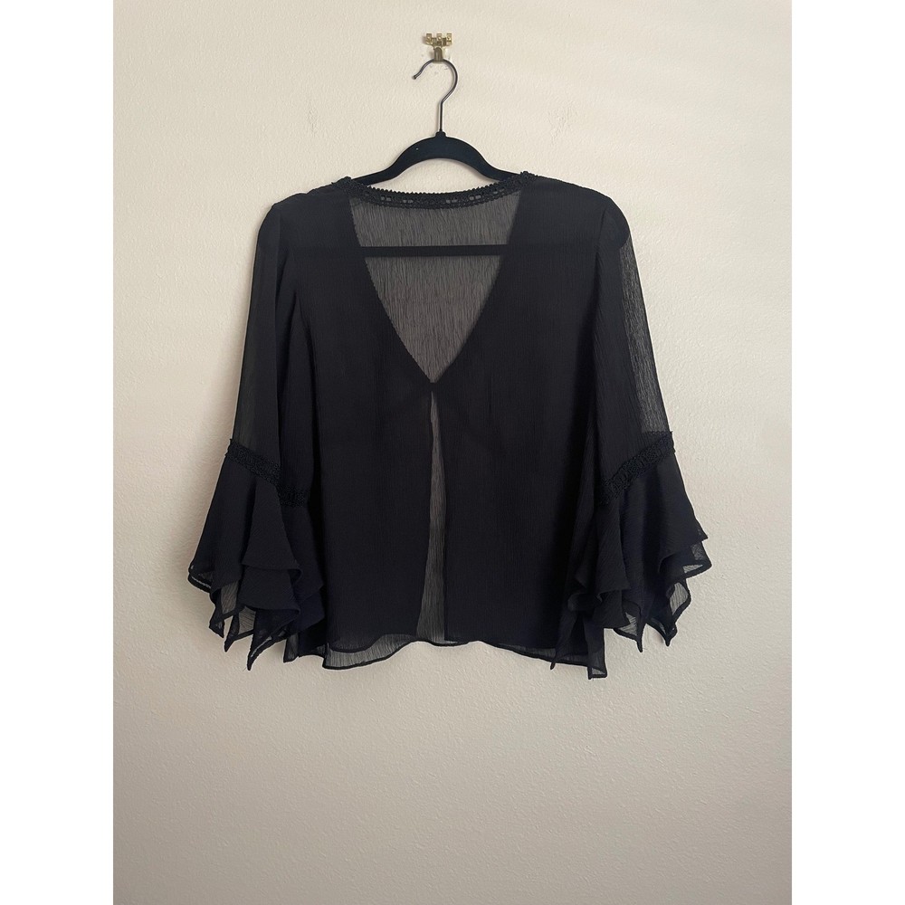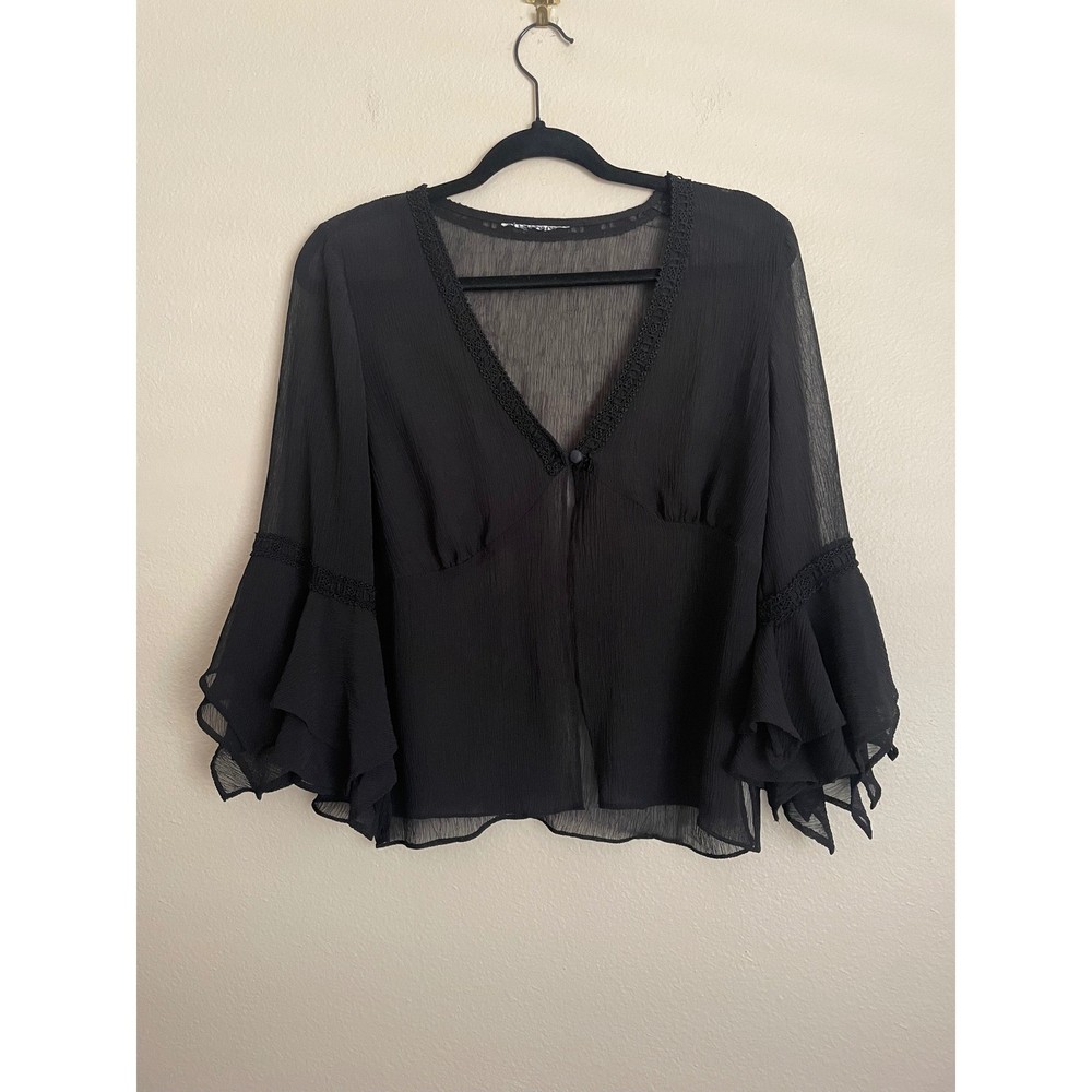 Witchy, Vamp, Asymmetric, 90s, Boho, Festival, Embroidered, Button Front, Dark Romantic, Victorian, Bohemian, Goth, Fairy Color: Black Material: 100% Polyester Style: Sheer Chiffon, Bell Sleeve, Crochet Trim Neckline: V-Neck Closure: Single Front Button Sleeve Length: 3/4 Length Detail: Tiered Ruffle Cuffs Season: All Seasons Fit: Petite Care: Machine Washable Keywords: Whimsigoth, Goth, Romantic, Witchy, Sheer, Layering, Victorian, Boho, Dark Academia, Fairycore, Vintage Style Measurements: Tag Cut measures size XL Extra Large Armpit to Armpit: 21" Length: 21" Sleeve Length: 21.5" From Pet Friendly Smoker Free Home