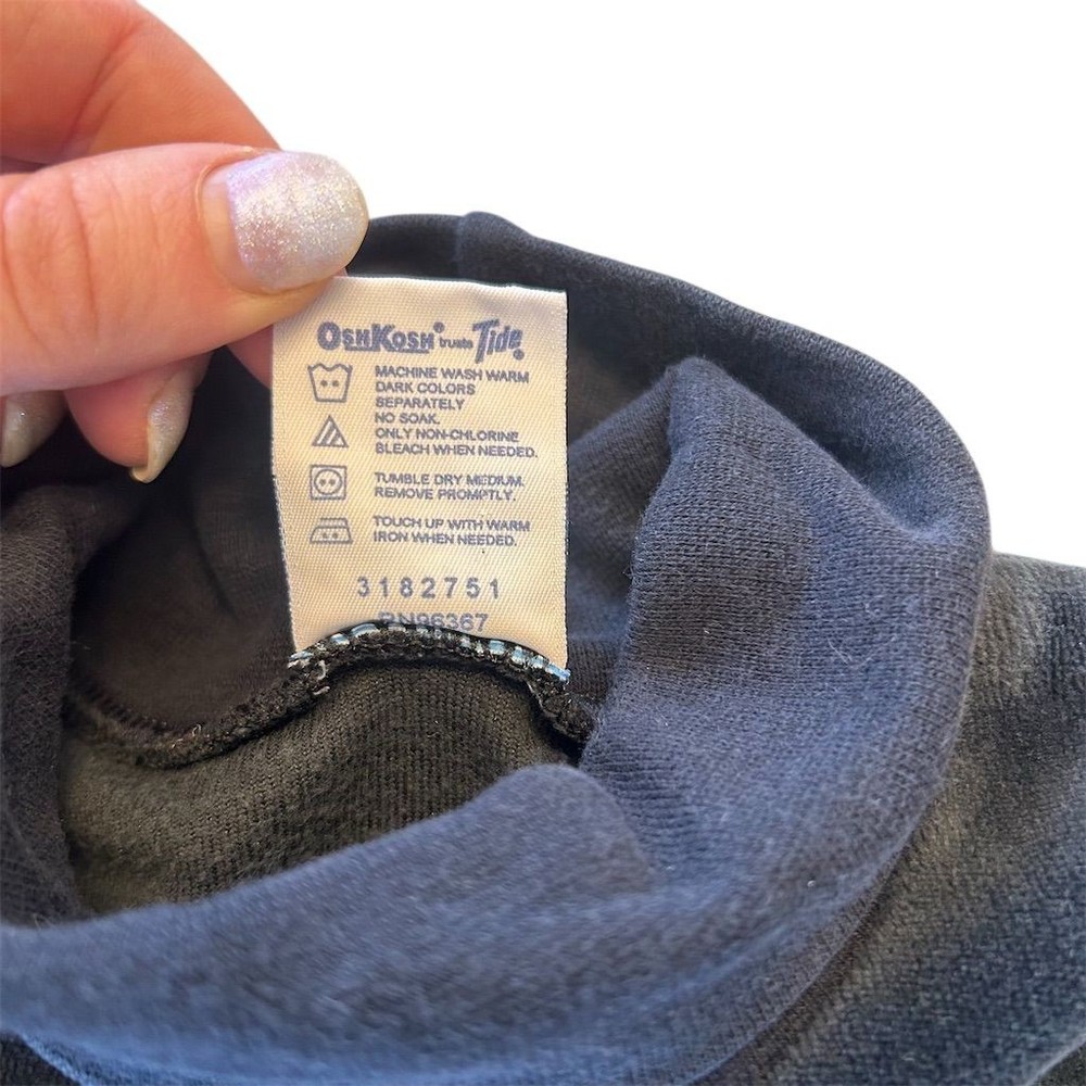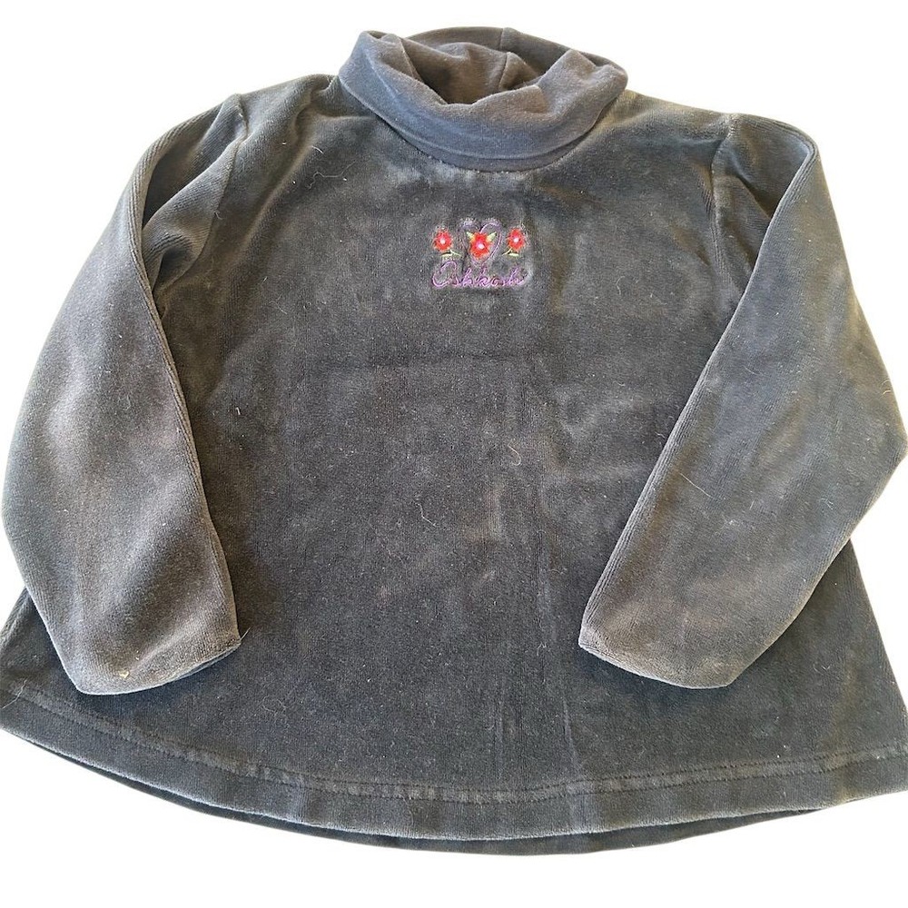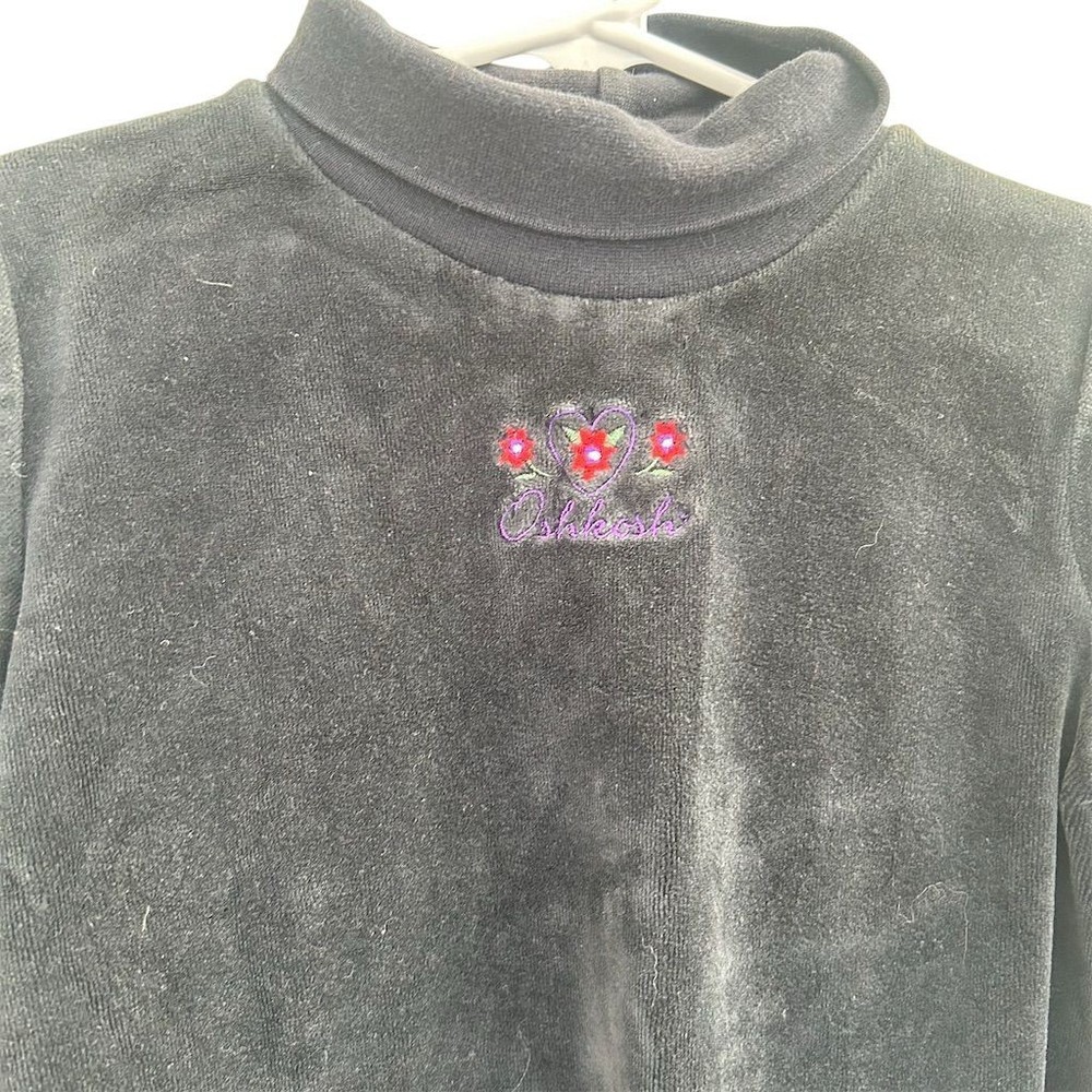 Girls black velour mock neck long sleeve top. Features a sweet embroidered floral heart detail on the front and the OshKosh B'gosh logo. Perfect for everyday wear or special occasions. Measurements: • Sleeve Length: 15 in • Chest: 12 in • Length: 16 in Department: Girls Sleeve Length: Long Sleeve Theme: Rose, Love Material: Cotton Blend, Polyester Blend Pattern: Floral Neckline: Turtleneck Style: Pullover Features: Easy Care Fit: Regular Fabric Type: Velour Accents: Embroidered Closure: Pullover All items come from a smoke free, pet friendly home. All of items unless NWT or Dry Clean Only are washed with Tide. We try our best to disclose any flaws with items, if we miss something please reach out and let us know. We offer combined shipping on all our items. We do take measurements of our clothing listed for sale. Please compare the measurements to something you already own.