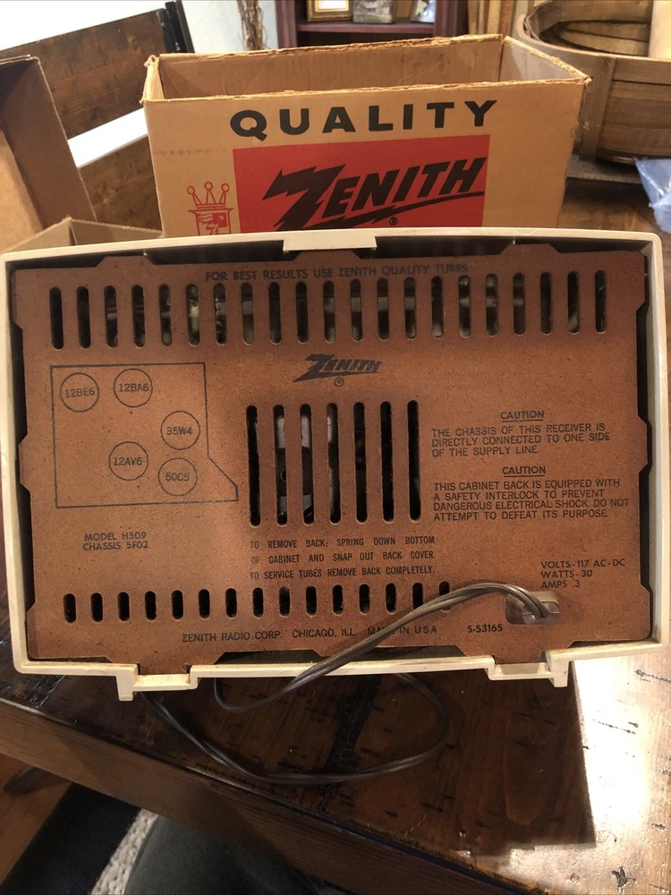 This is a zenith radio in the original box. This is in really good condition. I see no damage. Has some sticky something on top., should clean up. I have not tried to clean this. This does power up when turned on but only hums. Please view the pictures for item description. I will ship after payment five days a week.