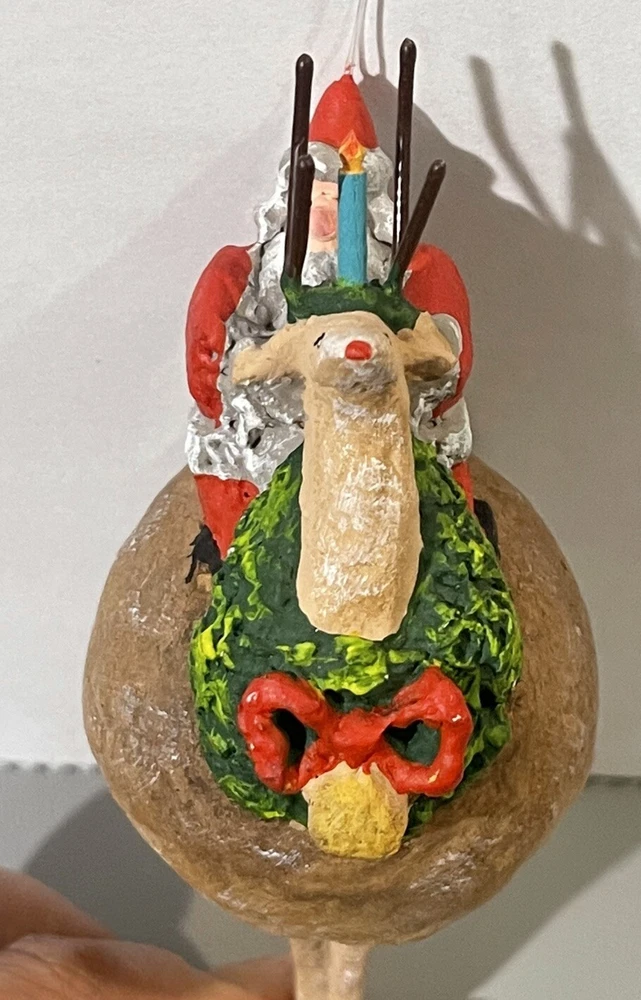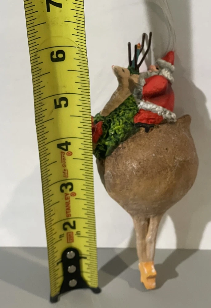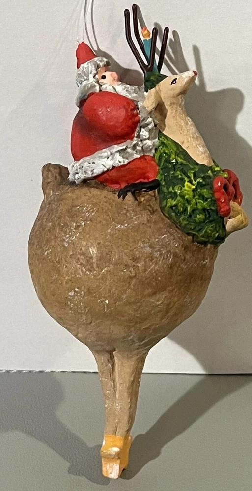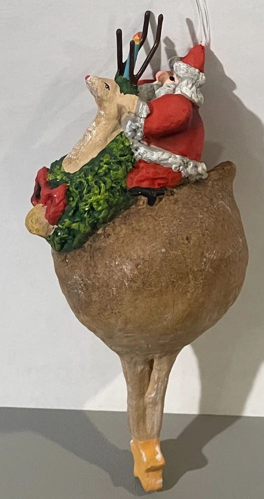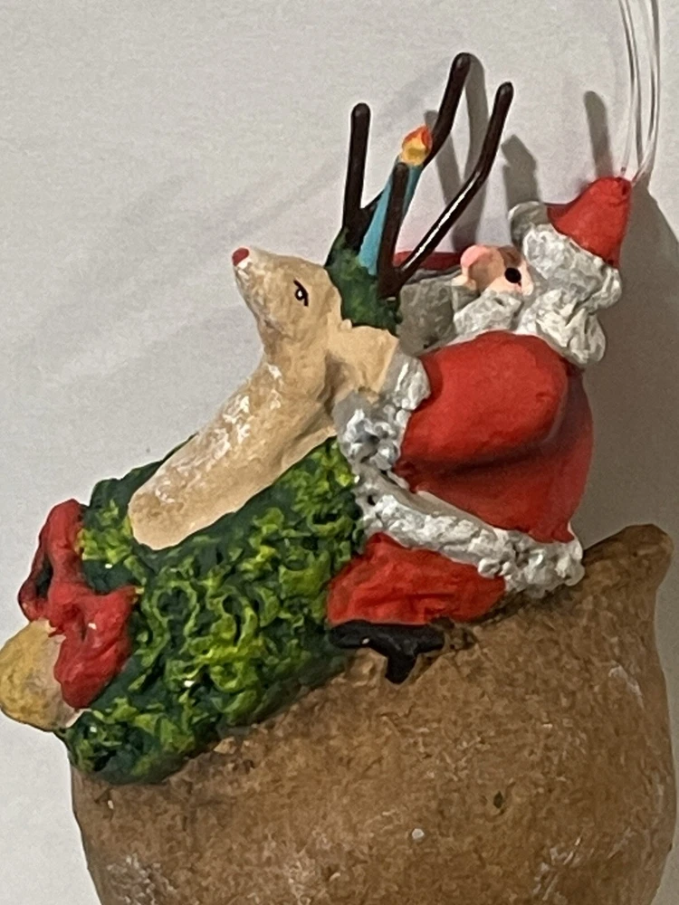 This vintage-inspired ornament features a jolly Santa riding on a reindeer, perfect for your Christmas tree. The hand-painted details on the plastic mold make it a unique and charming addition to your collection. Crafted with care, this figurine is sure to bring joy to your home during the holiday season. Its intricate design and attention to detail make it a wonderful addition to any collection of ornaments and figurines. Add this delightful piece to your collection today!