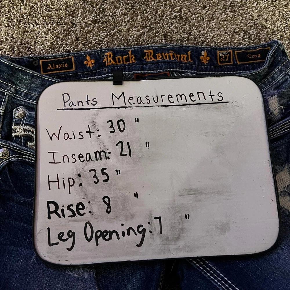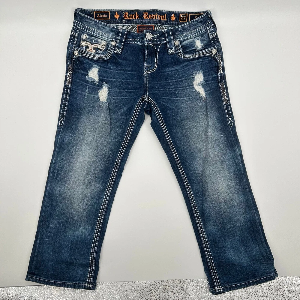Vintage y2k women's Rock Revival Alexia Capris Cropped blue medium dark wash denim jeans -pink, orange, embroidered, cross, floral, distressed Waist: 30" Inseam: 21" Hip: 35" Rise: 8" Leg Opening: 7" Tag Size: 27 *the waist got stretched out a bit, but the hips didn't, so please keep that in mind. It would be best to stay true to your size and wear a belt, since the hips didn't stretch too. Item is in good used condition. Look at photos to see the condition. All, if any, flaws have been pictured. See the last photo for measurements. The waist and hip measurements are measured flat and then multiplied by 2 to get the full measurement around. Please know which measurements fit you prior to purchasing, and don’t just rely on the size tag. Feel free to ask any questions! ***Item is cross posted on several platforms***