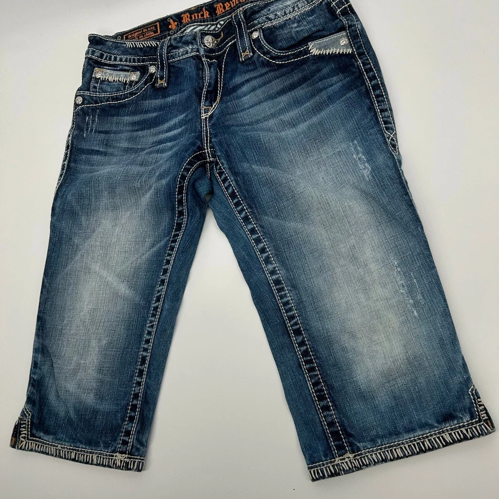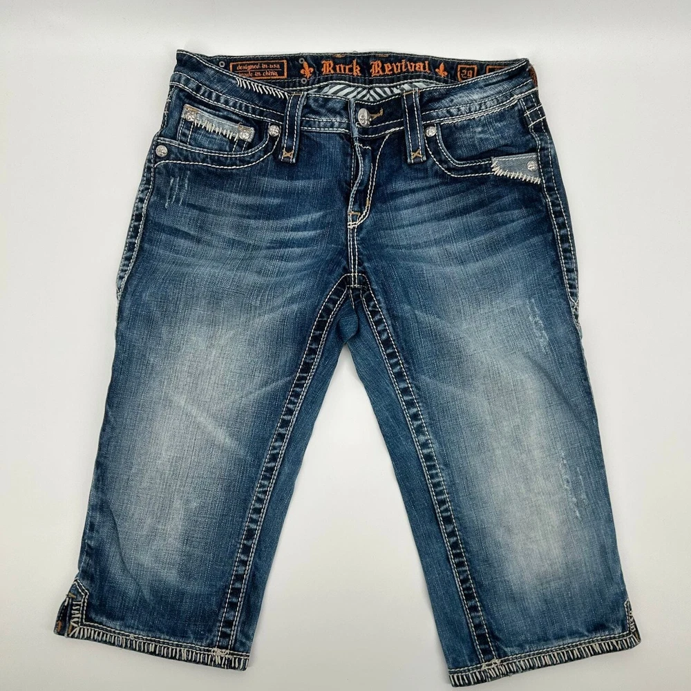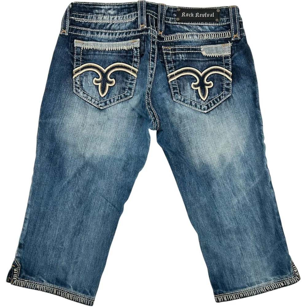 Vintage y2k women's Rock Revival Karlie Capri Cropped blue medium wash denim jeans -embroidered, cross, distressed Waist: 32" Inseam: 16.5" Hip: 38" Rise: 8" Leg Opening: 7.5" Tag Size: 29 *the waist got stretched out a bit, but the hips didn't, so please keep that in mind. It would be best to stay true to your size and wear a belt, since the hips didn't stretch too. Item is in good used condition. Look at photos to see the condition. All, if any, flaws have been pictured. See the last photo for measurements. The waist and hip measurements are measured flat and then multiplied by 2 to get the full measurement around. Please know which measurements fit you prior to purchasing, and don’t just rely on the size tag. Feel free to ask any questions! ***Item is cross posted on several platforms***