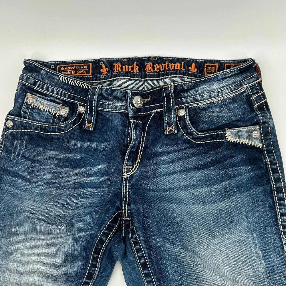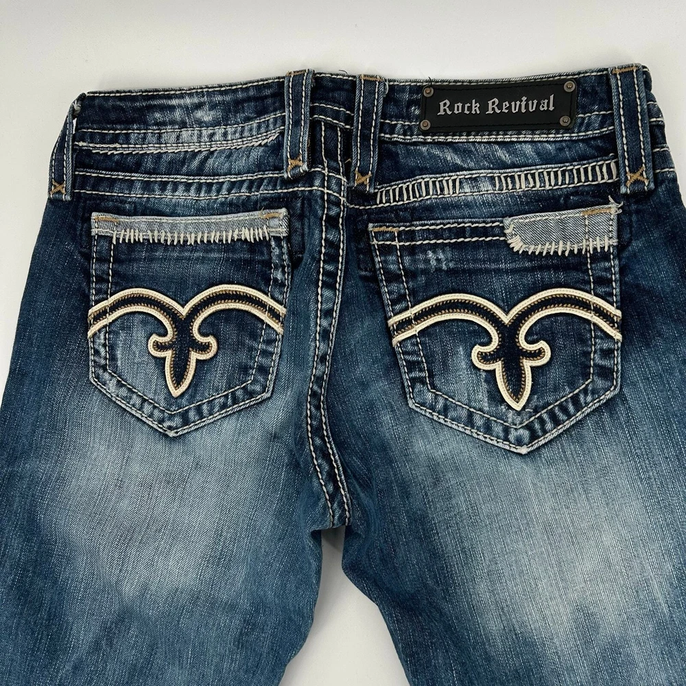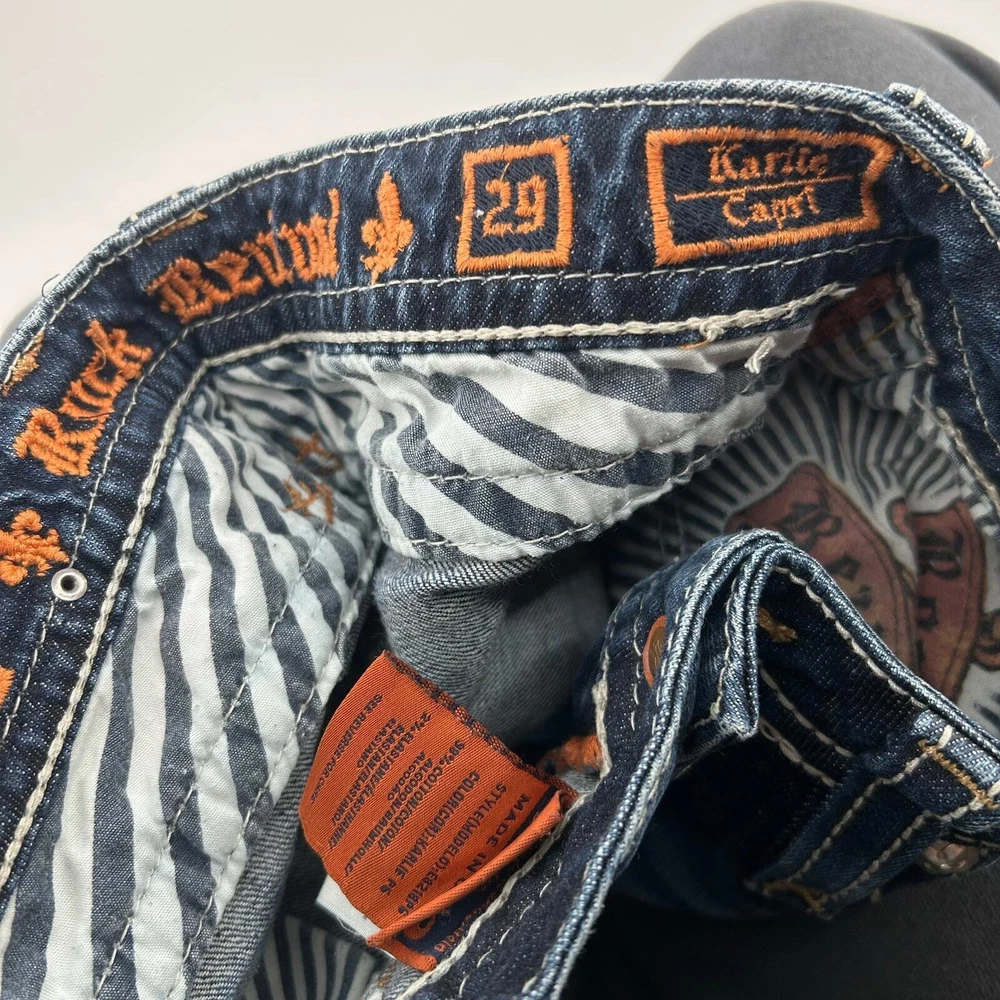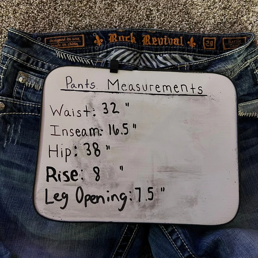Vintage y2k women's Rock Revival Karlie Capri Cropped blue medium wash denim jeans -embroidered, cross, distressed Waist: 32" Inseam: 16.5" Hip: 38" Rise: 8" Leg Opening: 7.5" Tag Size: 29 *the waist got stretched out a bit, but the hips didn't, so please keep that in mind. It would be best to stay true to your size and wear a belt, since the hips didn't stretch too. Item is in good used condition. Look at photos to see the condition. All, if any, flaws have been pictured. See the last photo for measurements. The waist and hip measurements are measured flat and then multiplied by 2 to get the full measurement around. Please know which measurements fit you prior to purchasing, and don’t just rely on the size tag. Feel free to ask any questions! ***Item is cross posted on several platforms***