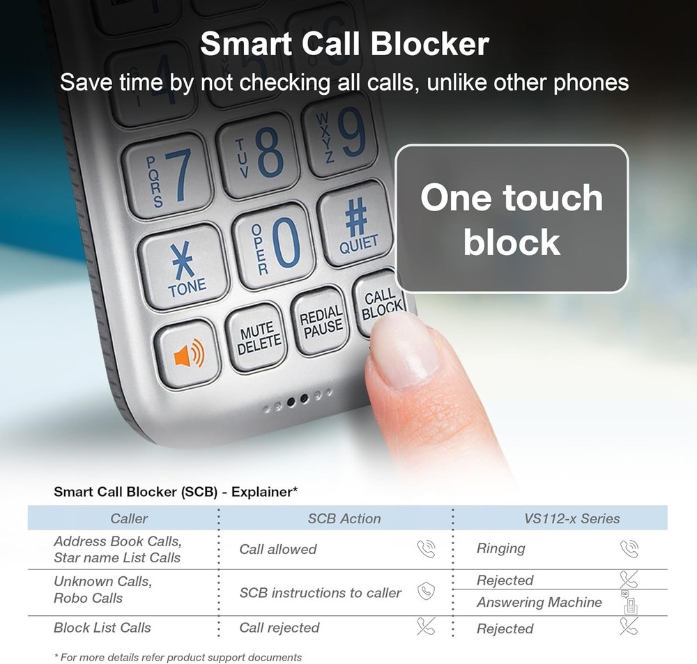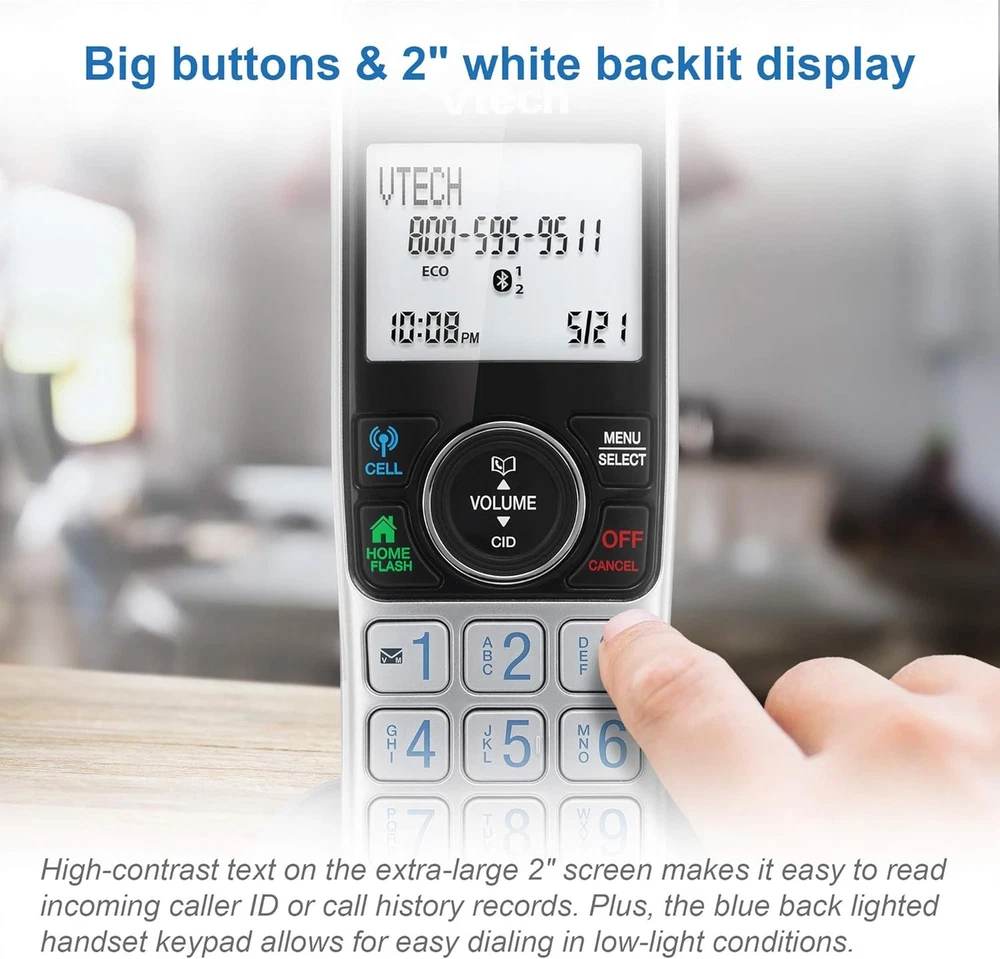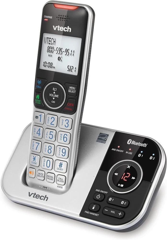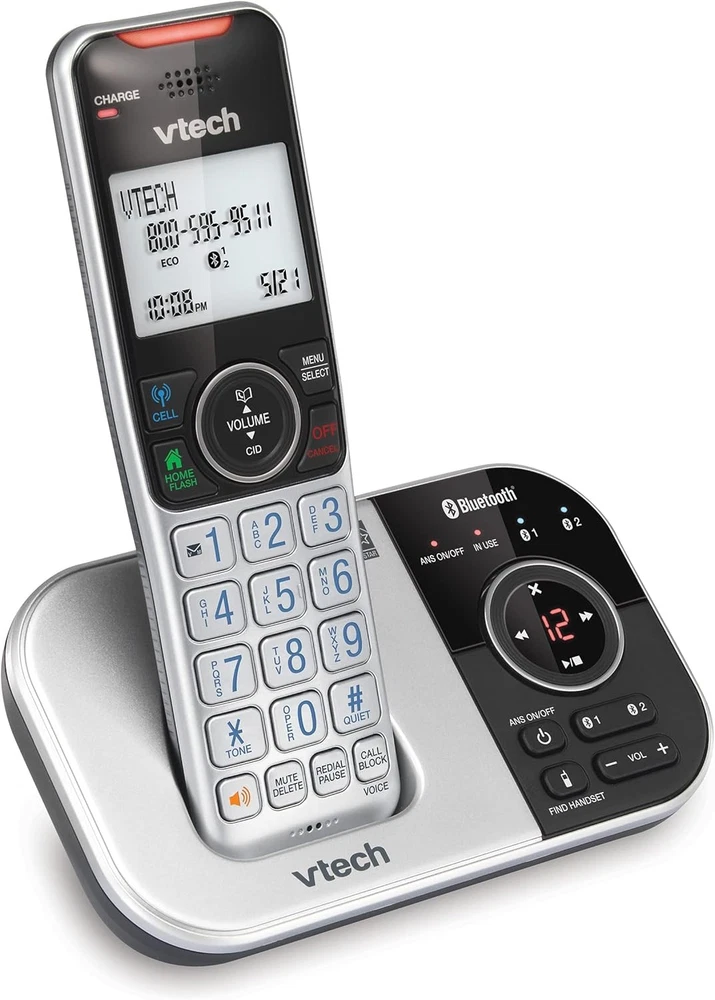 VTech VS112 Cordless Phone for Home with Answering Machine, 1 Handset, Silver Product Details Product Dimensions: 4.7 x 4 x 7 inches Item Weight: 1.12 pounds Item model number: VS112 Batteries: 1 Product Specific batteries required. (included) Manufacturer: VTech Brand: VTech Color: Silver Telephone Type: Cordless Number of Batteries: 1 Product Specific batteries required. (included) Material: Plastic Power Source: Battery Powered Dialer Type: Single Keypad Item dimensions L x W x H: 4.7 x 4 x 7 inches Answering System Type: Digital Item Weight: 1.1 Pounds ** SMART CALL BLOCKER ** This system lets you block nuisance callers on the spot with one touch. You can permanently blacklist up to 1,000 numbers. What's more, it can filter robocalls and unwanted call while allowing welcome calls to get through. For screen out robocalls, set it to ask the callers to press the pound key. For screen out unknown callers, set it to ask the callers to record their names and press the pound key. After your caller completes the request, the phone rings and announces the caller's name. You then can choose to block or answer the call, or forward the call to the answering system. ** BLUETOOTH CONNECT TO CELL ** Make and receive calls from your cellular plan while enjoying the comforts of a home phone. Pair up to 2 cell phones and connect 2 cell phones, or one cell phone and one BLUETOOTH headset for use with landline calls. With a touch of a button, enjoy the high-tech benefits your smart phone offers. Even if your smart phone is in a different room, you can still access Siri or Google Now from the cordless handsets. Place a call, write or read a text and perform all the other actions these services offer. ** DIGITAL ANSWERING SYSTEM WITH VOICE GUIDE ** This cordless system includes a digital answering machine that has a LED message counter, and records up to 22 minutes of incoming messages, outgoing announcements and memos. A built-in voice guide can help you to set up the system easily. ** LARGE 2-INCH SCREEN, BIG TEXT, LIGHTED KEY PAD ** High-contrast text on the extra-large 2 inch screen makes it easy to read incoming caller ID or call history records. Plus, the enlarged font and extra-large and lighted handset keypad allows for easy dialing in low-light conditions. This feature is especially helpful for those who are visually impaired. ** SPEAKERPHONE and VISUAL RINGER ** This cordless system has built-in a full-duplex speakerphone on handset allowing both ends to speak - and be heard - at the same time for conversations that are more true to life. Also designed with a lighted up visual ringer on top of the handset for noisier environments, or for those with weakened hearing. ** EXPANDABLE TO 5 HANDSET **Easily add accessory handsets (use VS112-0 or VS112-07 model) up to 5 total, with just one phone jack. With the VTech VS112 Expandable Cordless Phone featuring, Bluetooth Connect to Cell and Smart Call Blocker, you won't have to worry about unwanted calls waking you up in the middle of the night or tying up the line. Robocalls are automatically blocked from ever ringing through—even the first time. You can also permanently blacklist any number you want with one touch. Bluetooth Connect to Cell technology on this cordless phone system lets you receive cell and/or landline calls from one home phone system. With a touch of a button, enjoy the high-tech benefits your smart phone offers. Even if your smart phone is in a different room, you can still access Siri or Google Now from the cordless handsets. Place a call, write or read a text and perform all the other actions these services offer.