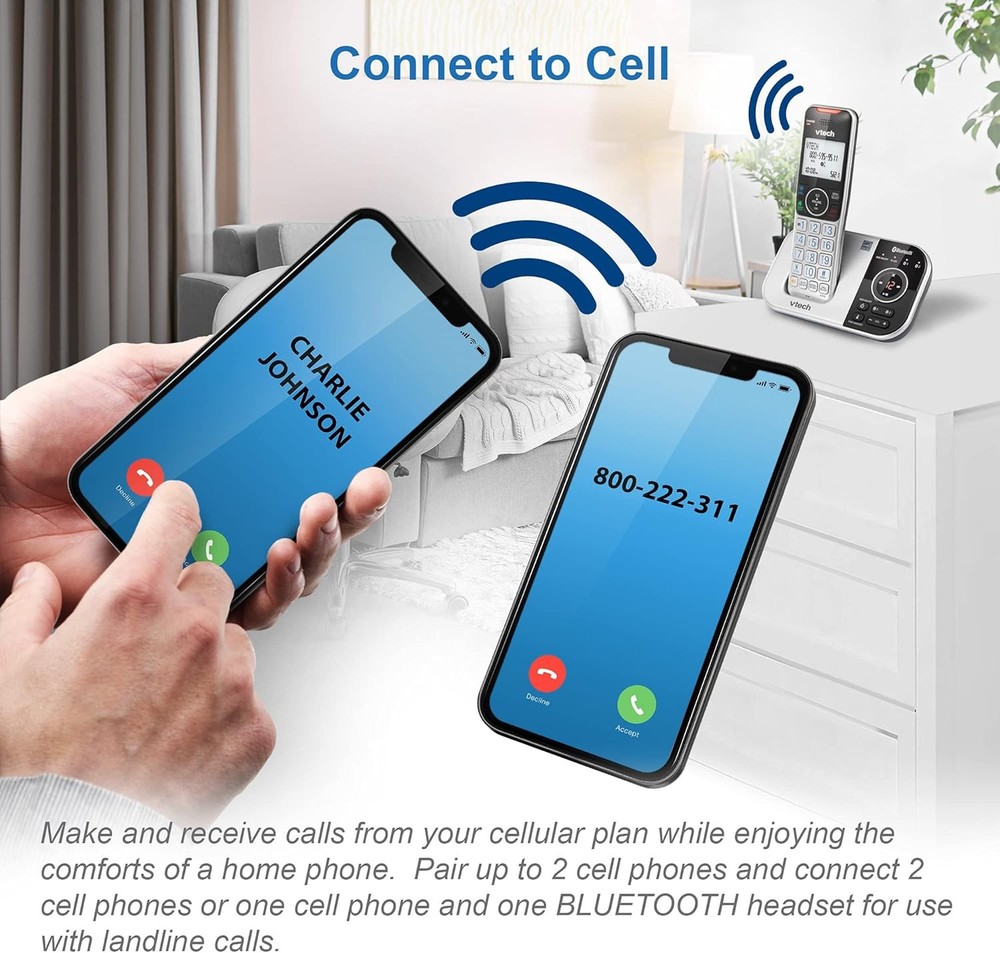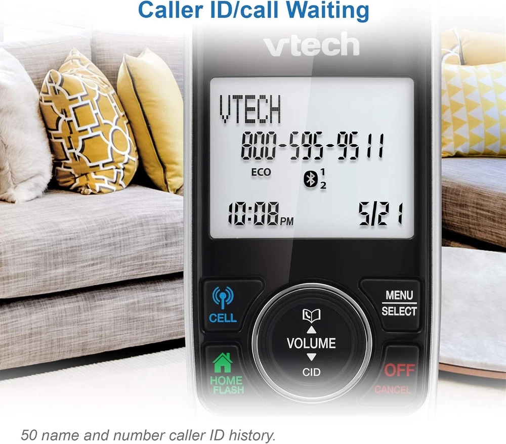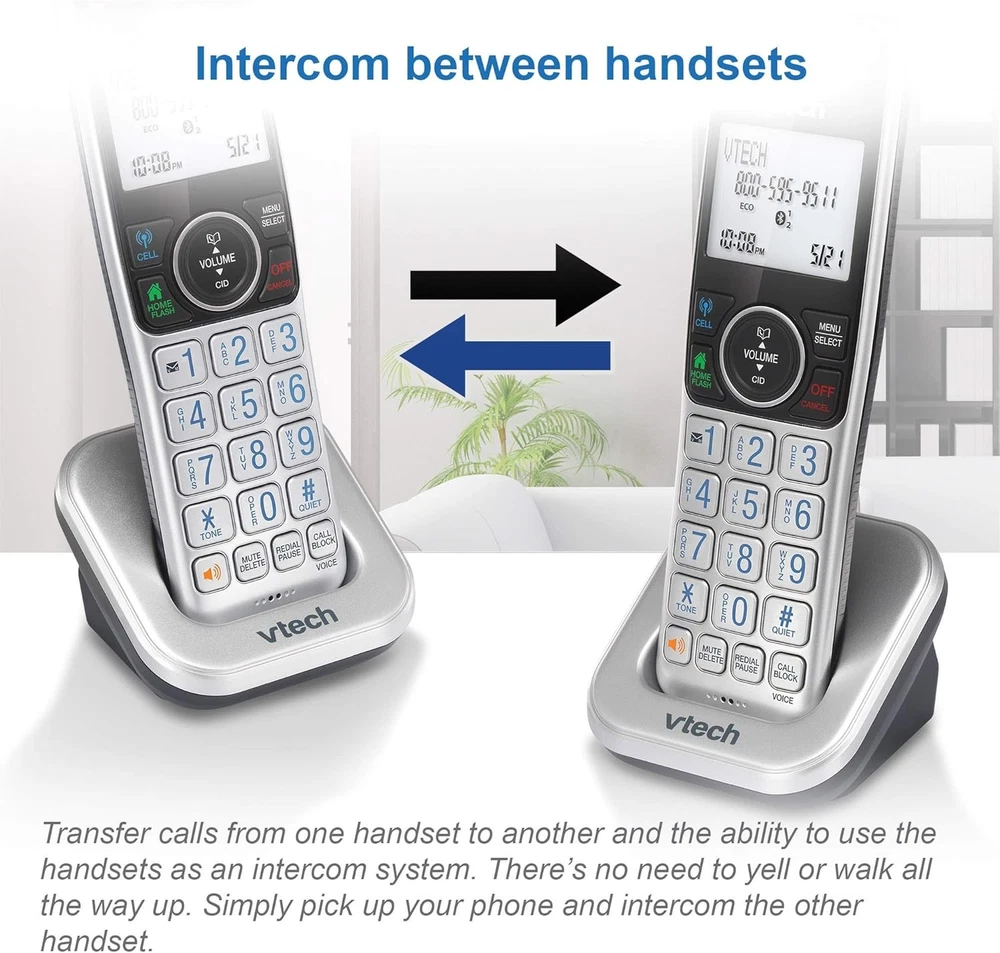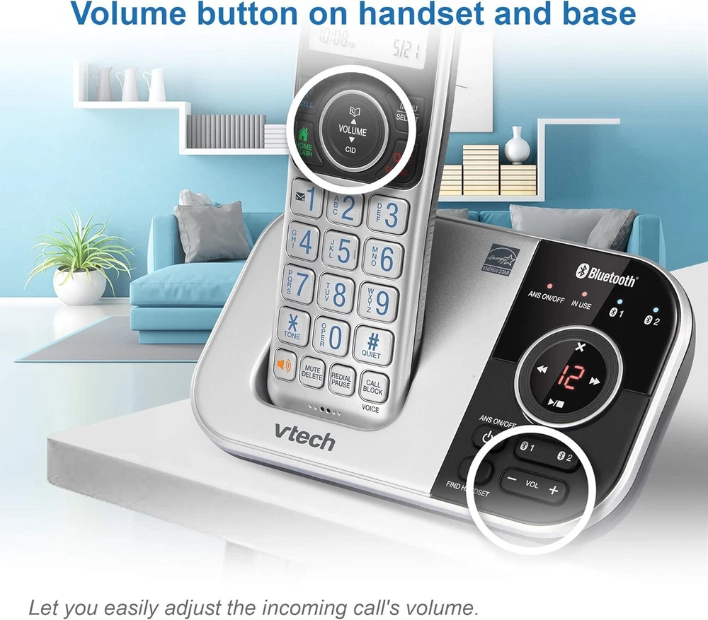 VTech VS112 Cordless Phone for Home with Answering Machine, 1 Handset, Silver Product Details Product Dimensions: 4.7 x 4 x 7 inches Item Weight: 1.12 pounds Item model number: VS112 Batteries: 1 Product Specific batteries required. (included) Manufacturer: VTech Brand: VTech Color: Silver Telephone Type: Cordless Number of Batteries: 1 Product Specific batteries required. (included) Material: Plastic Power Source: Battery Powered Dialer Type: Single Keypad Item dimensions L x W x H: 4.7 x 4 x 7 inches Answering System Type: Digital Item Weight: 1.1 Pounds ** SMART CALL BLOCKER ** This system lets you block nuisance callers on the spot with one touch. You can permanently blacklist up to 1,000 numbers. What's more, it can filter robocalls and unwanted call while allowing welcome calls to get through. For screen out robocalls, set it to ask the callers to press the pound key. For screen out unknown callers, set it to ask the callers to record their names and press the pound key. After your caller completes the request, the phone rings and announces the caller's name. You then can choose to block or answer the call, or forward the call to the answering system. ** BLUETOOTH CONNECT TO CELL ** Make and receive calls from your cellular plan while enjoying the comforts of a home phone. Pair up to 2 cell phones and connect 2 cell phones, or one cell phone and one BLUETOOTH headset for use with landline calls. With a touch of a button, enjoy the high-tech benefits your smart phone offers. Even if your smart phone is in a different room, you can still access Siri or Google Now from the cordless handsets. Place a call, write or read a text and perform all the other actions these services offer. ** DIGITAL ANSWERING SYSTEM WITH VOICE GUIDE ** This cordless system includes a digital answering machine that has a LED message counter, and records up to 22 minutes of incoming messages, outgoing announcements and memos. A built-in voice guide can help you to set up the system easily. ** LARGE 2-INCH SCREEN, BIG TEXT, LIGHTED KEY PAD ** High-contrast text on the extra-large 2 inch screen makes it easy to read incoming caller ID or call history records. Plus, the enlarged font and extra-large and lighted handset keypad allows for easy dialing in low-light conditions. This feature is especially helpful for those who are visually impaired. ** SPEAKERPHONE and VISUAL RINGER ** This cordless system has built-in a full-duplex speakerphone on handset allowing both ends to speak - and be heard - at the same time for conversations that are more true to life. Also designed with a lighted up visual ringer on top of the handset for noisier environments, or for those with weakened hearing. ** EXPANDABLE TO 5 HANDSET **Easily add accessory handsets (use VS112-0 or VS112-07 model) up to 5 total, with just one phone jack. With the VTech VS112 Expandable Cordless Phone featuring, Bluetooth Connect to Cell and Smart Call Blocker, you won't have to worry about unwanted calls waking you up in the middle of the night or tying up the line. Robocalls are automatically blocked from ever ringing through—even the first time. You can also permanently blacklist any number you want with one touch. Bluetooth Connect to Cell technology on this cordless phone system lets you receive cell and/or landline calls from one home phone system. With a touch of a button, enjoy the high-tech benefits your smart phone offers. Even if your smart phone is in a different room, you can still access Siri or Google Now from the cordless handsets. Place a call, write or read a text and perform all the other actions these services offer.