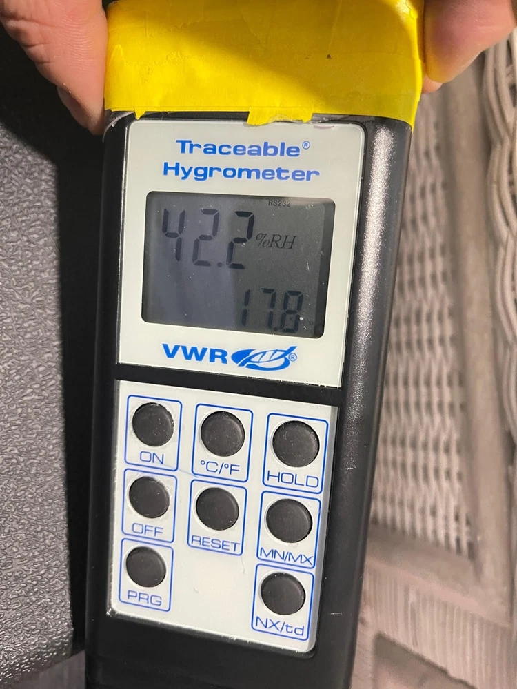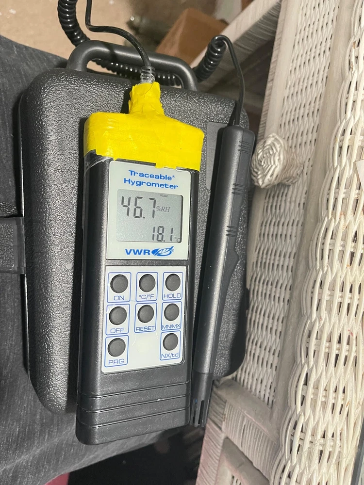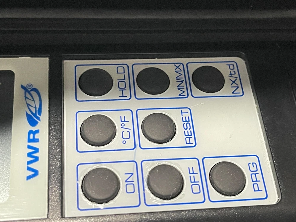 VWR Traceable hygrometer 35519-050 & Probe Thermometer Model 4185 This is a VWR Traceable hygrometer 35519-050 & Probe Thermometer Model 4185. It appears to work just fine. Please note that the probe cord is frayed, as seen in the last picture. This arrived with a red tag claiming that this instrument is out of calibration. Product Info for Control Company Hygrometers/Thermometers with Memory and Probe 4185 Hygrometer/Thermometer Control Company Hygrometers/Thermometers with Memory and Probe Hygrometer/Thermometer is a reliable and dependable addition to the family of products. Combining top-notch and uncompromising quality with an affordable price, the Control Company Hygrometers/Thermometers with Memory and Probe Hygrometer/Thermometer 4185/ 35519-050 can fulfill your laboratory needs while still offering a great value for the money. Product Category Description: · Traceable™ · Read in °F and °C This unit takes measurements across a wide humidity range and simultaneously display humidity and temperature. Memory switches display minimum and maximum readings of humidity and temperature over any time period. The hold button freezes the display to capture readings. Miniature probe can be placed virtually anywhere. Units incorporate fast response solid-state sensors. Monitor humidity with a resistive polymer sensor and temperature with a thermistor sensor. Feature a 2.9cm (11/8") high LCD display that updates every second. Display temperature in °F or °C. Run continuously for 100 hours on one battery. Unit 35519-050 features dew point display and a programmable audible alarm. Chemical-resistant ABS case is also shock-resistant. An O-ring prevents moisture, dust, and dirt from entering the case. For added protection, units are supplied with a carrying case. Meet federal requirements for monitoring temperature and humidity in labs (CLIA specification 493.1207). It's equipped with an RS-232 serial output socket for sending data to a computer. A serial numbered certificate is provided from an ISO 17025 calibration laboratory accredited by A2LA to indicate instrument traceability to standards provided by the National Institute of Standards and Technology, even if it's far beyond it's due date.... Specifications for Control Company Hygrometer/Thermometer with Memory and Probe 4185 Hygrometer/Thermometer: Description: Hygrometer/Thermometer Unit: Each Humidity Range: 10 to 95% RH, 0.1% resolution 35519-050: ±2% RH, mid-range; ±4% RH, ends of range 33500-098: ±2% RH Temperature Range: -18 to 93°C (0 to 199.9°F) 0.1° resolution Temperature Accuracy: ±1°C (±1.8°F) from 0 to 40°C (32 to 104°F) Dew Point Display (33500-098), Range: 0 to 50°C (32 to 122°F) Dew Point Display (33500-098), Resolution: 0.1° Dew Point Display (33500-098), Accuracy: ±2°C (±3.6°F) Dew Point Display (33500-098), Response Time: 30 seconds Dew Point Display (33500-098), Cable Length: 91.4 cm (3') Dew Point Display (33500-098), Probe Dimensions: 21.6L x 1.8 dia. cm (8.5 x 0.7") Dew Point Display (33500-098), Dimensions: 18.1L x 7W x 3.2D cm (7 1 /8 x 2 3 /4 x 1 1 /4") Dew Point Display (33500-098), Weight: 303 g (10.7 oz.)