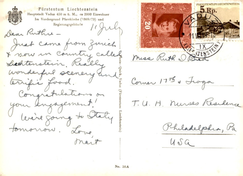 Greetings from Vaduz, Liechtenstein! Just arrived from Zurich to enjoy the stunning scenery and delicious food of this beautiful country. Congratulations on your engagement! Heading to Italy tomorrow. Love, Mait.