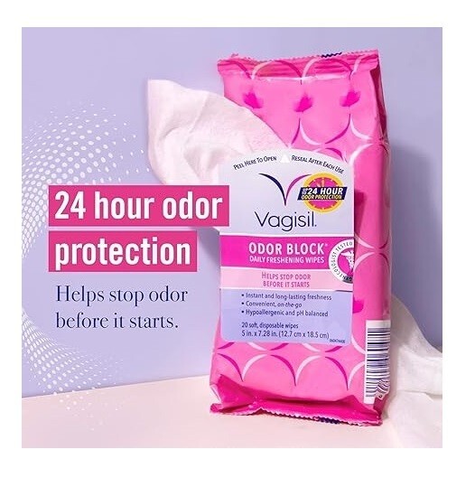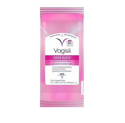 Brand :Vagisil Skin Type: Sensitive Material Feature :Allergen Free Unit Count :20 Count Number of Items :1 About this item: - Includes 1 pack of 20 soft and disposable deodorizing feminine wipes by Vagisil for long-lasting freshness Convenient, on-the-go resealable packaging to help keep you feeling fresh and confident all day long. - Odor Block Technology to help stop odor before it starts. Up to 24 hours of odor protection. - Instant and long-lasting freshness. Non-irritating, hypoallergenic and pH balanced formula. Gynecologist tested. - Light and clean scent. Tough on odor, gentle on skin. Also try Odor Block intimate wash, powder, and dry spray.
