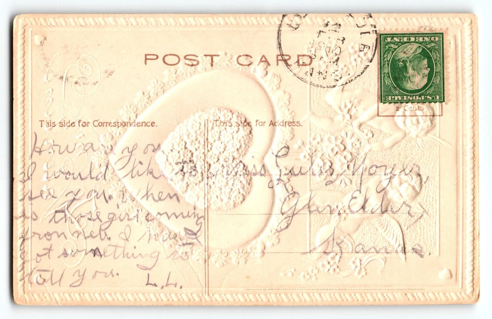 Posted with cancel. Antique original vintage embossed post card. Has some creases, corner dings, and age wear. Stock#VAL146. Additional postcards are in our store. All post cards are old originals and may or may not have writing on back. Bundle and save by using cart and making single payment.