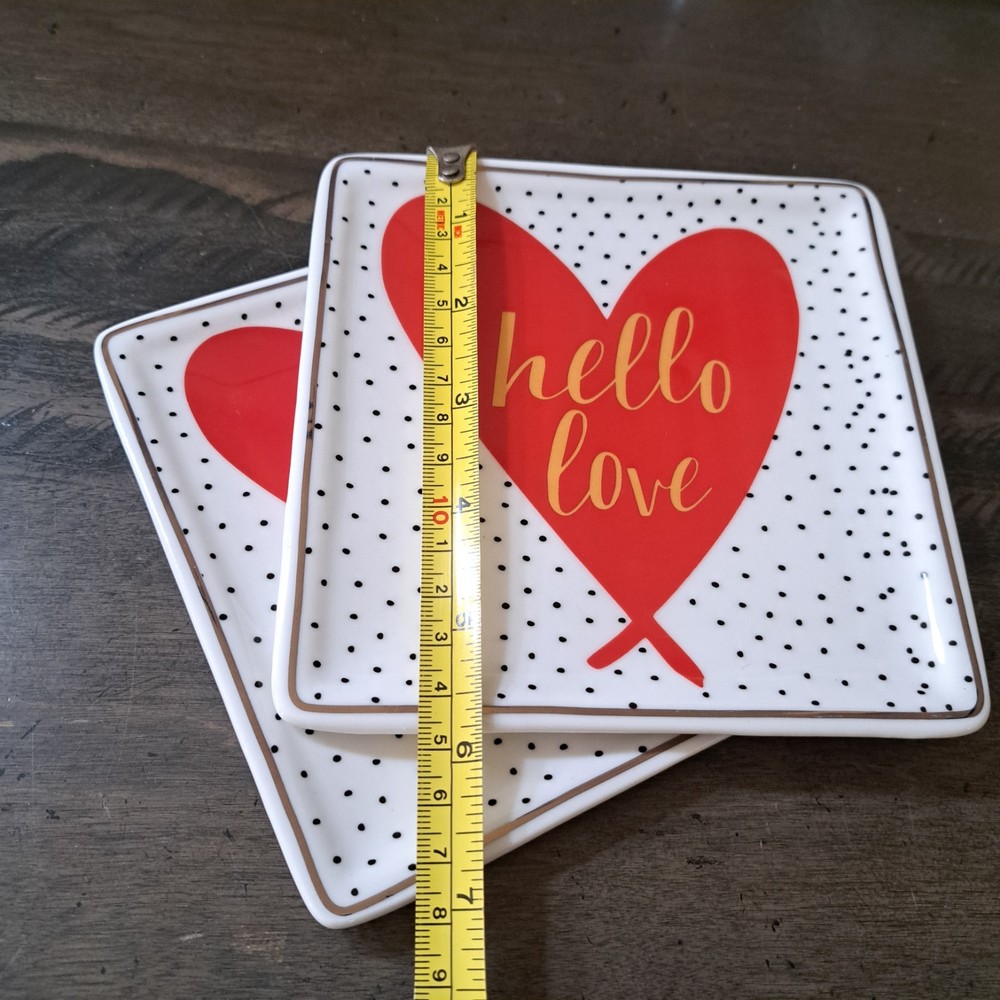 The Valentine Snack Plates Set of 2 features a romantic design with a red heart and the phrase "Hello Love", making it perfect for a Valentine's Day celebration. Made of porcelain, these 5.75"x5.75" plates are easy to care for and clean with a damp cloth amd warm water. The red and white color scheme adds a festive touch to any table setting, making them a charming addition to your holiday decor.