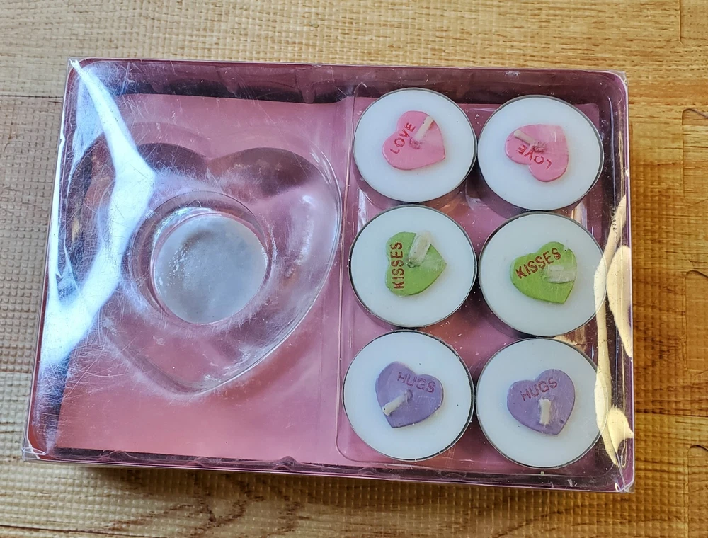 Valentine Tealight Set Candles (12) and Heart Clear Glass Holder (2) Candy Hearts Love and Anniversary New in Package Smoke Free Shipped within two business days of payment. Thanks for Looking. I appreciate your support of my home business.