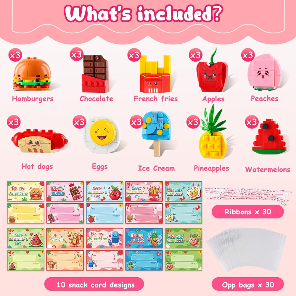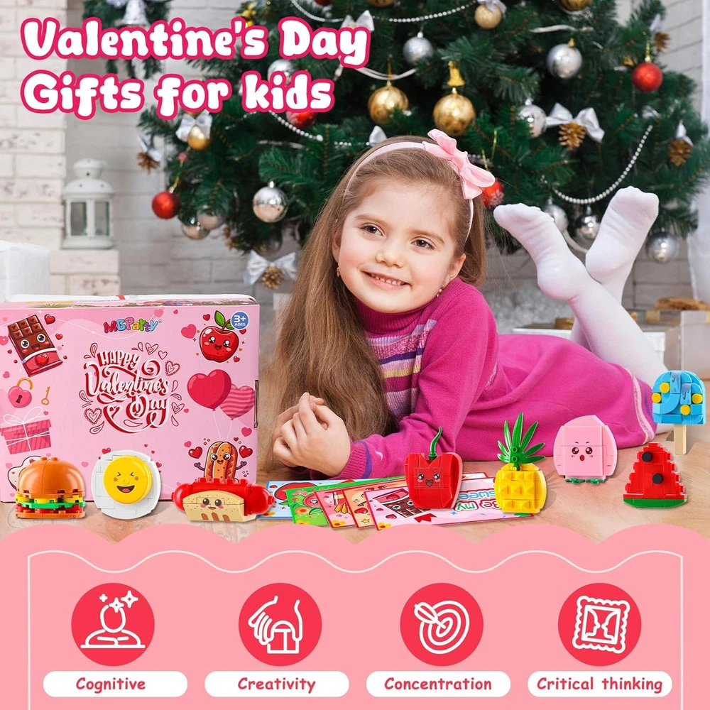 Valentine's Day Party Favors Set: Includes 30 adorable building blocks shaped like hamburgers, chocolates, French fries, hot dogs, steamed eggs, ice cream, peaches, pineapples, watermelons, and apples, perfect for kids' Valentine's Day themed parties. Accompanied by Valentine's Cards and Transparent Bags: Valentine's building blocks set comes with 30 Valentine's cards and 30 transparent bags, allowing your little ones to easily share these fun blocks and cards as gifts. Fun Classroom Activities for Valentine's Day: Kids can unleash their creativity by assembling the blocks, enjoying hands-on fun while developing teamwork and communication skills. Suitable for Multiple Occasions: Ideal for use in classrooms, Valentine's Day parties, birthday celebrations, and holiday events, making it the perfect small gift for classmates and friends. Safe Materials for Family Fun: All Valentine's blocks are made from safe and eco-friendly materials, ensuring children's health and safety, and are suitable for interactive games that parents can enjoy with their kids. Product Description MGparty 30PCS Valentines Day Gifts for Kids Classroom-Valentines Building Blocks Valentines Day Gifts,Valentines For Kids Classroom Valentines Cards For Kids Classroom,Valentine's Day Gift Kids Valentines Day Gifts For School,Valentines For Class Class Valentines Day Gifts For Kids,Valentines Day Gifts For Kids Classroom 30 Pack Valentine's Day Cards Building Block for Kids The video showcases the product in use. The video guides you through product setup. The video compares multiple products. The video shows the product being unpacked.