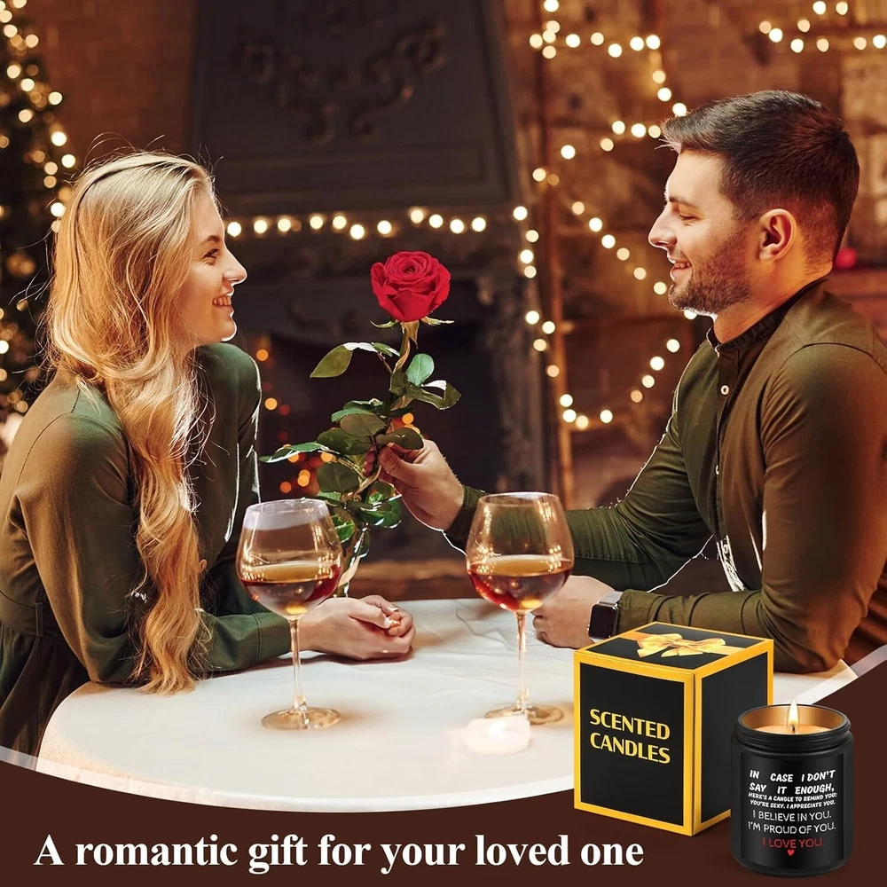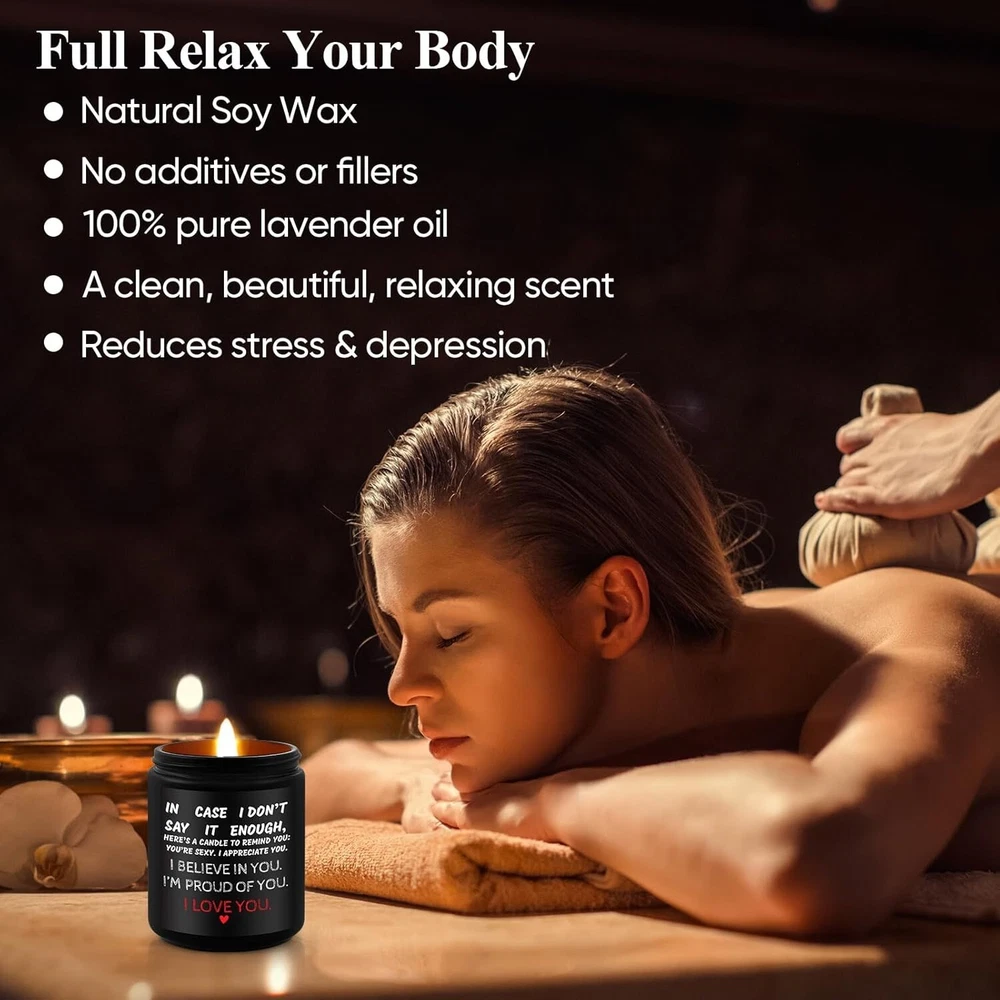 Valentines Day Gifts for Her, Him, Vanilla Lavender Scented Anniversary Candle Gift for Couples - Ideal for Weddings, Christmas, Birthdays, or Engagement - Gift Ideas for Him, Her, Husband, Wife Description: Expressive Romantic Candle Gift: Show your appreciation with a candle that says it all. Featuring the message “IN CASE I DON’T SAY IT ENOUGH, HERE’S A CANDLE TO REMIND YOU: YOU’RE SEXY. I APPRECIATE YOU. I BELIEVE IN YOU. I’M PROUD OF YOU. I LOVE YOU,” this is a sentimental gift for him and her and a perfect anniversary gift for couples. Ideal Engagement or Wedding Gift: This candle makes a thoughtful engagement gift for couple or wedding gift idea, ideal for celebrating relationship milestones with a lasting expression of love and support. Lavender Scented Candle for Relaxation: Infused with a soothing lavender aroma, this lavender scented candle is perfect for creating a relaxing, intimate atmosphere, making it an ideal romantic candle gift. Pe rsonalized Anniversary and Milestone Gift : Perfect for special occasions, this candle is a unique personalized anniversary gift and a funny couple gift that balances sentimentality and humor for meaningful gifting. Versatile for Any Occasion: Whether for an anniversary, birthday, or just because, this candle is a versatile choice. It’s a sentimental gift for him and her that celebrates love in an elegant, heartfelt way. Celebrate love with this Romantic Lavender Scented Candle, a thoughtful gift for anniversaries, weddings, or any special occasion. Featuring the heartfelt message “IN CASE I DON’T SAY IT ENOUGH…”, this candle is the perfect way to express appreciation and affection. Infused with a soothing lavender scent, it creates a relaxing and intimate atmosphere. Ideal as an engagement gift, wedding gift, or a personalized anniversary gift, it blends sentimentality and humor, making it a unique couple gift. Versatile for any occasion, this candle is a sentimental gift for him and her, designed to celebrate love and strengthen bonds.