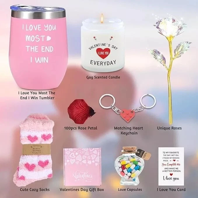 About this item 【Valentine's Day Gifts For Her】 Hello, romantic lovebirds! As Valentine's Day approaches, let your love shine bright with every virtual hug and message shared across the miles. Let Ithmahco guide you to a collection of special galentines gifts that will elevate this romantic season into a magical chapter of your love story! valentines day gifts for her wife includes: The Best Thing I Found On The Internet tumbler, love capsule, scented candle, love card, pink socks, Gold Foil Roses. 【Girlfriend Valentine's Day Gifts】 Embrace the sweetness of the season with a valentines gifts for women that bridges the distance and kindles the flames of love. The "You're The Best Thing I Found On The Internet" Tumbler will be a constant reminder of your unique connection with every sip she takes. The Love Capsule is a treasure trove of shared memories and promises, waiting to be opened on special days. 【Cute Valentine's Day Gifts For Her】 Illuminate her space with the warm glow of a scented candle, symbolizing the serendipity of your union. Let the exquisite Gold Foil Roses stand as a testament to your eternal love, just like the enduring bond you share. Pink socks embody the sweetness and coziness between you, wrapping her in love with every step she takes. 【Couples Valentine's Day Gifts】 Express your deepest affections with a heartfelt card, allowing your tenderness to envelop her in warmth. Scatter the 100 rose petals to adorn your romantic moments with charm and passion, creating an ambiance of love wherever she goes. Despite the challenges, your unique online romance thrives on love and connection. 【Best Valentine's Day Gifts For Her】 Ithmahco's wife valentines day gifts boxes not only boast a beautiful exterior but also uphold stringent quality standards, ensuring that the lucky recipient is dazzled and left with an unforgettable impression. Say no to disappointing boxes filled with subpar items from stores. Present it as is, radiating love and thoughtfulness this Valentine's Day. It also doubles as a perfect anniversary gift! 【Arrives Before Valentine's Day】 Why wait? Order now and select a valentines gift basket for her, making this romantic season in 2025 one she'll cherish forever! In case of any concerns, feel free to reach out to Ithmahco's 24/7 customer support for prompt assistance. Don't forget to add a personal touch with a customized message for an unforgettable Valentine's Day moment! Shipping We offer FREE shipping on all orders! We ship within Three business days of payment, usually sooner. We use a selection of shipping services such as UPS, FedEx, USPS etc. We only ship to the lower 48 states, no APO/FPO addresses or PO Boxes allowed. Local pickups and combined shipping options are not provided at this time. Return You can return a product for up to 30 days from the date you purchased it. Any product you return must be in the same condition you received it and in the original packaging. Please keep the receipt. Payment We accept payment by any of the following methods: PayPal Please pay as soon as possible after winning an auction, as that will allow us to post your item to you sooner! Feedback Customer satisfaction is very important to us. If you have any problem with your order, please contact us and we will do our best to make you satisfied. Contact Us If you have any queries, please contact us via ebay. We usually respond within 24 hours on weekdays. Please visit our eBay store to check out other items for sale! Thank you for shopping at our store. Disclaimer We are working with different suppliers in USA to deliver the item to your doorstep. If you have any issues regarding the item, Feel free to ask.