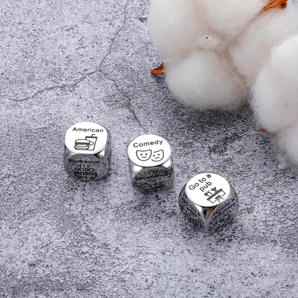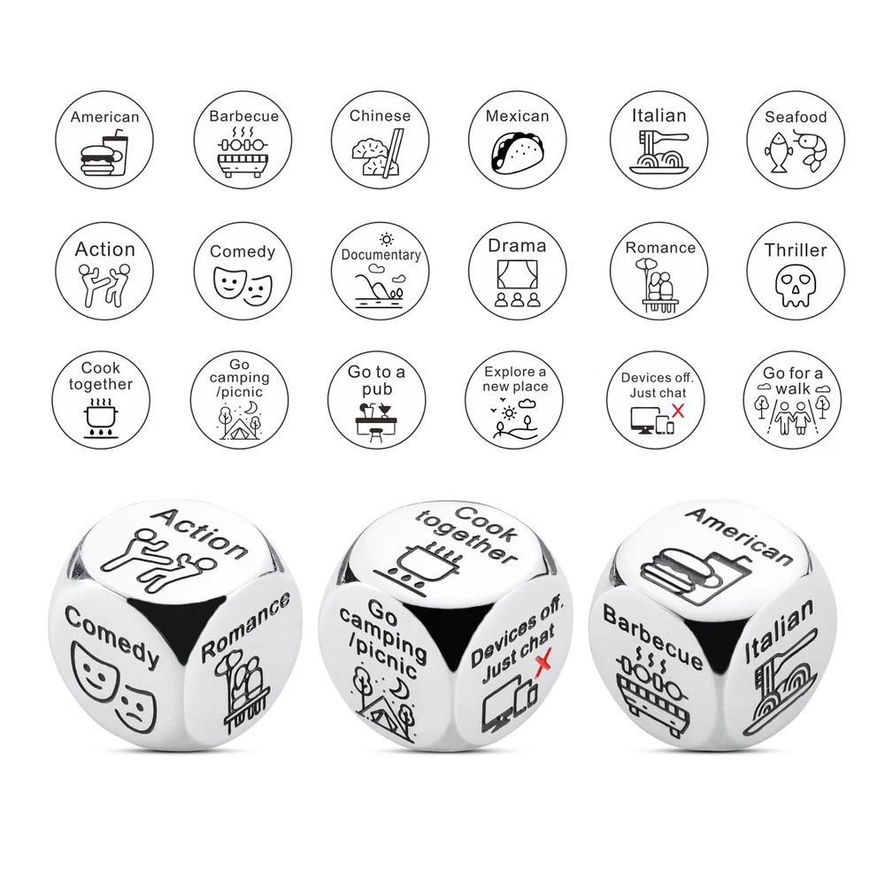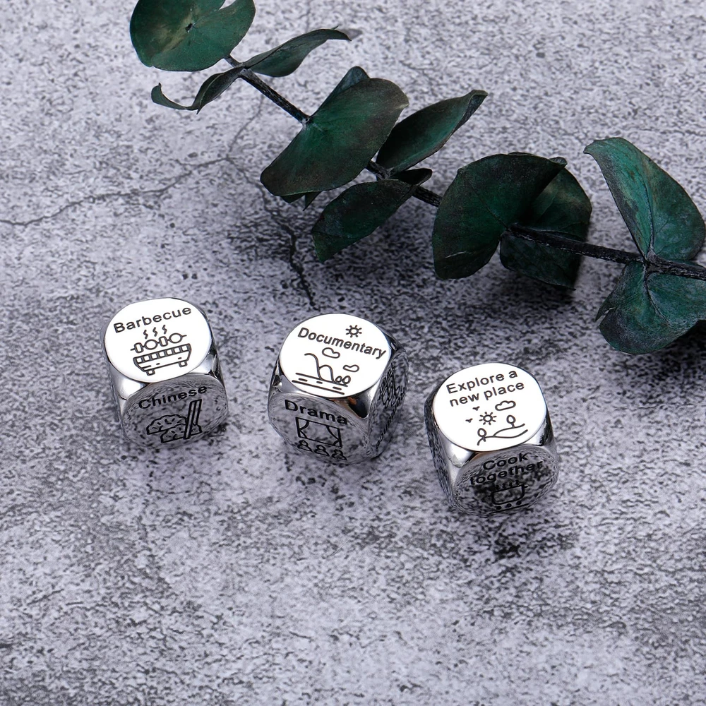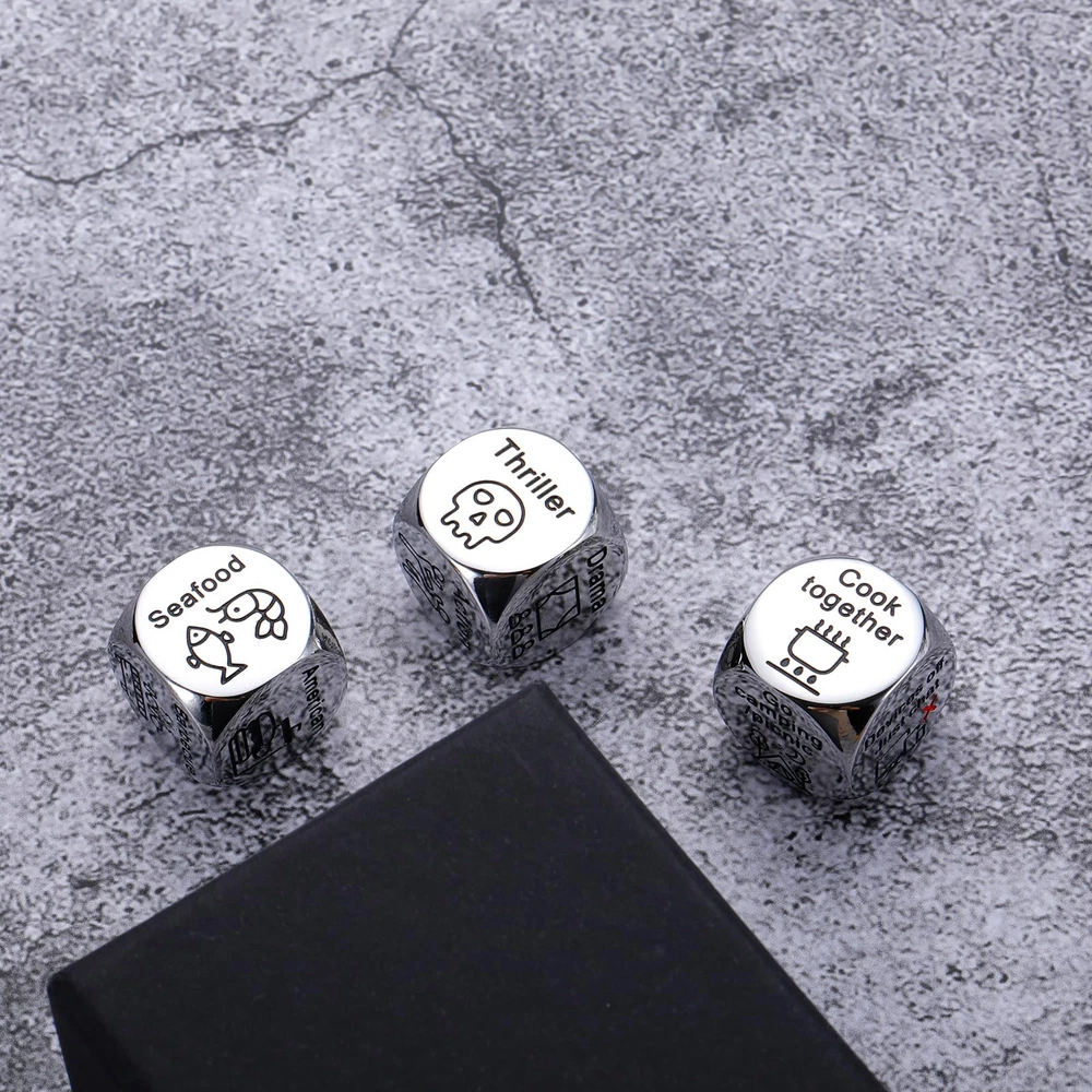 ❤Romantic Date Night Gift Ideas: These couples dice can solve the “what should we do?” question on many dates, just roll the dice and let it decide your date ideas. Funny gift for man woman in Valentine's Day, anniversary gifts for couples, husband or wife, wedding gift for couple, engagement wedding gift for bride and groom, great boyfriend Husband Christmas gifts, sweetest day gift for boyfriend girlfriend, boo basket stuffers for her him, halloween basket stuffers for boyfriend girlfriend. ❤Anniversary Gifts for Boyfriend Husband: It is a nice anniversary gift for couple, anniversary gifts for husband, men gifts for anniversary husband, 1 year wedding anniversary gifts for her, 15 year anniversary gift, perfect anniversary gift for her, one year anniversary gifts for girlfriend, 1 year anniversary gifts for boyfriend, 1 year boyfriend anniversary gift, 11 year anniversary gifts for him, 11 year anniversary gifts for her, steel anniversary gifts for him, anniversary gift from wife. ❤Funny Valentines Gifts for Him: This cute dice is perfect for Valentines Day, Christmas Day, Wedding anniversary, birthday, Easter, Spouse's Day, Sweetest Day, National Boyfriend's Day, Thanksgiving Day. Deployment gift for boyfriend, long distance relationship gifts for him. A cute reminder for him that you love him. Husband gifts from wife. Anniversary gifts for him, birthday gifts for men, special gifts for him, wedding anniversary gifts for your man. ❤Birthday Anniversary Gifts for Him Her: Romantic gifts for girlfriend boyfriend wife Husband birthday gifts, birthday presents for my girlfriend, my man,future husband wife,husband wife to be, things to get your boyfriend for valentines day,sweet gift idea for fiancee,fiance,handsome,hubby,sweetheart,BF,GF,honey,spouse,Boo,bride. A great anniversary traditional gift for celebrating the first year of marriage. Great bday,Christmas,Thanksgiving,National Boyfriend's Day, Spouse's Day. ❤Nice Holiday Gift Idea for Friends: Funny gift for funny an women men, female male, her him; practical gift idea for friends, best friends,besties,BFF, close friend, classmates, roommates. Great work gifts for office work friends, work bestie, workmate, colleagues, employee, groups of coworkers, departing co-workers, retiring co-worker on Employee Appreciation Day, Boss Day, Admin Day, Labour Day, coworker gifts for office staff, Christmas gifts for coworkers women, staff appreciation gifts. ❤Package Includes: You will receive 1 food cube (6 cuisines: American; Barbecue; Chinese; Mexican; Italian; Seafood); 1 movie dice (6 cuisines: Action; Comedy; Drama; Documentary; Romance; Thriller; 1 activity dice (6 cuisines: Cook together; Go camping/picnic; Go to a pub; Explore a new place; Devices off; Just chat; Go for a walk) ❤Material: The dice are made of premium stainless steel, not bend or break easily; eco-friendly material, no harm, nickel-free, and never cause any allergy. Engraved words are deep and easy to read. Our dice is wrapped with protective film, and will be shipped in a beautiful gift box with our logo, ready for giving. ❤Service: If you are not satisfied with our products, you can contact us by email and we will solve the problem for you. Your satisfaction is the driving force of our work.