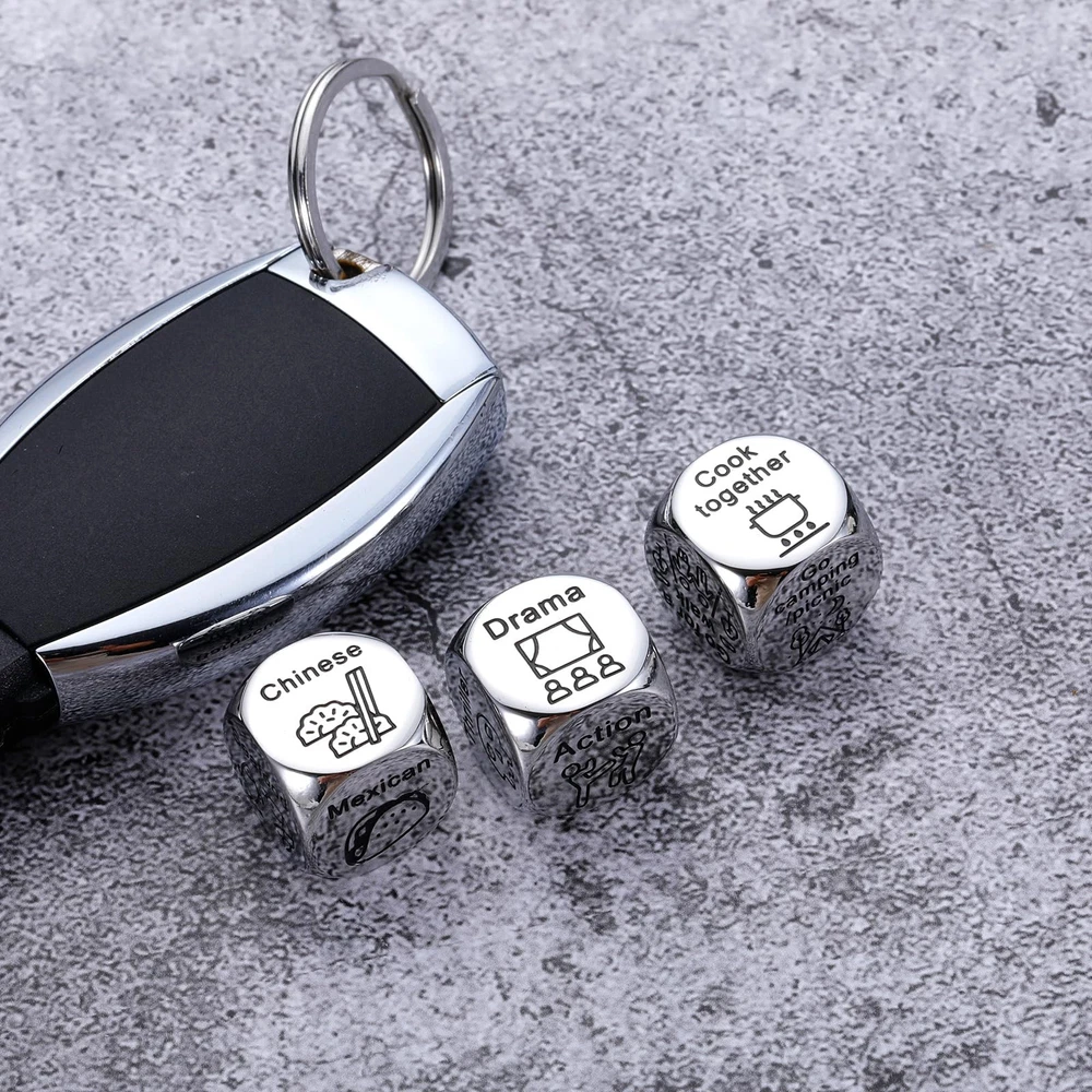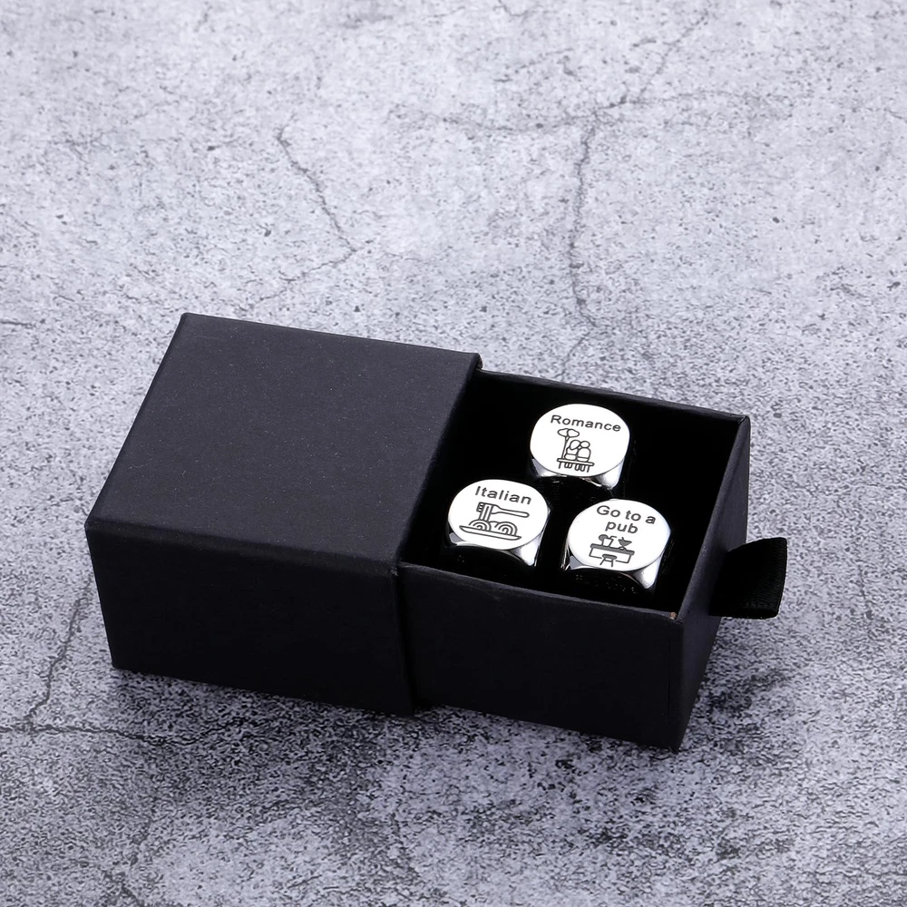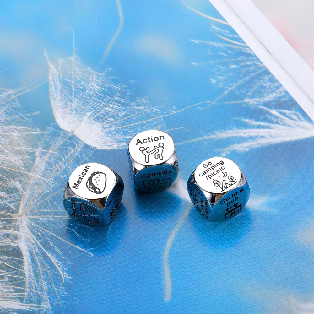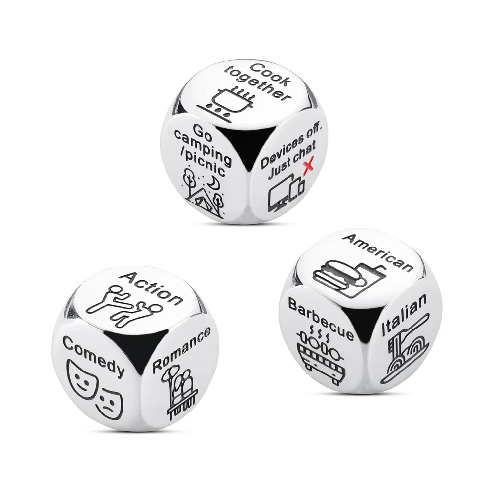 ❤Romantic Date Night Gift Ideas: These couples dice can solve the “what should we do?” question on many dates, just roll the dice and let it decide your date ideas. Funny gift for man woman in Valentine's Day, anniversary gifts for couples, husband or wife, wedding gift for couple, engagement wedding gift for bride and groom, great boyfriend Husband Christmas gifts, sweetest day gift for boyfriend girlfriend, boo basket stuffers for her him, halloween basket stuffers for boyfriend girlfriend. ❤Anniversary Gifts for Boyfriend Husband: It is a nice anniversary gift for couple, anniversary gifts for husband, men gifts for anniversary husband, 1 year wedding anniversary gifts for her, 15 year anniversary gift, perfect anniversary gift for her, one year anniversary gifts for girlfriend, 1 year anniversary gifts for boyfriend, 1 year boyfriend anniversary gift, 11 year anniversary gifts for him, 11 year anniversary gifts for her, steel anniversary gifts for him, anniversary gift from wife. ❤Funny Valentines Gifts for Him: This cute dice is perfect for Valentines Day, Christmas Day, Wedding anniversary, birthday, Easter, Spouse's Day, Sweetest Day, National Boyfriend's Day, Thanksgiving Day. Deployment gift for boyfriend, long distance relationship gifts for him. A cute reminder for him that you love him. Husband gifts from wife. Anniversary gifts for him, birthday gifts for men, special gifts for him, wedding anniversary gifts for your man. ❤Birthday Anniversary Gifts for Him Her: Romantic gifts for girlfriend boyfriend wife Husband birthday gifts, birthday presents for my girlfriend, my man,future husband wife,husband wife to be, things to get your boyfriend for valentines day,sweet gift idea for fiancee,fiance,handsome,hubby,sweetheart,BF,GF,honey,spouse,Boo,bride. A great anniversary traditional gift for celebrating the first year of marriage. Great bday,Christmas,Thanksgiving,National Boyfriend's Day, Spouse's Day. ❤Nice Holiday Gift Idea for Friends: Funny gift for funny an women men, female male, her him; practical gift idea for friends, best friends,besties,BFF, close friend, classmates, roommates. Great work gifts for office work friends, work bestie, workmate, colleagues, employee, groups of coworkers, departing co-workers, retiring co-worker on Employee Appreciation Day, Boss Day, Admin Day, Labour Day, coworker gifts for office staff, Christmas gifts for coworkers women, staff appreciation gifts. ❤Package Includes: You will receive 1 food cube (6 cuisines: American; Barbecue; Chinese; Mexican; Italian; Seafood); 1 movie dice (6 cuisines: Action; Comedy; Drama; Documentary; Romance; Thriller; 1 activity dice (6 cuisines: Cook together; Go camping/picnic; Go to a pub; Explore a new place; Devices off; Just chat; Go for a walk) ❤Material: The dice are made of premium stainless steel, not bend or break easily; eco-friendly material, no harm, nickel-free, and never cause any allergy. Engraved words are deep and easy to read. Our dice is wrapped with protective film, and will be shipped in a beautiful gift box with our logo, ready for giving. ❤Service: If you are not satisfied with our products, you can contact us by email and we will solve the problem for you. Your satisfaction is the driving force of our work.