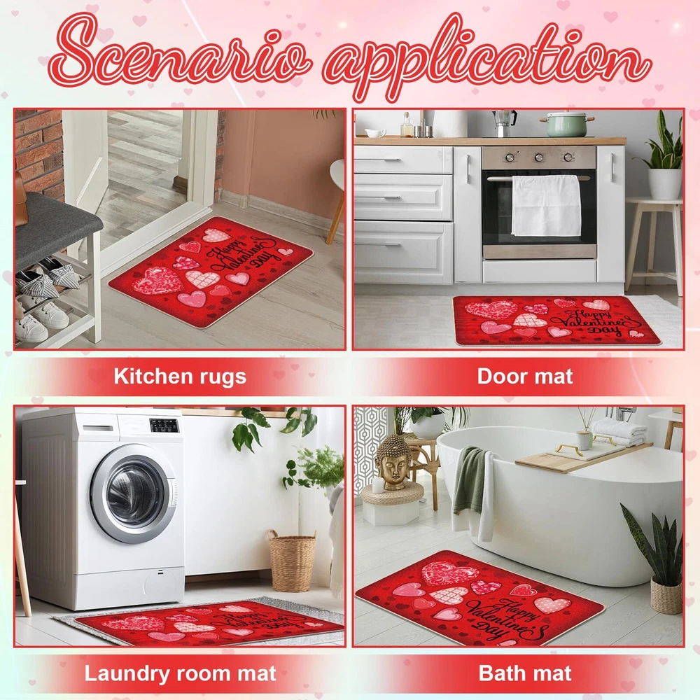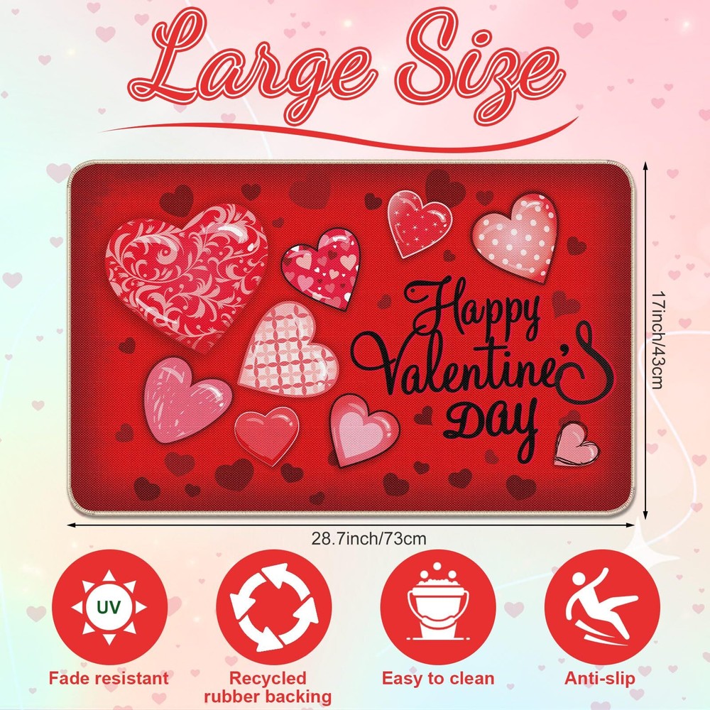 Decorative Mat: the package contains 1 Valentine's Day doormat, beautifully crafted with red heart patterns, and the words [Happy Valentine's Day], which fully meets your decoration needs, adds a festive atmosphere, and brings you convenience and aesthetic enjoyment Ideal Size: valentine decorative door mat measures approx. 17 x 29 inches, this doormat is the ideal size to place in your entryway, keeping a balance between being noticeable and not occupying too much space, making it an eye catching and practical addition to your home, and other places Durable Material: this washable heart floor rug is made of quality linen rubber, robust and enduring, not easy to break, deform, or wear out, can withstand heavy foot traffic over the holiday season, it is suitable for indoors and outdoors for long time use Anti Slip Design: the Valentine's Day flax mat is crafted with an anti slip rubber backing, ensuring safety for steps taken, which makes it a reliable choice for homes, reducing the risk of slipping during the bustling holiday season, keeping your guest safe and festive Cheerful Holiday Spirit: the welcome washable doormat provide a festive upgrade to your decor. The vibrant heart keeps in contrast to the red mat, immediately establishing a merry atmosphere, and leaving a deep impression on your guests