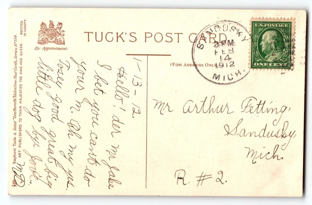 Brand/Publisher: Raphael Tuck & Sons Features: Divided Back Country/Region of Manufacture: Germany Theme: Art, Greetings, Holiday, People, Valentine Greetings Signed: No Year Manufactured: 1912 Occasion: Valentine's Day Original/Licensed Reprint: Original Personalize: No Material: Paper Postage Condition: Posted Artist: Unknown Size: Standard (5.5 x 3.5 in) Unit of Sale: Single Unit Subject: Romance Custom Bundle: No Time Period Manufactured: 1900-1919 Type: Printed (Lithograph) Era: Pre-War (Pre-1914) Number of Items in Set: 1