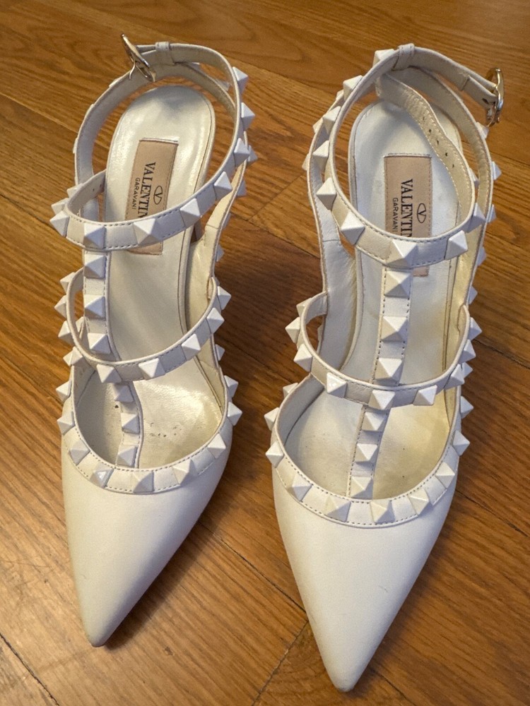 These Valentino Rockstud Heels in off-white are absolutely stunning! The perfect mix of elegance and edge, they instantly elevate any outfit. The 36.5 fits true to size and feels surprisingly comfortable for heels this chic. The iconic stud detailing adds just the right amount of glam without being overpowering. I love how versatile they are - equally perfect with jeans for brunch or a little black dress for date night. The quality is impeccable, exactly what you'd expect from Valentino. After wearing them all night, my feet weren't screaming to take them off - a miracle for designer heels! Already planning my next outfit to show them off again. Worth every penny for this timeless investment piece.