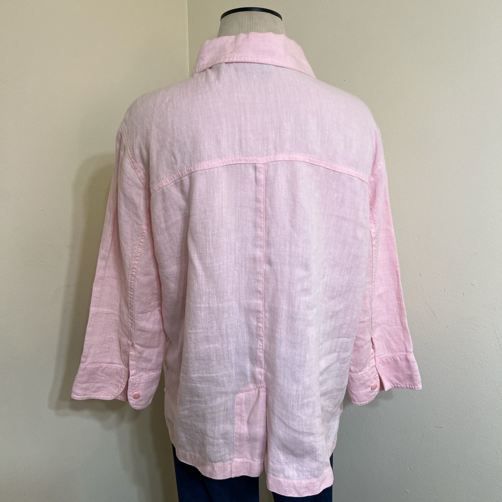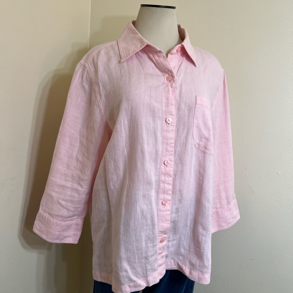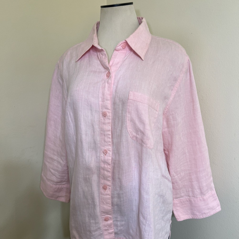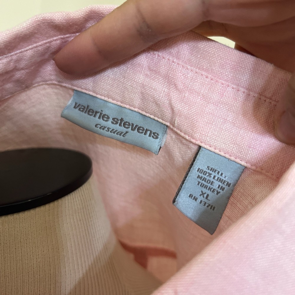Valerie Stevens Pink 100% Linen Button Down Top XL. Super lightweight and breathable, perfect for spring and summer outfits. Measurements: Shoulders: 18 inches Pit to pit: 23 inches Length: 26 inches capsule wardrobe, minimalist, coastal, casual, linen, spring, summer,