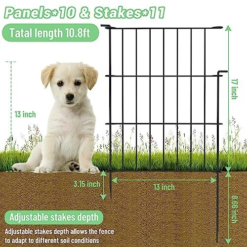 Menu 1. We require immediate payment. 2. We currently accept payment via eBay managed payments only. 3. Once payment is cleared, we will dispatch your shipment within 1-3 business days. Please refer to the "Shipping" tab for more information regarding shipping speed to your destination. Decorative Garden Fence 10 Pack - 17 in (H) x 10.8 ft (L) No Dig Dog Animal Barrier Rabbit Fence Rustproof Metal Wire Panel Border, Animal Ground Stakes Fencing for Garden, Patio Product description Sturdy and Rustproof >> The garden barrier fence is welded with thick metal wire, and the surface is treated with baking paint to prevent rust and is not easy to bend. Product Dimension >> Each metal fence panel measures 17"H x 13"W, a set of 10 panels totals 10.8 feet long when connected. These garden decorative fences can also be extended to different shapes according to your special uses. 【Adjustable stake depth】For flat and solid ground, passing stakes through the four loops on the fence can ensure that the fence is firmly fixed. If the ground is a bit uneven or soft that you can skip the top loop and just use the lower three. That will allow you to get the stake about 8” into the ground. These fences are very sturdy when they are assembled to form a loop, once you get all the pieces hooked together the fence stays up and is sturdy. Multiple Applications >> Multiple uses as decorative garden fences, flower vegetable plant bed protection fences, animal barrier fences, outdoor fence for dogs, temporary fence, fence borders, pet fences, dog fences, courtyard fences, no dig fence etc. 100% Satisfactory Service >> We promise to provide free returns or exchanges. If you have any questions about product quality or installation, please contact us. Do not worry, we are responsible for products, and the Customer Support Team will respond to your message within 24 hours and provide a solution to your problem. Easy to Install >> The dog fences for the yard can be combined repeatedly using the poles in just minutes. You only need to connect the two fences and align the ring, and finally insert the rod into the ring to fix it. PLEASE MESSAGE US IF YOU HAVE ANY OTHER QUESTIONS, AND MANY THANKS FOR READING ALL OF THIS. Copyright ©#. All Rights Reserved.