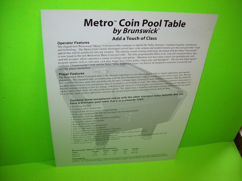 test4 Welcome To Chameleon Collectibles Arcade, Jukebox, Pinball Manuals, Pinball Parts, Pinball Flyers, Video Arcade Flyers, Pinball Machine Translites, Rubber Flipper Rings, Coils, Flippers, Promo Plastics, Posters, & more sold here: Chameleon Collectibles Store DESCRIPTION Original promotional sales flyer for the above mentioned coin operated amusement pool table. Flyers are paper advertising literature also called a circular, brochure, or flier. All are single sheets unless noted otherwise. If there is artwork on the back side it will be shown. Size is 8.5" X 11". Plastic sheet protector included with each flyer sold. Orders are shipped with care. PAYMENT Paypal accepted. Payment is due within 5 days of auction close. SHIPPING Buyer pays shipping and handling for the first item. Additional items will be free or discounted if combined and paid at once. USA estimated delivery 2-5 business days. International estimated delivery: First Class Mail International = 14-30 business days. Priority Mail International = 10-14 business days. Import duties, taxes, and charges are the buyer's responsibility if a pplicable. Any fees required are not from Chameleon Collectibles they are from your countries customs department. Total value will be shown on customs forms less the postage paid. Items can not be marked as gift on customs forms. COMBINED SHIPPING Important: Please use the eBay cart to bundle and save on your orders. You must add all items to cart and make a single payment to get promo offers and shipping discounts if offered. Best offer sales do not qualify as they are already discounted. ABOUT US Selling on Ebay since 1997. Check our feedback. C hameleon Collectibles Store Seller Of Original Pinball Flyers, Video Arcade Flyers, Pinball Machine Translites, Jukebox Flyers & Manuals, NOS Parts, Pinball Coils, Flippers, Pinball & Arcade Game Service Manuals, Promo Plastics, Posters, And Related Items For The Coin-Op Hobby. Special Categories Can Be Found Such As Sci-Fi, Super Hero, Horror, Halloween, Rock And Roll Music, Atari, Bally, Capcom, Data East, Gottlieb, Midway, Namco, Nintendo, Sega, Stern, Williams. Popular Game Titles Are In Stock Including; Pac-Man, Elvira Scared Stiff, Funhouse, Asteroids, Marvel Vs Capcom, Centipede, Star Trek, Haunted House, AC/DC, Monster Bash, Addams Family, X-Men, Donkey Kong, Star Wars, Creature From The Black Lagoon, Mario Bros, Kiss, Freddy A Nightmare On Elm St, #Pinball #Arcade #Jukebox #ArcadeGame #PinballFlyers #ArcadeFlyers #CoinOp #Flyers #PinballTranslites #PinballCoils #PinballFlyer #VideoGame #Gottlieb #Bally #Atari #Amusements #PinballArt #ClassicArcade #VintagePinball #RetroArcade #Halloween #SlotMachines
