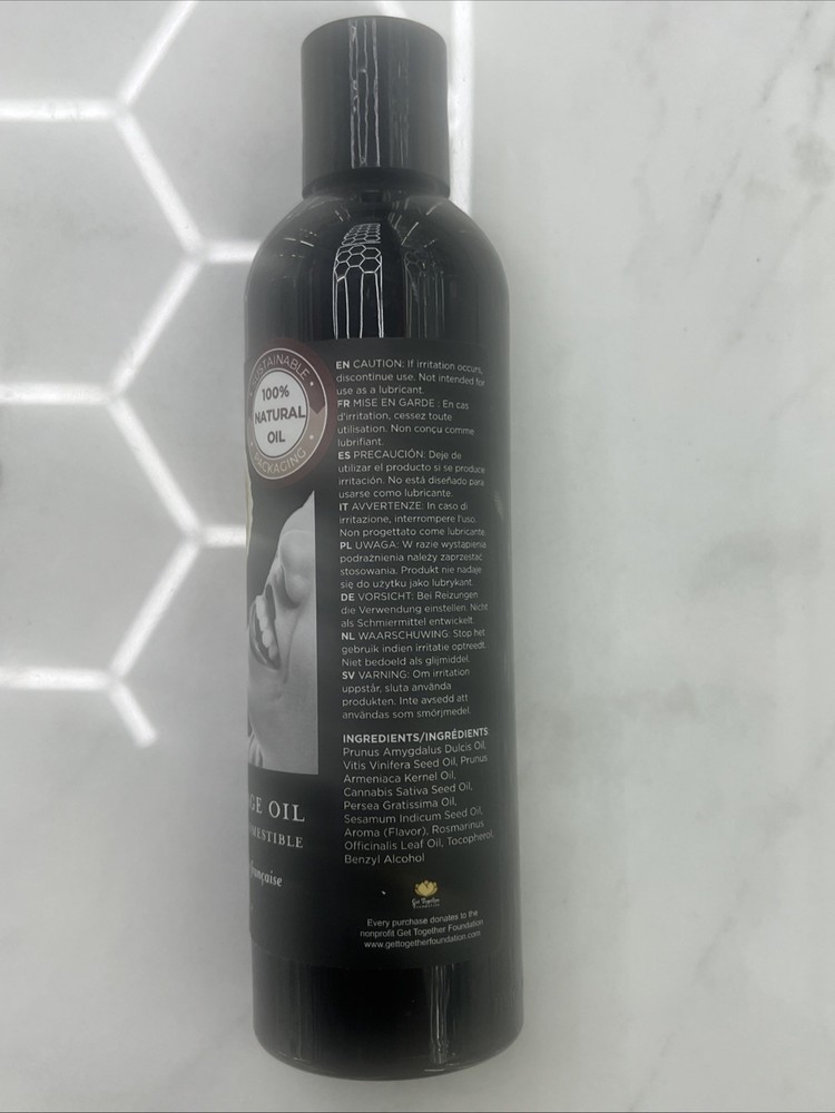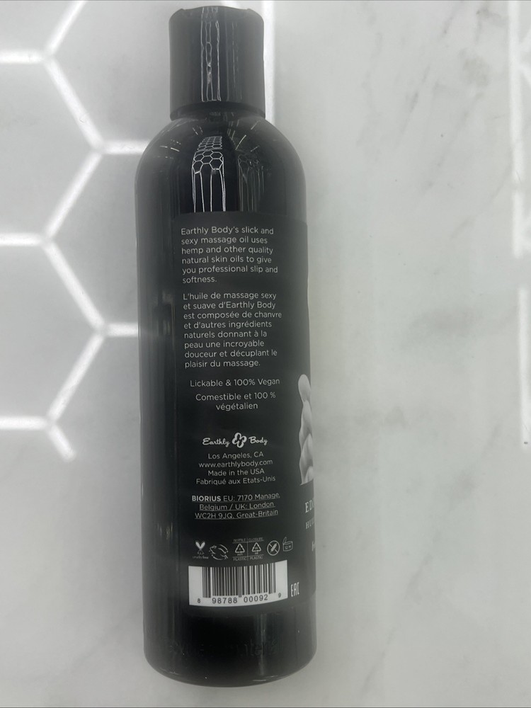 Edible Massage Oil Flavor: French Vanilla Earthly’s Body’s Slick & Sexy Massage Oil Uses Hemp & Other Quality Natural Skin Oils To Give You Professional Slip & Penetrating Softness. Lickable & 100 % Vegan 8 Fl Oz. / 237 mL