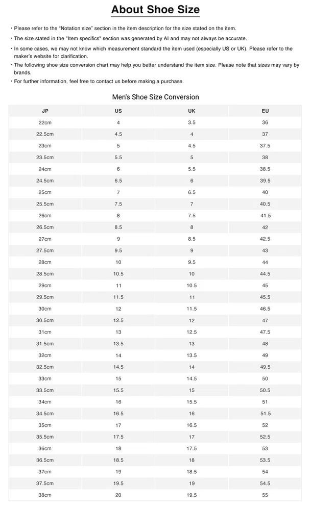 • Before purchasing, please read this page in conjunction with the notes at the bottom of the page, and by placing an order and making payment, you agree to be bound by the product conditions and notes. • International shipping will be facilitated through our central shipping center in Japan. Please allow approximately 10 business days for us to handle the item, from dispatching it from our local store to preparing it for international shipping in our central shipping center. • Tracking number will be provided only after the item reaches our central shipping center in Japan. • Item details and descriptions have been translated by AI, so occasional mistakes may occur. If you encounter any issues, please don't hesitate to reach out to us. PRODUCT INFORMATION Brand VANS Style Sneaker Department Men Type Athletic Color Brown Product Line Others Character Others Vintage No Customized No Theme Others Model Others Country/Region of Manufacture Unknown Shoe Shaft Style Low Top Upper Material See Description US Shoe Size 7 UK Shoe Size 6.5 EU Shoe Size 40 Others ■Product name Vans Vans Low Top Sneakers 25 ■Damage Details There is dirt and wear on the outsole There are threads and dirt on the midsole There is dirt on the laces, opening, inside, and insole There is a slight thread on the tan There are dirt, threads, wrinkles, and loss of shape on the surface ■Item Details Brand: Vans Remarks: Outsole: 27cm Accessories: - *Since this is a used item, accessories such as ribbons and replacement belts may not be available when purchasing a new product. Model Number: V36CF SUEDE Category: Men - Fashion - Shoes - Sneakers - S Color: Brown Other ■Size Details Notation size: 25 Measured size: S Case width 9cm (3.54 in) About size Measurements are taken while lying flat. *Two sizes are listed: the size shown (size announced by the manufacturer) and the measured size (size measured by our company). *We apologize for the inconvenience, but we do not re-measure products once they have been posted. *Please allow slight differences due to measurement size. Material: - *Materials may be described in product images Control number: ITMYGQKW4AR6 [Please note] *Negotiations for price reductions are not accepted. About Us BOOKOFF is one of Japan's leading second-hand chain, with more than 700 stores across the country. We offer a wide selection of premium branded items, including designer bags, wallets, jewelry, watches, fashion clothing, and more. All items will be thoroughly inspected, carefully packed, and shipped directly from Japan. BOOKOFF is also a member of the AACD (Association Against Counterfeit Product Distribution), an organization which aims to prevent the distribution of counterfeit and fraudulent products, hence buyers can purchase genuine brand items with confidence at our store. All of our items are selected and authenticated by professional authenticators to ensure their authenticity. About Payment • Only eBay managed payments are accepted. • We do not do transactions outside of eBay. Shipping & Taxes • Free Shipping Worldwide. • All items will be shipped via Japan Post with tracking service (EMS or ePacket). • All orders will be shipped from Japan to the registered address on the buyer's eBay account. • Shipments may be delayed due to bad weather, public holidays, customs office delays, and other conditions beyond our control. • All customs duties, import taxes or related fees occurred during shipping are the responsibilities of the buyer. If you have any concerns, please inquire directly with your local customs office before making a purchase. Return & Cancellation Policy • All listed items are also available at our retail store and multiple online platforms in Japan. In the event that an item is out of stock or sold, we will issue a cancellation along with a full refund. • If you wish to return an item for a refund, please contact us directly before initiating a return or opening a case. • For damaged items or discrepancies with the item description, please reach out to us directly within 10 days of receiving the item, providing pictures of the damaged area or issues. • Unless the item is damaged or does not match its description, buyers will be responsible for the return shipping fee. > All returns must be shipped to our address in Japan with a tracking number. > Refunds will be processed once the returned item has arrived safely. • Buyers who violate eBay policies or misuse eBay's Money Back Guarantee will be reported and blocked from future purchases. click here to see our store