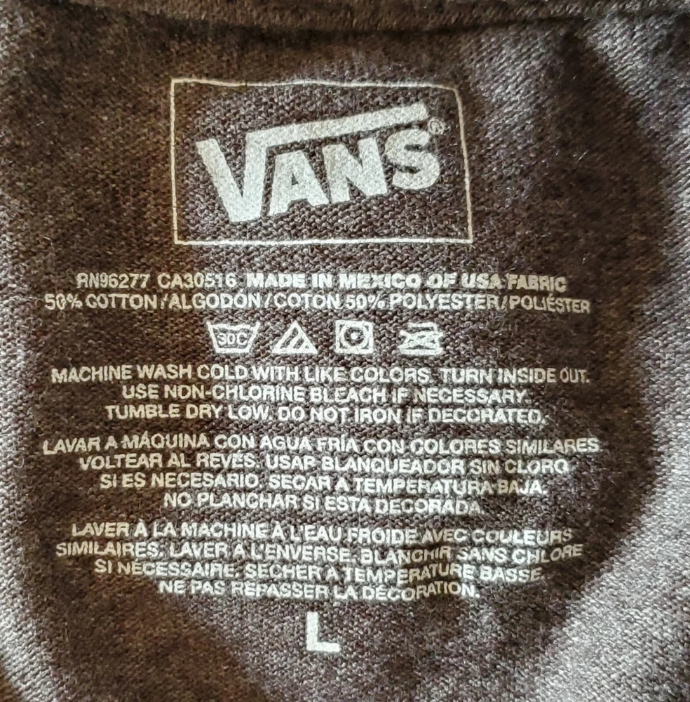 This Vans men's T-shirt is a must-have for any skateboarder or fan of classic retro style. Made from a comfortable cotton blend knit fabric, this shirt features a crew neck and short sleeves for a relaxed fit. The graphic print logo adds a touch of personalized flair to the brown color shirt. Easy to care for and suitable for all seasons, this T-shirt is perfect for any casual occasion. Available in size L, this regular fit shirt is an authentic Vans product, made in Mexico. Add this skate wear to your collection today!
