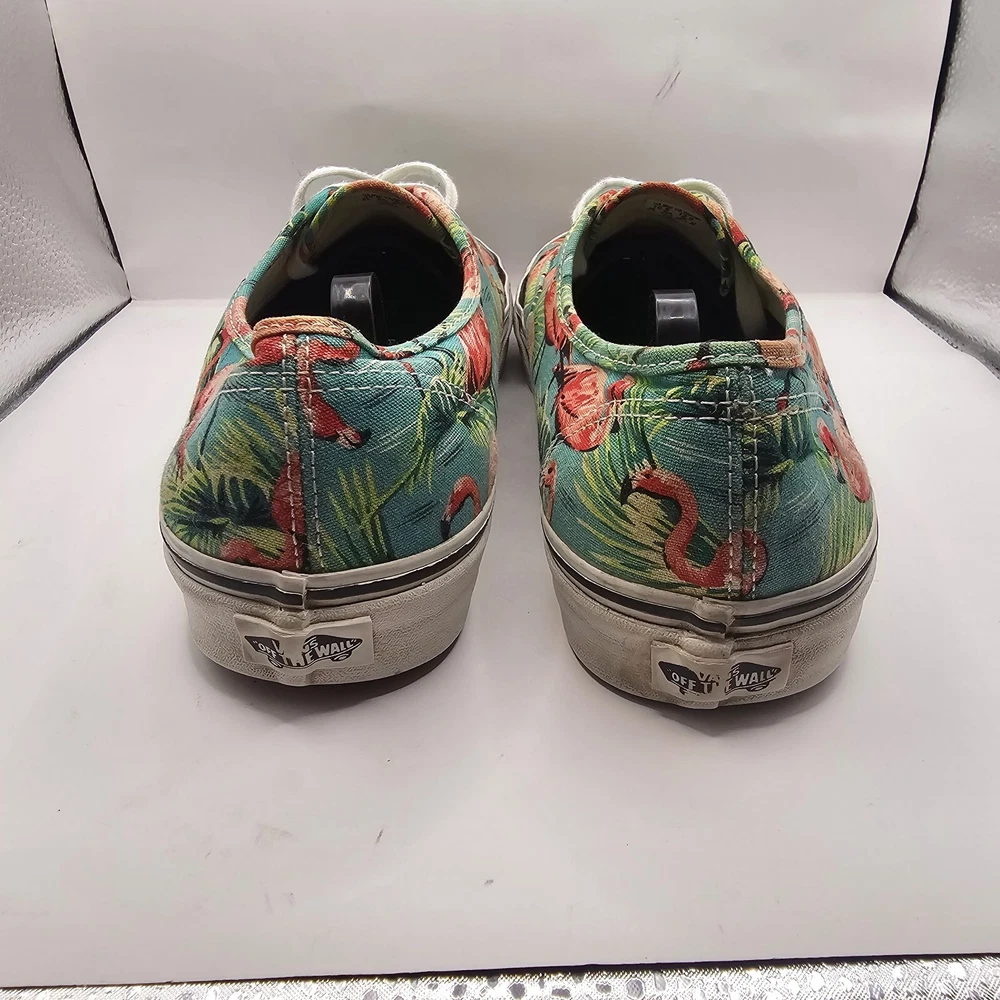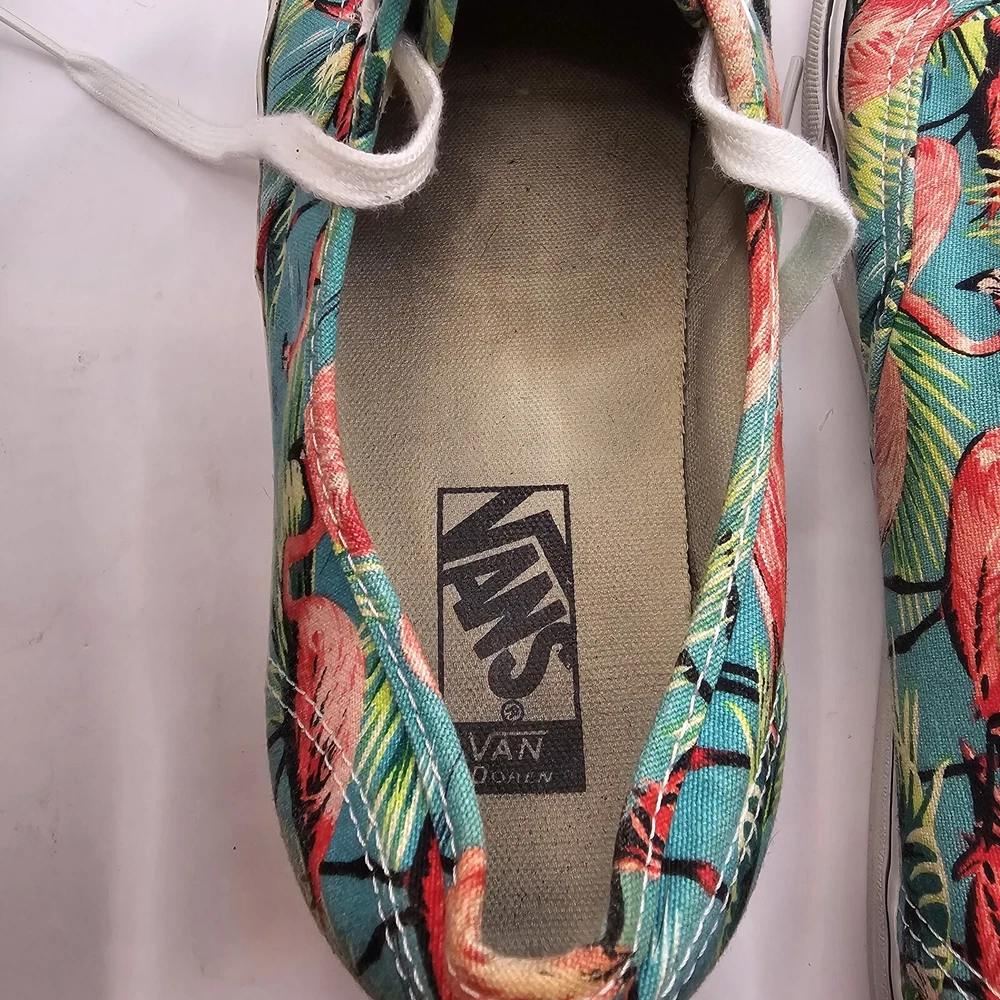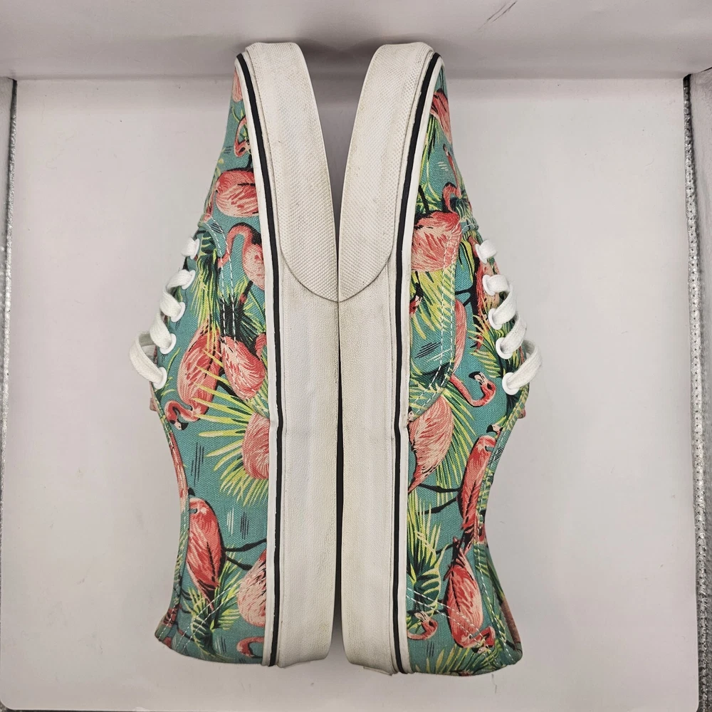 Vans Off the Wall Pink Flamingo & Palm Trees Skate Shoes Men’s Size 10.5 W 12 Midsole and outsole has some wear and staining. Print has some fading.