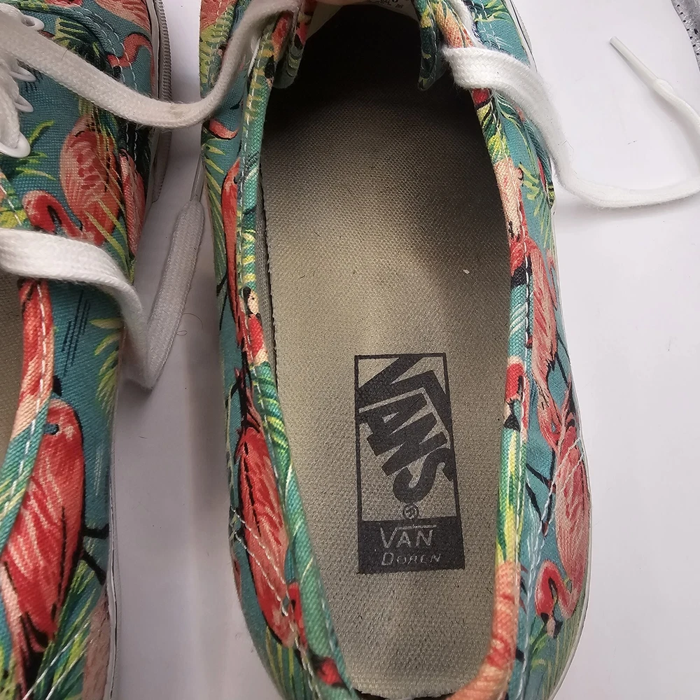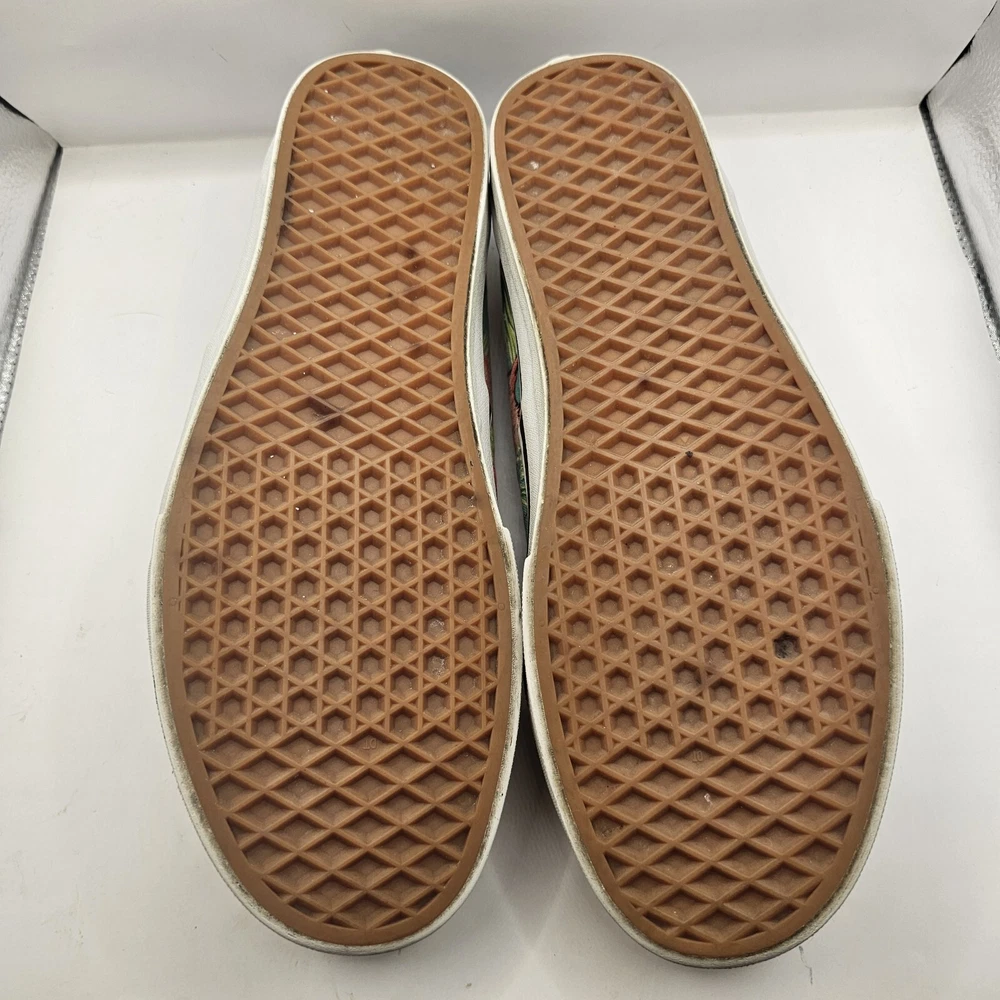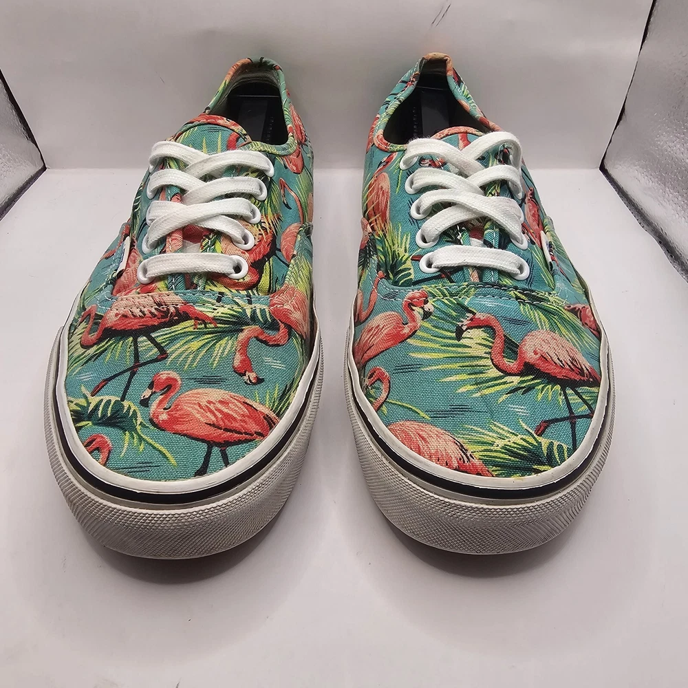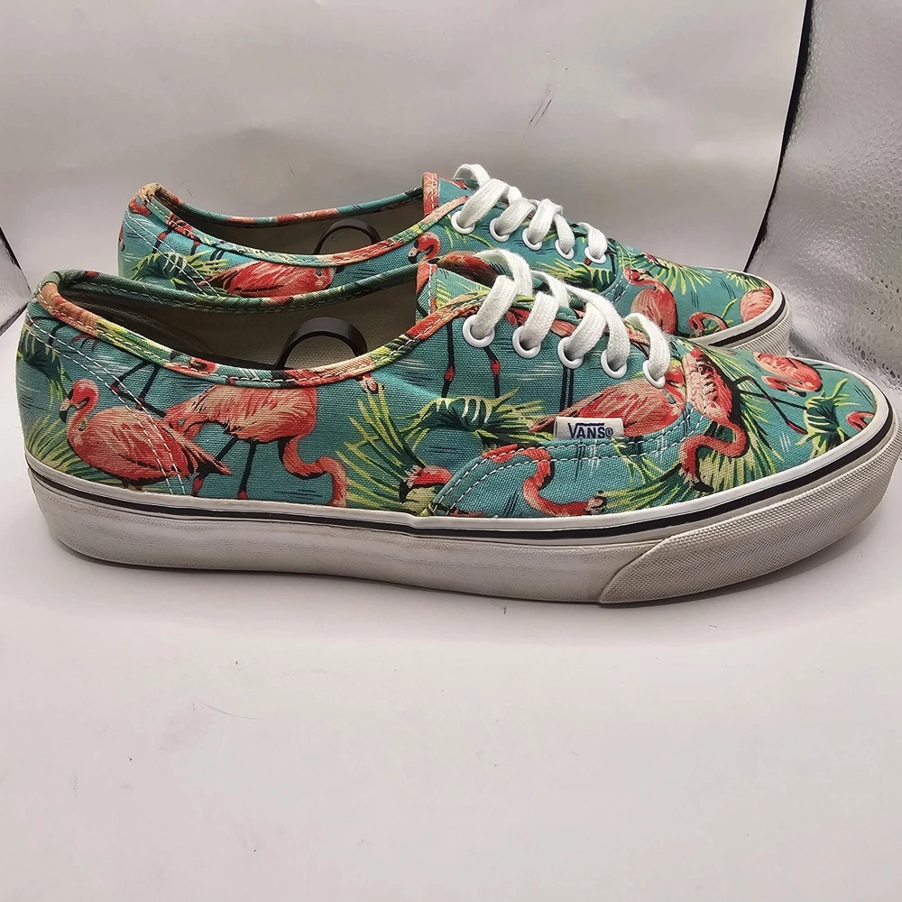 Vans Off the Wall Pink Flamingo & Palm Trees Skate Shoes Men’s Size 10.5 W 12 Midsole and outsole has some wear and staining. Print has some fading.