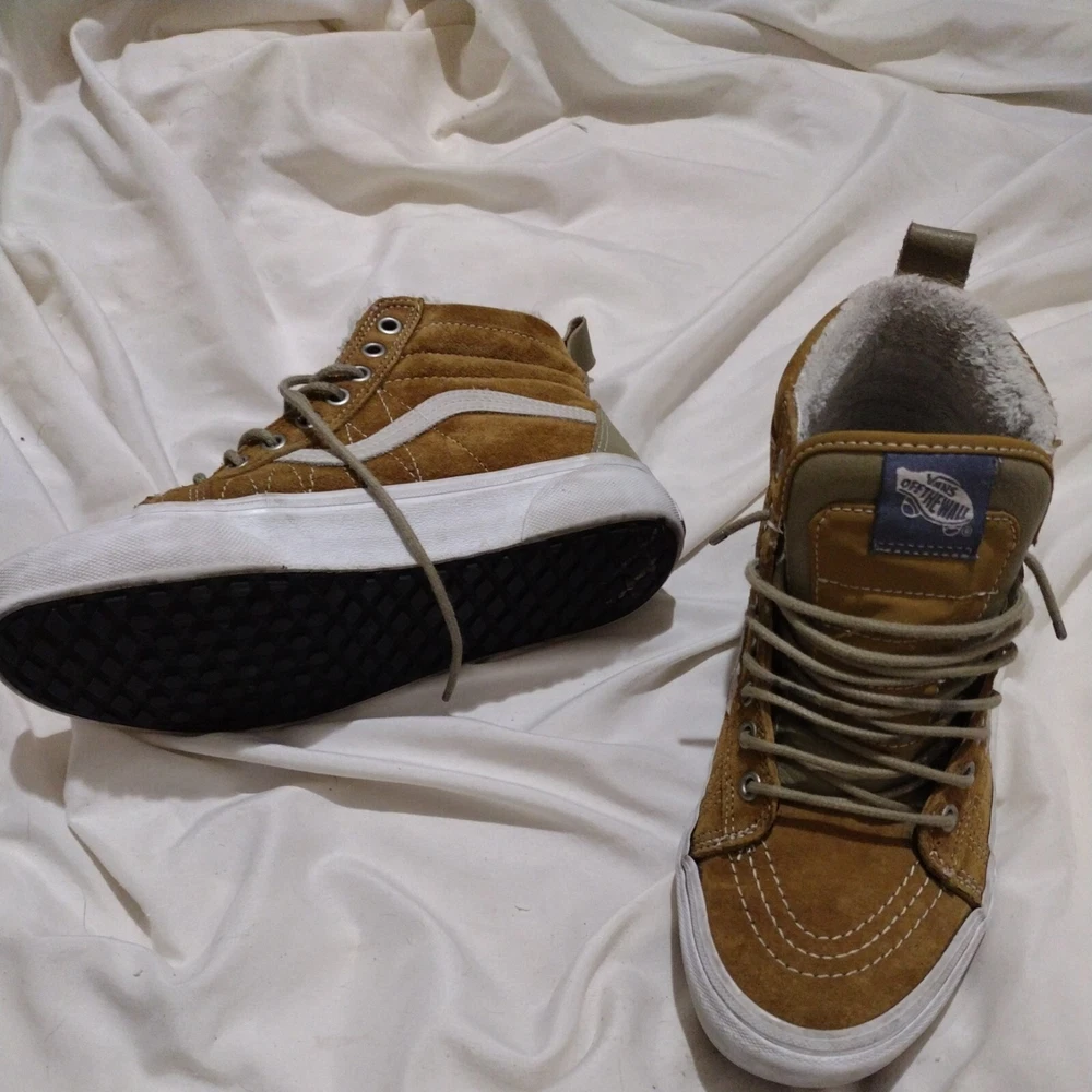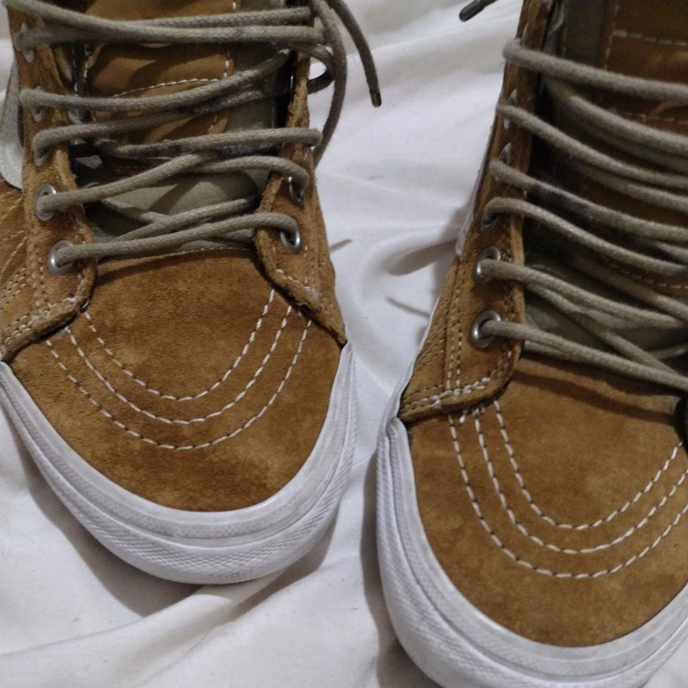 Everything looks close to new including the soles, tan material and the faux . The white rubber could use some dishwashing liquid with a toothbrush. It doesnt look lke these shoes were used very much. Elevate your sneaker game with these Vans SK8-Hi Tan Suede Faux Fur Sherpa Lining sneakers. With a high top shoe shaft style and a striking red color, these sneakers are a must-have for any fashion-forward woman. The faux suede outsole material and faux fur upper material provide durability and comfort, while the scotchguard feature ensures easy maintenance. These athletic sneakers are perfect for any casual occasion, and the size 8 women's shoes and 7.5 US shoe size make them a great fit for most women. The Vans SK8 model is a classic, and these sneakers are part of the VANS Sk8 product line. Don't miss out on the chance to add these stylish sneakers to your collection.