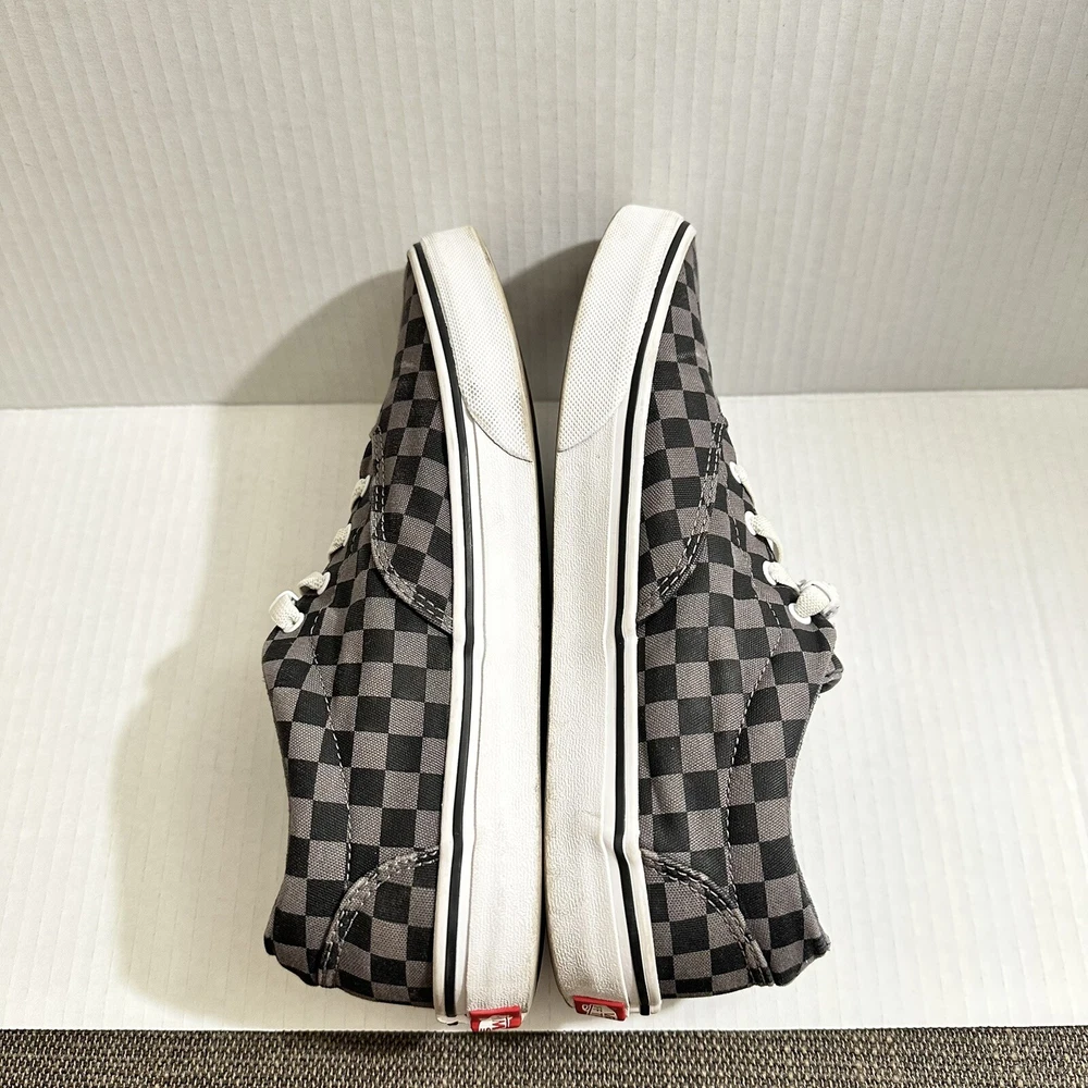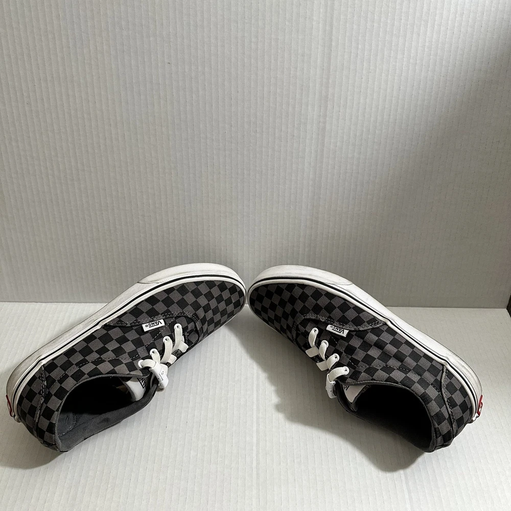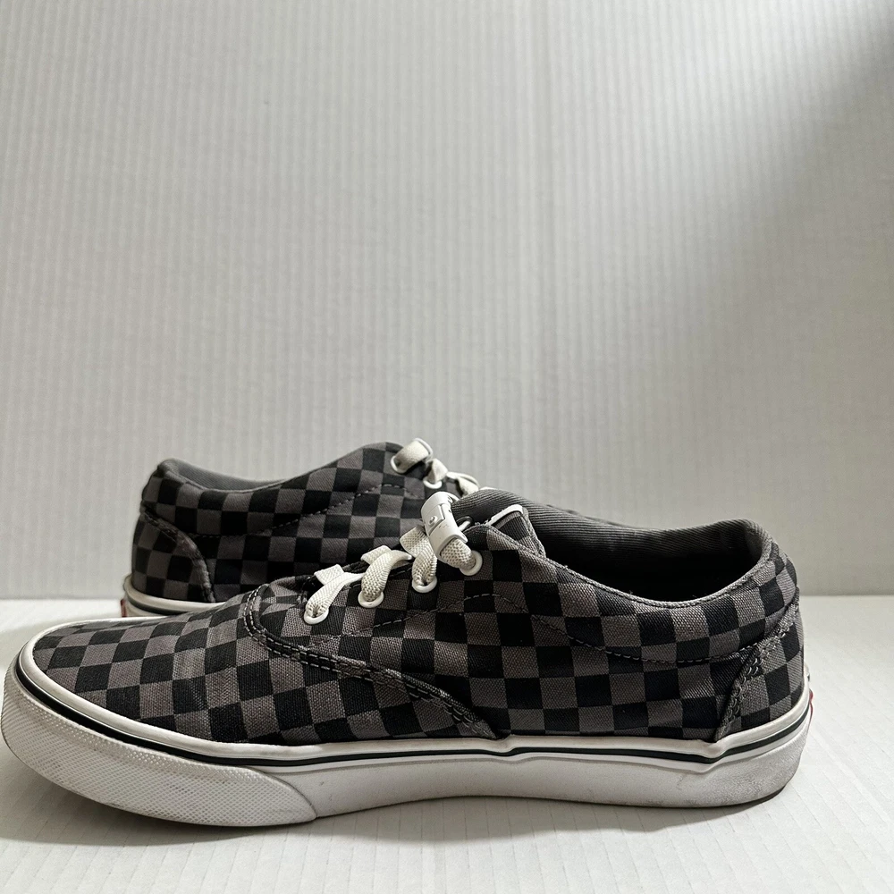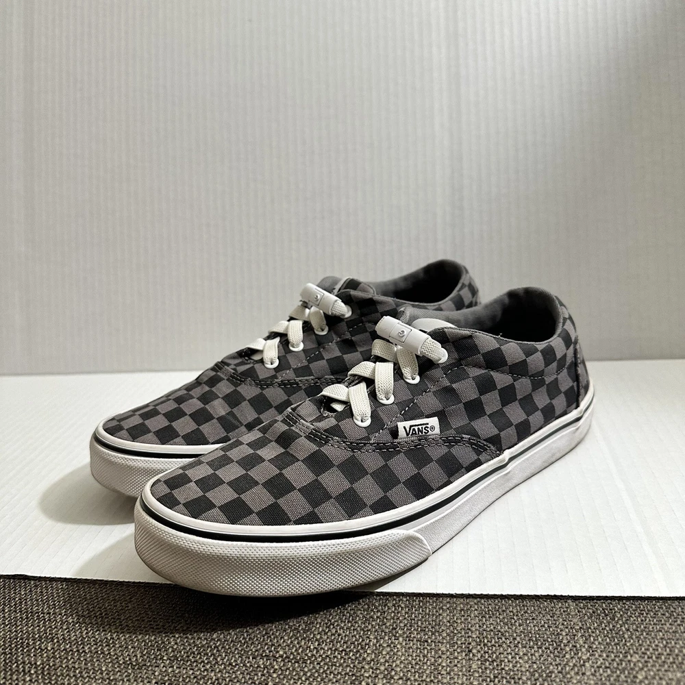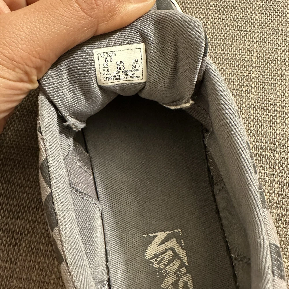 The product is a Vans Old Skool sneaker in black and gray, featuring a checkered pattern on a canvas upper material. Designed for youth and teens, this casual lace-up shoe is a low skate sneaker style that is both stylish and comfortable. The size is a US Youth 6, ideal for younger individuals looking for a trendy and versatile footwear option. Lace changed