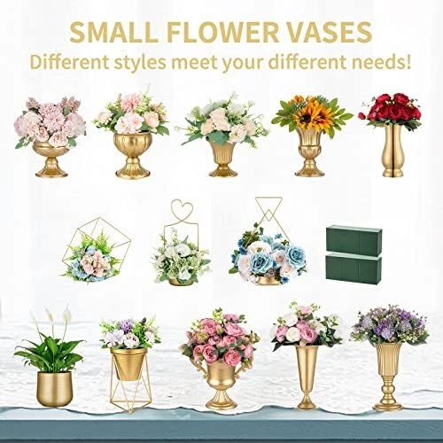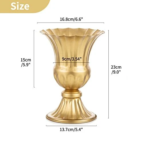 Return Policy Fast Delivery Trusted seller Gold Vases for Centerpieces Wedding - 2 Pcs 9in Height Metal Urn Planter Elegant Wedding Centerpieces for Tables - Trumpet Vase for Weddings Party Decoration Centerpiece Table Decorations Product Description PACKAGE INCLUDES: 2× 23cm/9 inches height wedding centerpieces vase. The base diameter is 13.7cm/5.4", and the inner opening diameter is 16.8cm/6.6". Flowers are not included. MULTIPURPOSE: Match with flowers and artificial flowers, perfect for wedding table centerpieces, party decorations, and event decorations. Add shine to dull wedding decor, birthday center pieces, and dessert table decorations. EASY TO ASSEMBLE: For safe transportation and easy storage, each flower stand needs to be assembled. Perfect for wedding and party decoration. Show different styles of romance. ADVANTAGE: Our metal compote vases are made of high-quality metal which is anti-rust. Its hollow horn holder goes great together with seasonal fresh flowers or artificial flowers, garlands, and bouquets. FRIENDLY REMINDER: Due to the light and screen difference, the bowl's color may be slightly different from the pictures. It is recommended that you put some stones in the flower pot so that it can be more stable. Shipping Returns Payment Shipping Shipping is FREE to all addresses other than APO/PO boxes in the lower 48 states. All our stock ships from US-based warehouses. Shipped via USPS or UPS (depending on location and package weight) Unless stated otherwise, all orders will ship within 24-72 hours of your payment being processed. Check our feedback to see the great reviews of FAST shipping we offer. Returns Seller does not accept returns Payment We currently accept payment via eBay managed payments only. Once payment is cleared, we will dispatch your shipment within 1-3 business days. Please refer to the "Shipping" tab for more information regarding shipping speed to your destination.
