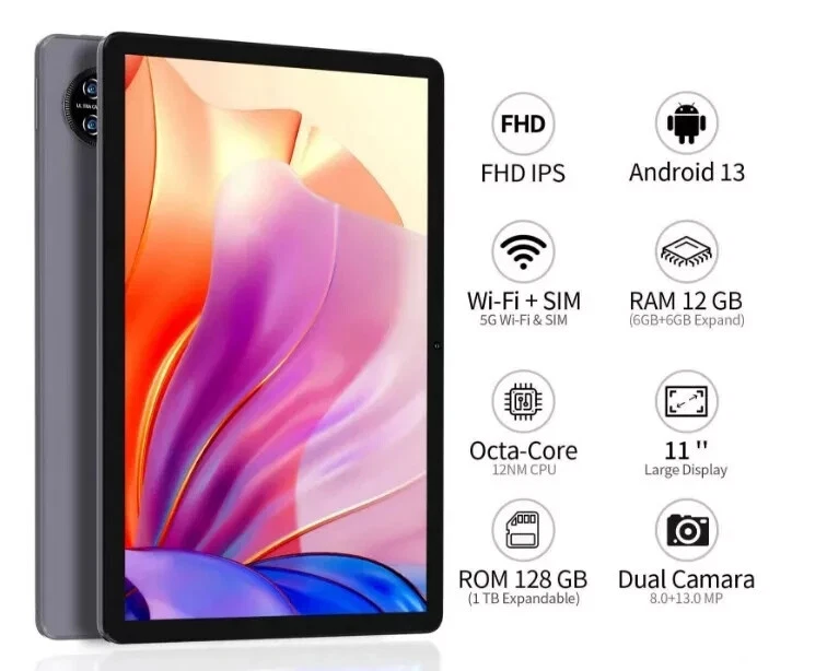 VASOUN TAB15 11 Inch Android 13 Tablet (T606 8-Core 12NM UFS2.1 1.6Ghz/6GB RAM/128GB Rom Supports 1TB SD Expansion/ 1920*1200 FHD Incell Screen/4G SIMLTE/5G WIFI 802.11ac/BT 5.0/8000mah/Type-C/8mp+13mp Camera/ With Free Leather Case(No Adapter)