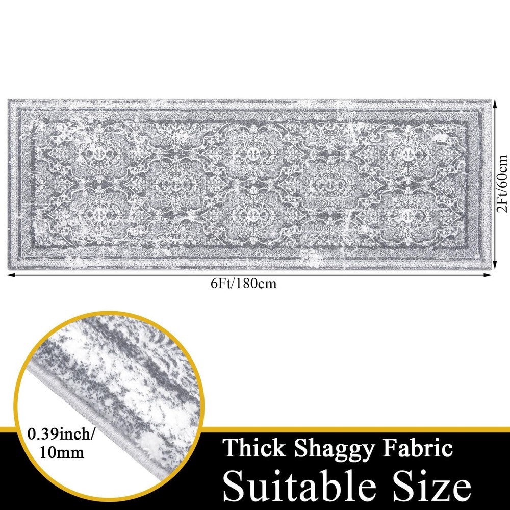Vaukki Hallway Runner Rug, Vintage Shaggy Soft Laundry Rug 2' x 6', Non Slip Boho Entryway Runner Mat, Grey Washable Farmhouse Kitchen Area Carpet Runner for Bathroom, Entryway and Bedroom About The Item: Non Slip Boho Rugs Runner: The boho runner uses premium TPR and cotton non skid backing, which is more slip-resistance than other cotton backings, PVC backings, TPR backings and polyester backings. The long kitchen runner rug is also suitable for pets, which is more durable than other similar runner rugs. And the farmhouse runner rug adopts trendy and cute patterns, which will help you add chic and comfort to your home Farmhouse Hallway Runner Rugs: The laundry runner for laundry room is made of high quality 0.39 inch imitation cashmere fabric materials. It is not easy to shed lints and it is very soft and comfortable. The washable rug runner measures 2 X 6 feet, which can better meet your needs for placing it. The fully machine washable rug is suitable for all types of large and small laundry rooms Machine Washable and Fast Drying: The washable runner rug is very easy to clean. You can toss it into the washing machine, wash it in cold water and hang it to dry or air dry. The runner rug non slip can be dried quickly and adopts newer advanced seaming technology. Our dozens of machine washing tests show that the bohemian runner rug can withstand frequent machine washing without deformation Multiple Uses: The non slip runner rug for entryway is fabulous, which can be perfectly matched with home decorations and accessories. Perfect for various occasions such as in front of the sink, laundry room, parties, bathroom, living room, kitchen, bedroom, entrances, hallways, patio entryway, pet house, and so on. The long runner for hallway is also ideal as a gift for your friends, parents, kids and family Warning and Guarantee: Before placing the carpet for laundry room on the floor, make sure that the ground where it will be placed should be clean, flat and dry. If there is water or dust under the farmhouse runner rug for bedroom, it may cause slippage