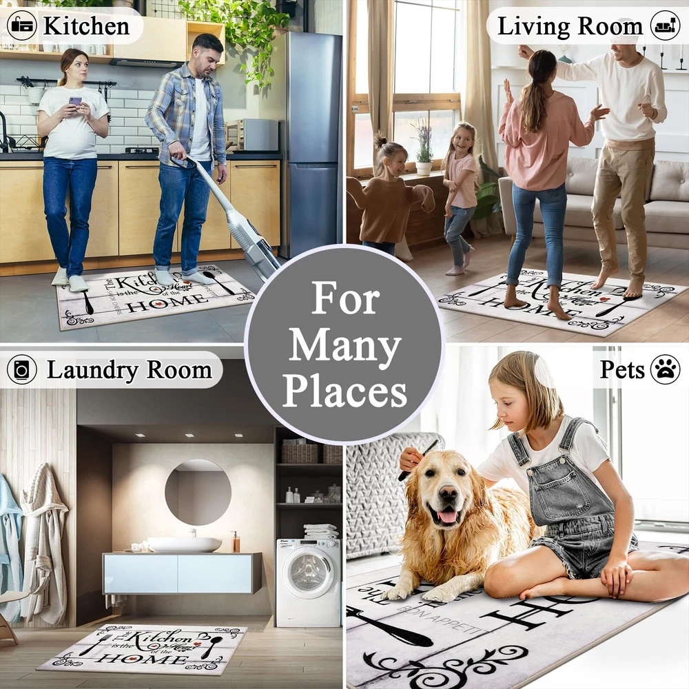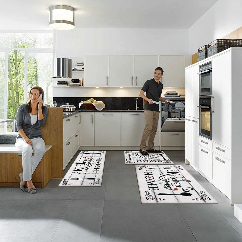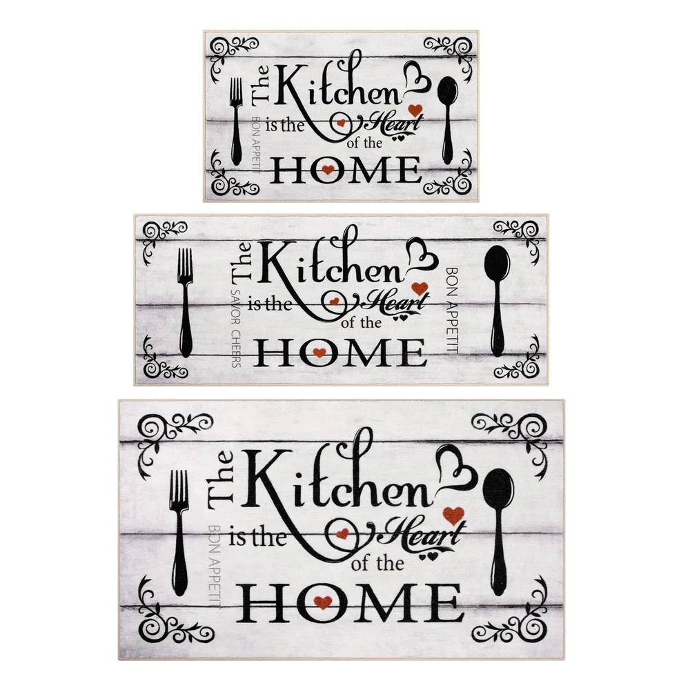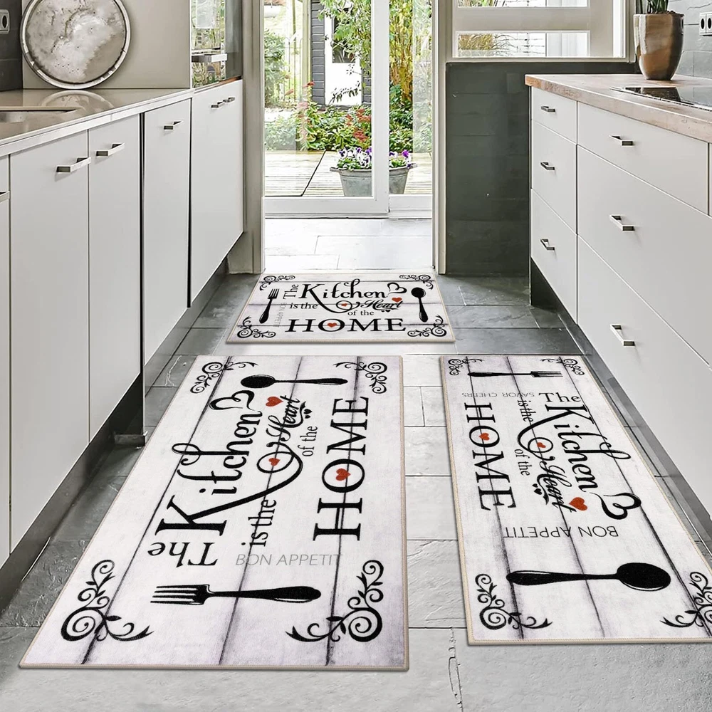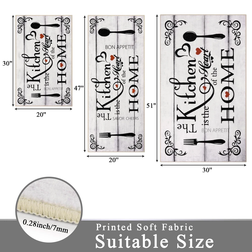Kitchen Runner Rugs Sets 3 Pieces: Vaukki farmhouse kitchen rugs set measures 20''x32''+20''x47''+30''x51'', which can better meet your needs for placing it. The machine washable kitchen rug is suitable for all types of large and small kitchens Soft Kitchen Mats for Floor: The kitchen floor mat set is made of premium polyester fabric materials. The design uses lovely elements and vivid colors to add elegance to any area of the home. The washable kitchen rug uses a classic printing process that does not fade or shrink, protecting your kitchen floor from moisture and stains by keeping it dry and clean No Slip Kitchen Area Rugs: The kitchen floor mats set comes with great TPR and cotton non-slip backing, which makes it effective in avoiding slipping and scratching the floor, and keeps your home clean and dry Multiple Uses: The kitchen runner rug is a good choice as washroom floor mats, laundry room rugs, kitchen rugs, entrance mats, hallway runner rugs, bathroom rugs, nursery rugs. It is also a great gift choice for winter, Christmas, Thanksgiving and New Year Warning: Machine wash the rugs for kitchen in cold water. Use a mild detergent or simply with a vacuum cleaner. Do not bleach or dry clean. Do not use fabric softeners or dry cleaners. Protect from exposure to the sun. Do not wring, line dry for best results