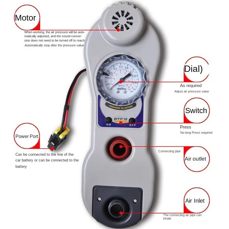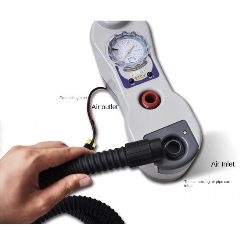 Vehicle-Mountedportablefor Boats Dc 12V Electric Air Pump Marine Inflatable Boat/sofa/bed/swimming Pool Inflatable Boat Pump Details [product number] : BTP12 [input voltage] : DC:12V [maximum atmospheric pressure] : 15PSI, the pressure is set by itself, and it will automatically stop when it reaches the set pressure [rated airflow] : 500L/min [product weight] : 2.4kg [product features] : 1, 12V positive and negative battery clip 2. Set the pressure by itself (1-15 psi), and stop automatically when the set pressure is reached.The buoy pressure of the assault boat is set at 2.5PSI, and the inflatable keel is set at 3.5PSI 3. It can be charged/pumped 4. 3 converters suitable for different inflatable products 5. The power cord is 280cm long, which is more convenient to operate