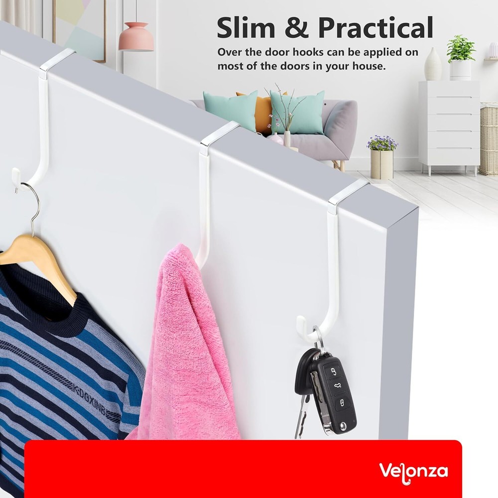 These over-the-door hooks are a game-changer! The sturdy metal construction holds up to 20 lbs, while the rubber coating keeps doors scratch-free. Perfect for towels, coats, or bags—they stay put without slipping. Love how versatile they are for any room, and the clean white finish blends seamlessly. No more cluttered floors or damaged doors! Highly recommend for organized, space-saving storage.