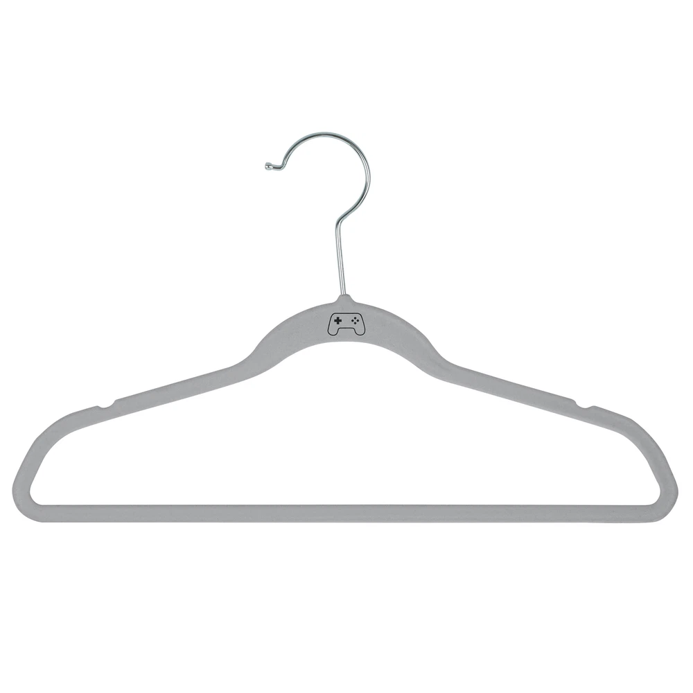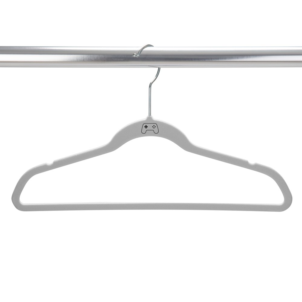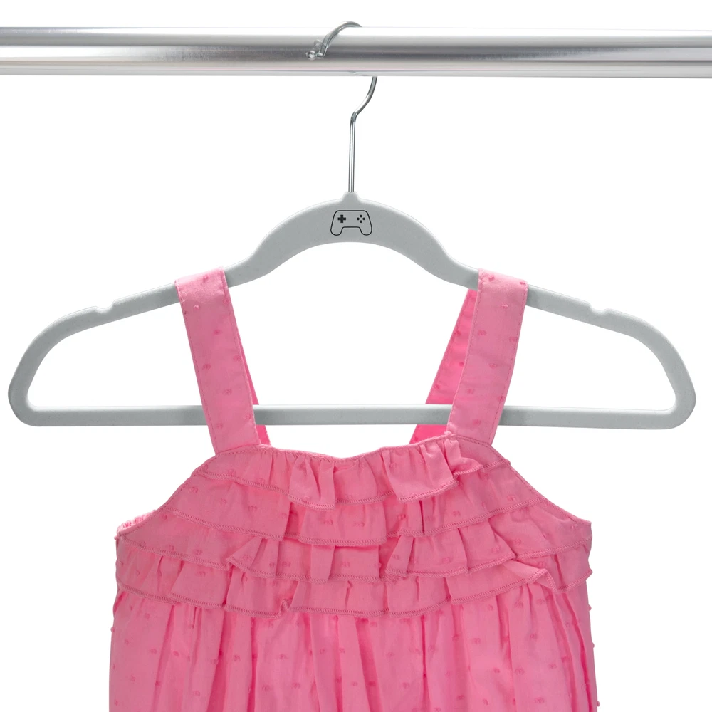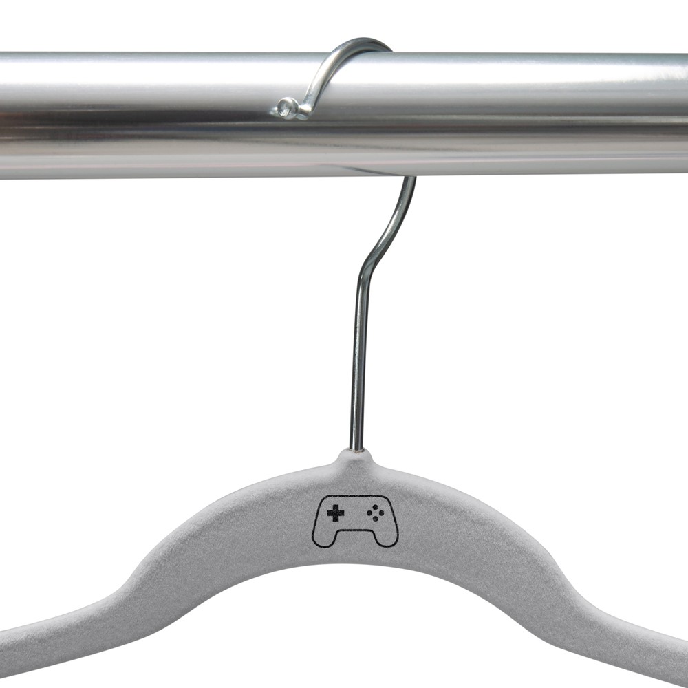 Keep your kids closets organized with the Simplify 25 Pack Kids Velvet Hangers. Coated in smooth velvet material to prevent your clothes from sliding off the hanger. The cool icon on the hanger keeps your closet looking stylish and sharp. The slim design is convenient and helps optimize closet space. It is durable and lightweight, but each hanger holds up to 10 pounds. These hangers are designed to prevent slipping and creasing to help preserve the clothing shape and overall quality. These are a must have for your kid's closet. 25 Pack Velvet Hangers. Flocked Velvet Coating. Prevents Slipping and Creasing. Holds up to 10lbs per Hanger. Gaming Controller Icon on Each Hanger.