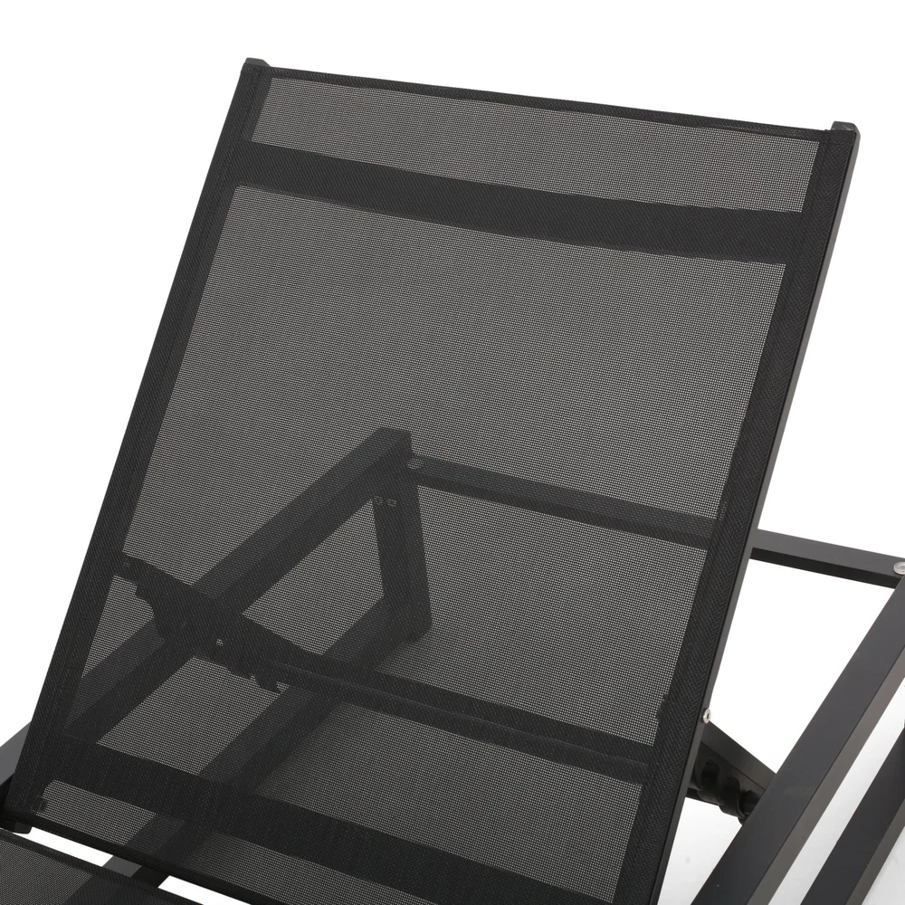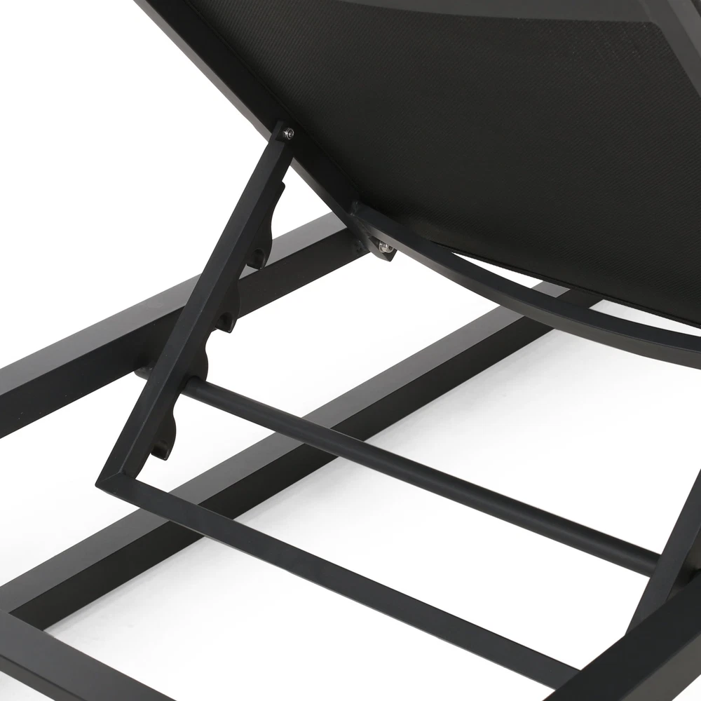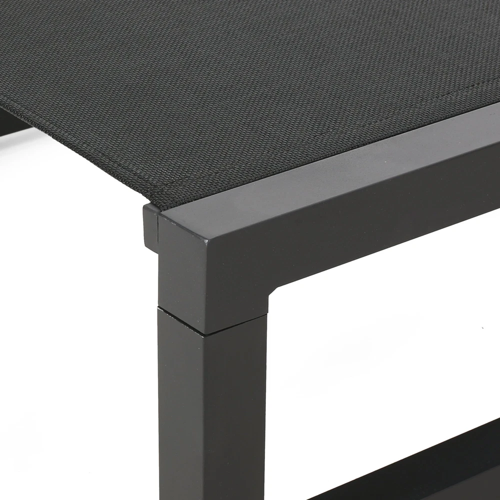 Specifications Place of Origin #originPlace# Main Color Black Main Material Nylon Mesh Dangerous Goods #dangerFlag# Dimensions & Weights Assembled Length (in.) 77.00 Assembled Width (in.) 26.50 Assembled Height (in.) 10.50 Weight (lbs) 20.61 Product Features Adorn your patio space with a delightful classic chaise lounge set that is fully adjustable, giving you everything you need to turn your outdoor space into a resort. ALUMINUM FRAME: This chaise lounge set is built with aluminum, creating a lightweight and stable frame. This material is rust-resistant which will further extend the life of your product. MESH SEATING: This features seating constructed of outdoor mesh material, making our chaise lounges both flexible and supportive. This lightweight material allows air to circulate and ventilates body heat on a hot day. ADJUSTABLE: Our chaise lounge set offers adjustable seating to ensure maximum comfort. This chaise accommodates five different positions, including a fully reclined option. DIMENSIONS: Choose an accessory that is the perfect size for you and your furniture. Each chaise lounge is 77.00” W x 26.50” D x 10.50” H and can open up to 77.10” W x 26.70” D x 34.25” H. You will love how much your space can transform with the simple addition of this charming lounge set. ASSEMBLY REQUIRED: Some assembly is required for this chaise lounge. All of the instructions and tools needed for assembly are included. Hand-Crafted Details Dimensions: 77.00 inches deep x 26.50 inches wide x 10.50-34.25 inches high Weight Capacity: 300 lb Description