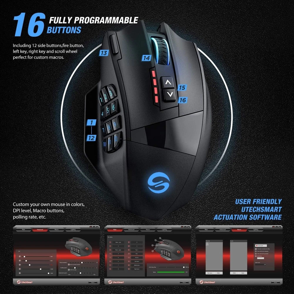 Venus Pro RGB Wireless MMO Gaming Mouse, 16,000 DPI Optical Sensor, GHz Transmission Technology, Ergonomic Design, 16M Chroma RGB Lighting, 16 programmable Buttons, Up to 70 Hours 【Extensive Fully Programmable Buttons】16 customizable buttons can improve your gaming skills and performance by complex custom button macro coding of reconfiguration and assignment. The button custom function combines multiple keys into one button that reducing your arsenal of spells (actions) and response time. 12 of 16 thumb grip programmable buttons were designed by different inclination angles to fit for your thumb tip to click. 【Dual Modes with Ultra-Speed Wireless Technology】 VENUS Pro RGB Wireless MMO Gaming Mouse is a new revolution of RGB MMO gaming mouse. It has GHz data transmission technology with Mini signal receiver(Nano) and stable 1. 5m wire transmission that provides professional-level performance. VENUS Pro overcomes the traditional limitation of wireless latency and connectivity which offers stable and fast data transmission with 10-meter reception boundary. You can take this mouse anywhere! 【Endurable Battery Life】 Venus Pro Wireless RGB MMO gaming mouse has special auto sleeping mode and low power consumption mode or extending the battery life of wireless mode. Large battery (1000mA) capacity which offers to recharge over 300 times and single 2 hours fully charge. The wireless mode lasts up to 70 hours that fulfill your long-time gaming experience. Moreover, actuation software provides battery specify consumption monitoring for you. 【Customizable Mouse High Precision Optical Sensor】Thousands of customers and professional gamers have tested and verified its function. Venus Pro has an custom PixArt PMW3335 ultra-accurate Optical sensor. Up to 16000 DPI with 5 DPI switchable stages and 1000 Hz polling rate that offers you an incomparable MMO and FPS gaming experience. The huge adjustable DPI range from 100-16000 comes with user-friendly software that can perfectly tweak the performance of mouse accuracy. 【Ergonomic Design Ensures Your Comfortable】Great as a real mouse stuck in your hand. The Venus Pro Wireless RGB MMO gaming mouse is flawlessly designed to alleviate wrist fatigue while being able to firmly hold the mouse in your hand. The grinding coating on the mouse surface increases the friction between your hand and the mouse. Grinding coating also provides gamer a extra comfortable sweat-resistant and skin-friendly gaming mouse.