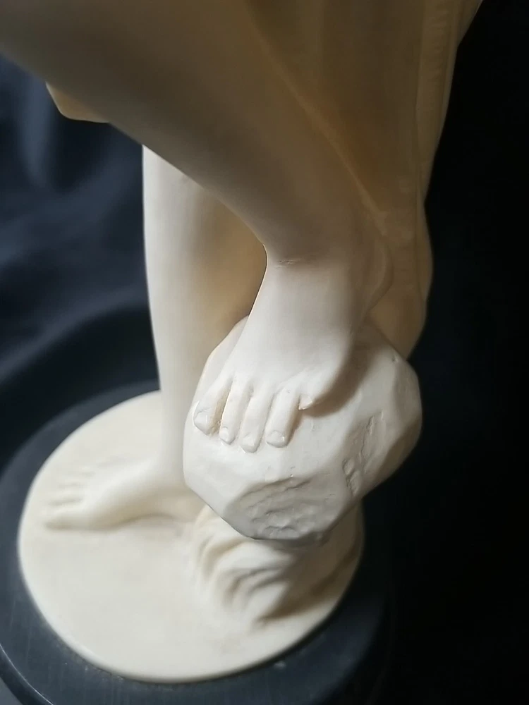 The little toe on the left foot is incomplete. Not noticeable unless closely inspected. No other chips cracks or repairs.